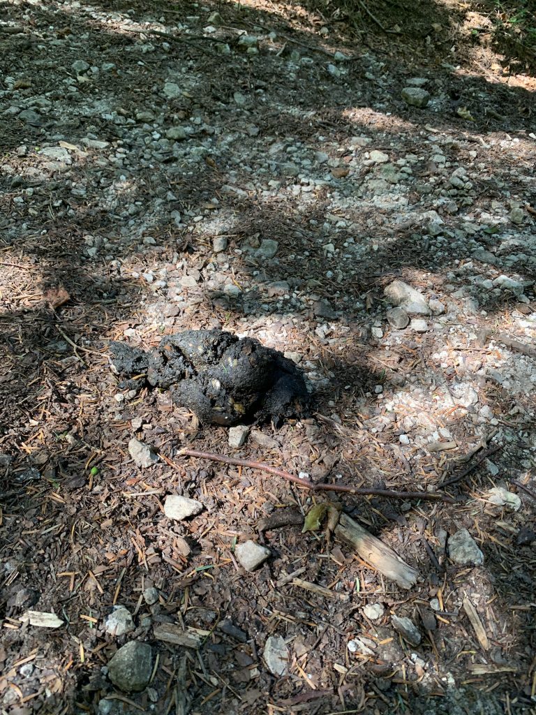 Opazila sva tudi medvedji iztrebek, zato je pomembno, da smo kar se da glasni. Medvedje se načeloma ljudi izogibajo, je pa nevarno, če imate kakšno raziskovalno pasmo psa, da je raje privezan oziroma pod nadzorom, saj najpogosteje ravno pes pripelje medveda h gospodarju.