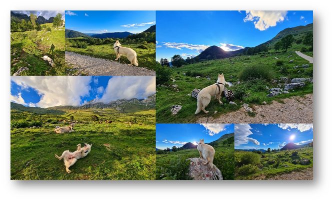 Po poti dol nas je – povsem pričakovano – grelo in žgalo sonce, ampak ker je pihal veter, kakšne hude vročine ni bilo čutiti. Art je imel jezik do tal, kljub večim postankom, da je lahko pil. Nekajkrat se je tudi sam ustavil in legel v travo ob poti. Seveda, bil je utrujen od celega tedna hribolazenja, in potem ga ta njegova zmešana Klavdija za češnjo na vrhu smetane še na Krn vleče! Ampak je užival in mi večkrat hvaležno dal slinastega »lupčka«.