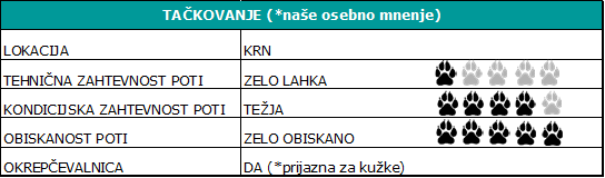 • Je pa zato kondicijsko toliko bolj zoprna, tako za nas kot tudi za naše pse. Dolga je. Brez sence in brez zavetja pred vetrom. Tabla na izhodišču pravi »3h 30min« in nama je uspelo v tem času. Sem pa mnenja, da spočitemu in kondicijsko dobro pripravljenemu planincu uspe še kakšno uro prej. Komu, ki ni vajen, ali ki hodi bolj počasi, pa vzame še dlje. O tem presodite sami.