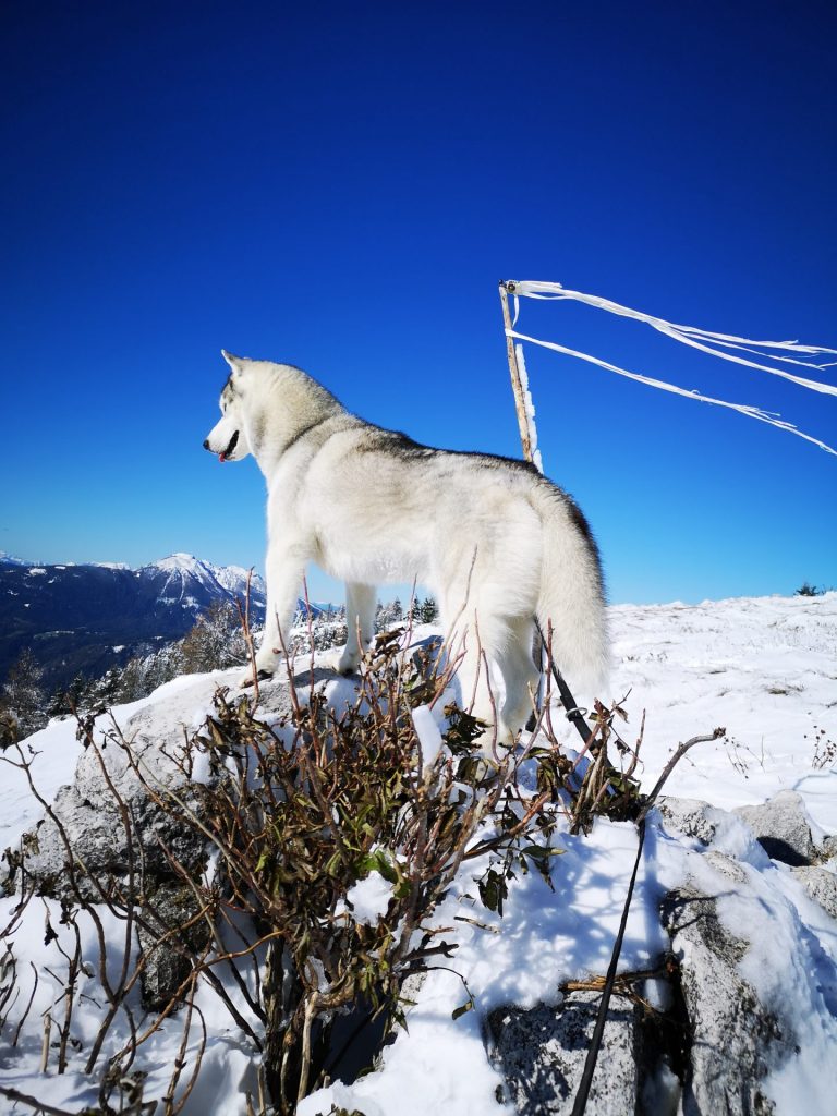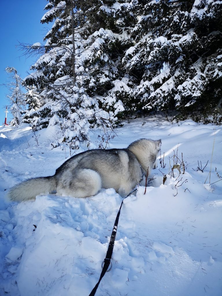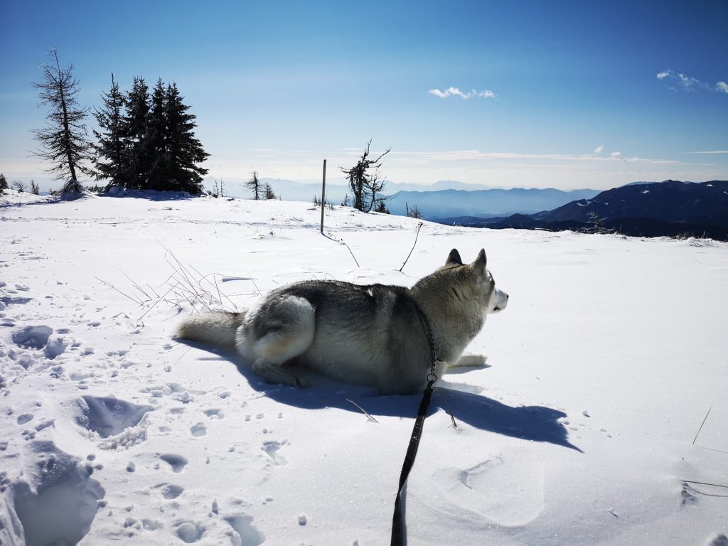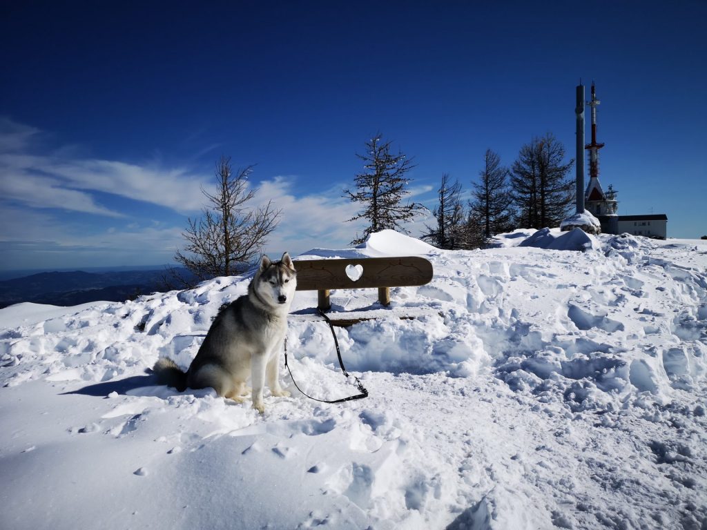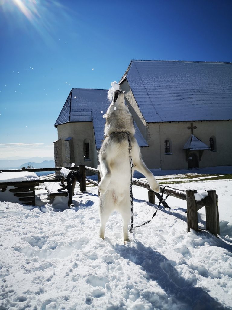 Uršlja gora ali Plešivec, visoka 1699m je razgledna gora med Slovenj Gradcem in Črno na Koroškem. Na vrhu oziroma malo pod njim stoji cerkev Svete Uršule, ki je najvišje ležeča cerkev v Sloveniji. Iz vseh strani vodi na vrh štirinajst, po težavnosti in dolžini različnih poti. Vse poti so primerne za pse, nekatere mogoče ne za manjše kužke, absolutno pa za ljudi vseh starosti. Z Ran-om greva najraje iz Ivarčkega jezera po Železarski poti ali iz Naravskih Ledin, katero opisujeva v tem blogu. Pripeljala sva se do Naravskih Ledin, višina 1072m. Takoj ko stopiva iz avta, Ran skoči direktno v sneg. To je bilo veselje!