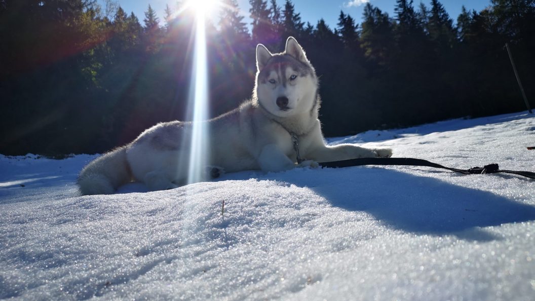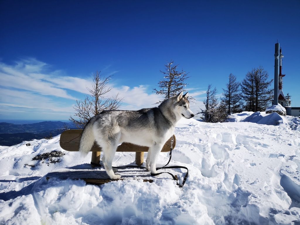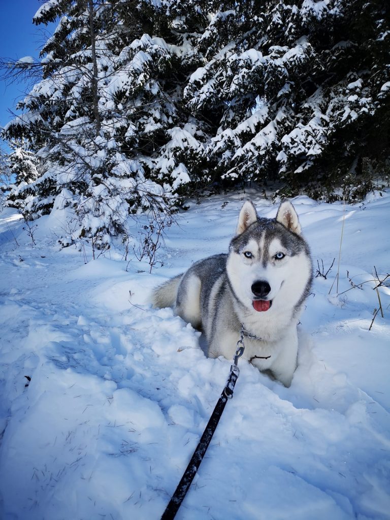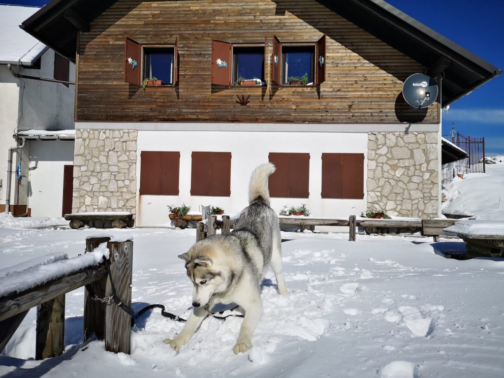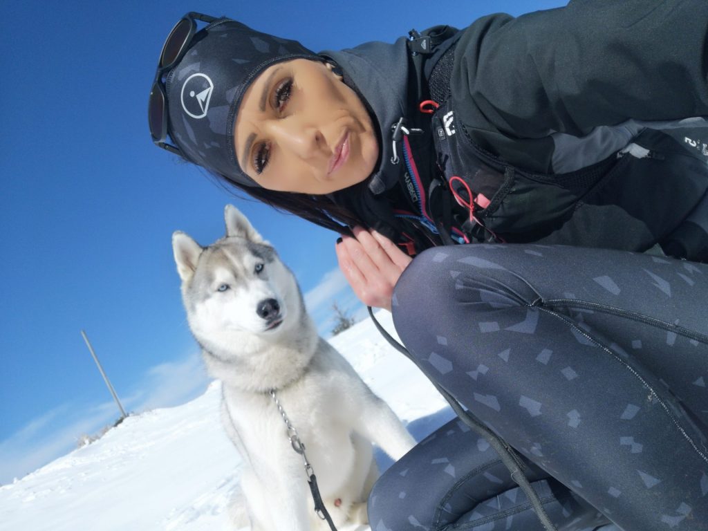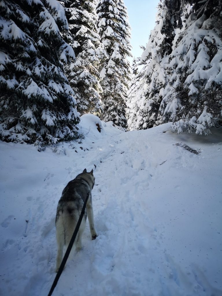 Uršlja gora ali Plešivec, visoka 1699m je razgledna gora med Slovenj Gradcem in Črno na Koroškem. Na vrhu oziroma malo pod njim stoji cerkev Svete Uršule, ki je najvišje ležeča cerkev v Sloveniji. Iz vseh strani vodi na vrh štirinajst, po težavnosti in dolžini različnih poti. Vse poti so primerne za pse, nekatere mogoče ne za manjše kužke, absolutno pa za ljudi vseh starosti. Z Ran-om greva najraje iz Ivarčkega jezera po Železarski poti ali iz Naravskih Ledin, katero opisujeva v tem blogu. Pripeljala sva se do Naravskih Ledin, višina 1072m. Takoj ko stopiva iz avta, Ran skoči direktno v sneg. To je bilo veselje!