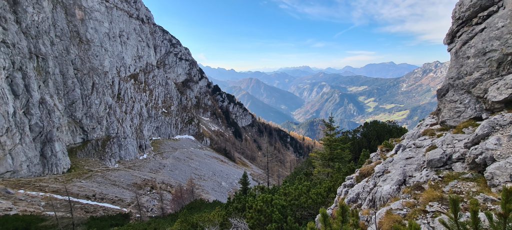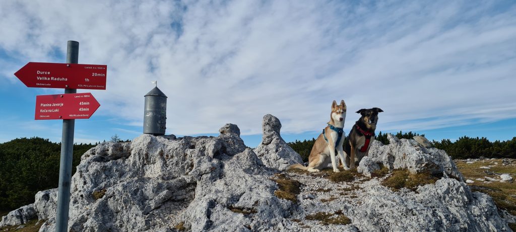 Skrajšala sva povodce, umirila haskico, saj so jo plošče starega snega na poti čisto preveč navdušile 😄. Brina je v tej poti že izkušena in pozna sistem, za dobro leto staro Ario, pa so pobočja Raduhe nova in noro razburljiva😄. Lepo urejena pot se je ponovno strmo vzpenjala med ruševjem.
