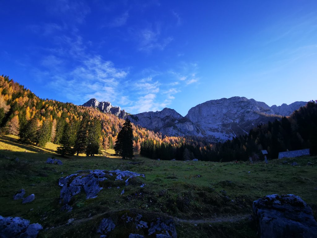 Tam sva parkirala, obula pohodniške čevlje in odpravili smo se po cesti, proti Koči na Grohatu. Po cca 100 m smo zavili z makadamske ceste na simpatično, položno gozdno pot. Vmes smo prečkali par strmih predelov, kjer so nam bili v pomoč leseni mostički oz. lestve, kar pa zna predstavljati težave za določene pse… Tisti bolj spretni lahko gredo tudi okoli, naši dve sta z malo prigovarjanja šli sami čez, manjše se seveda lahko tudi nese. Po dobre pol urce smo prečkali pašno ograjo, pripeli psički na povodca in kmalu prišli iz gozda do Koče na Grohatu (odlična destinacija za malico, kosilo ali samo okrepčevalni štrudelj ob povratku), odprl pa se nam je pogled na Lanež na levi in desno Mala Raduha.