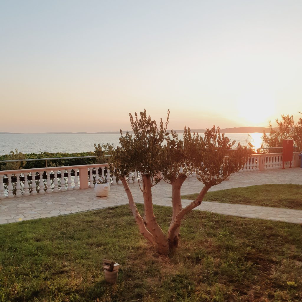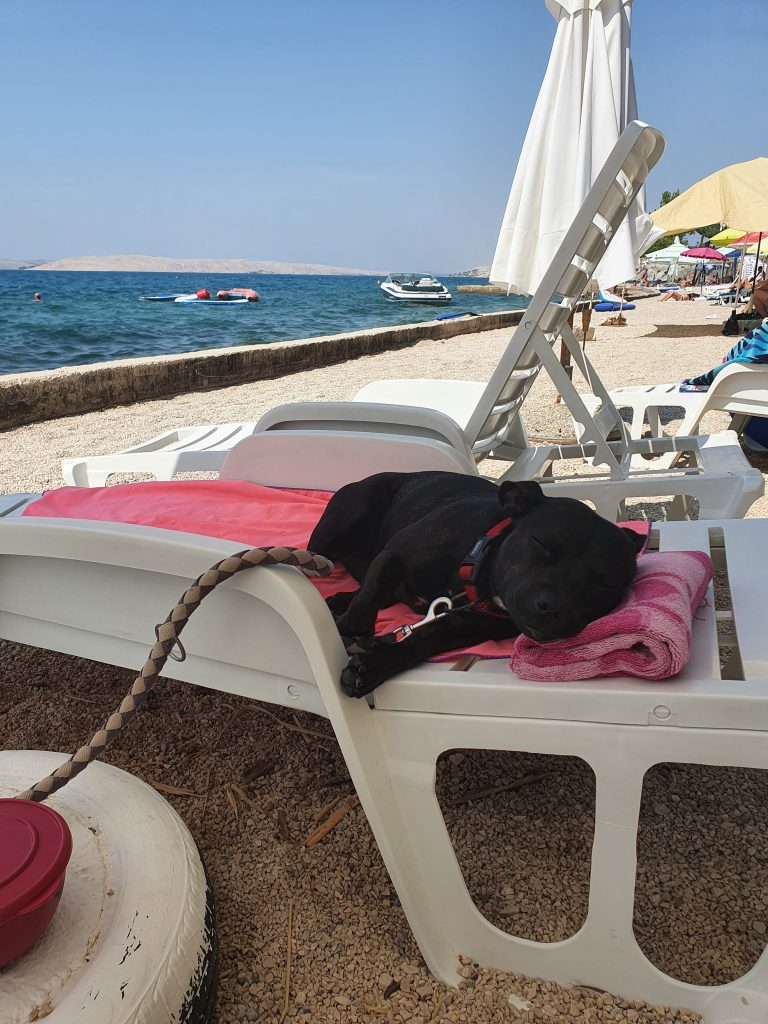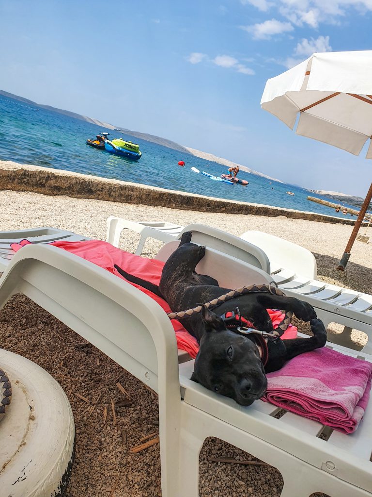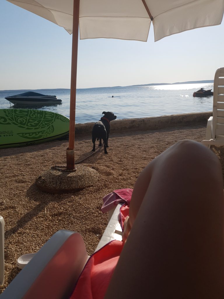 Nastanitev je dobesedno na plaži, do nje vodi 20 stopnic. Vsaka soba ima svoj ležalnik in senčnik, kar je že všteto v ceno. Sobe so lepe in klimatizirane ter vsakodnevno počiščene. In seveda, kuža lahko gre na plažo in se tudi kopa (sama sem gledala, da se je kopala, ko je bilo najmanj kopalcev). V času večerje in zajtrka je najina psička lahko sedela pod mizo. Gostje so bili večino starejši nemški pari in slišala nisva niti ene pripombe glede psičke, ki si je izborila celo svoj ležalnik.