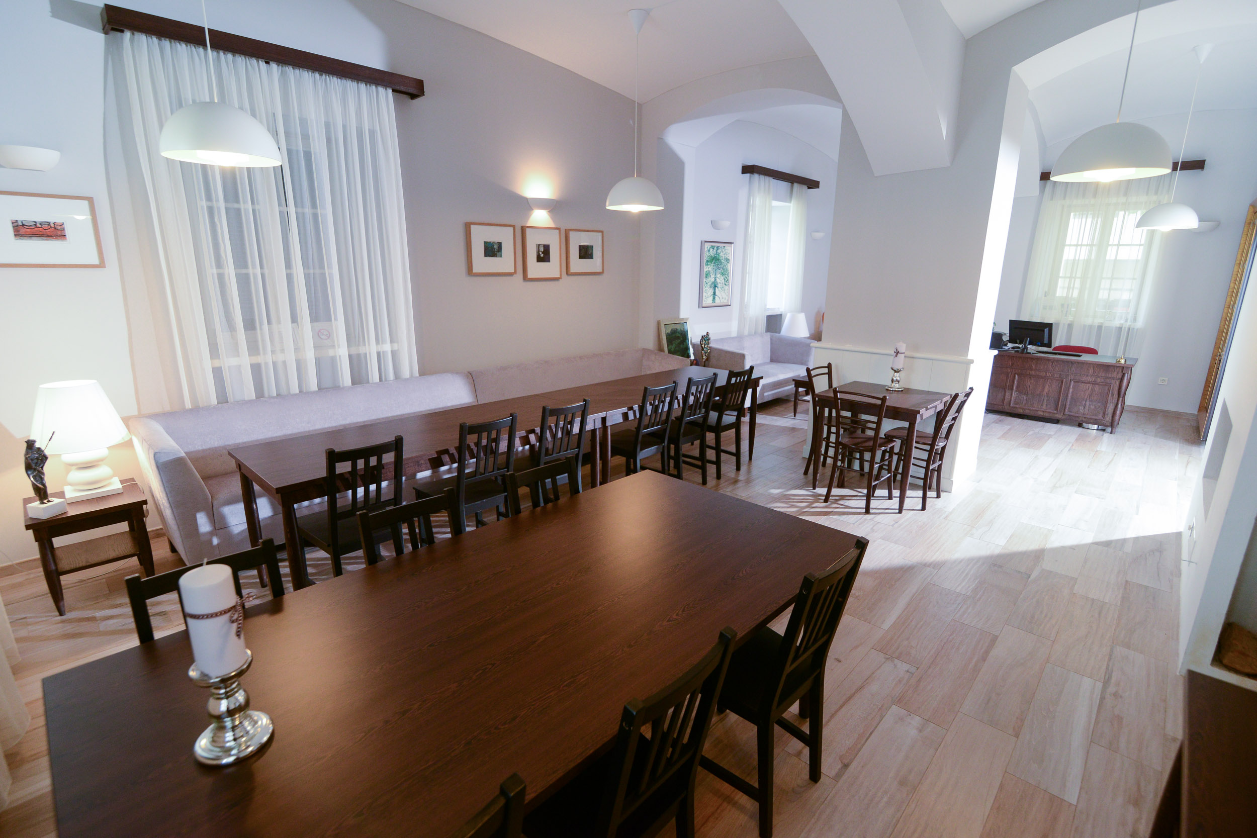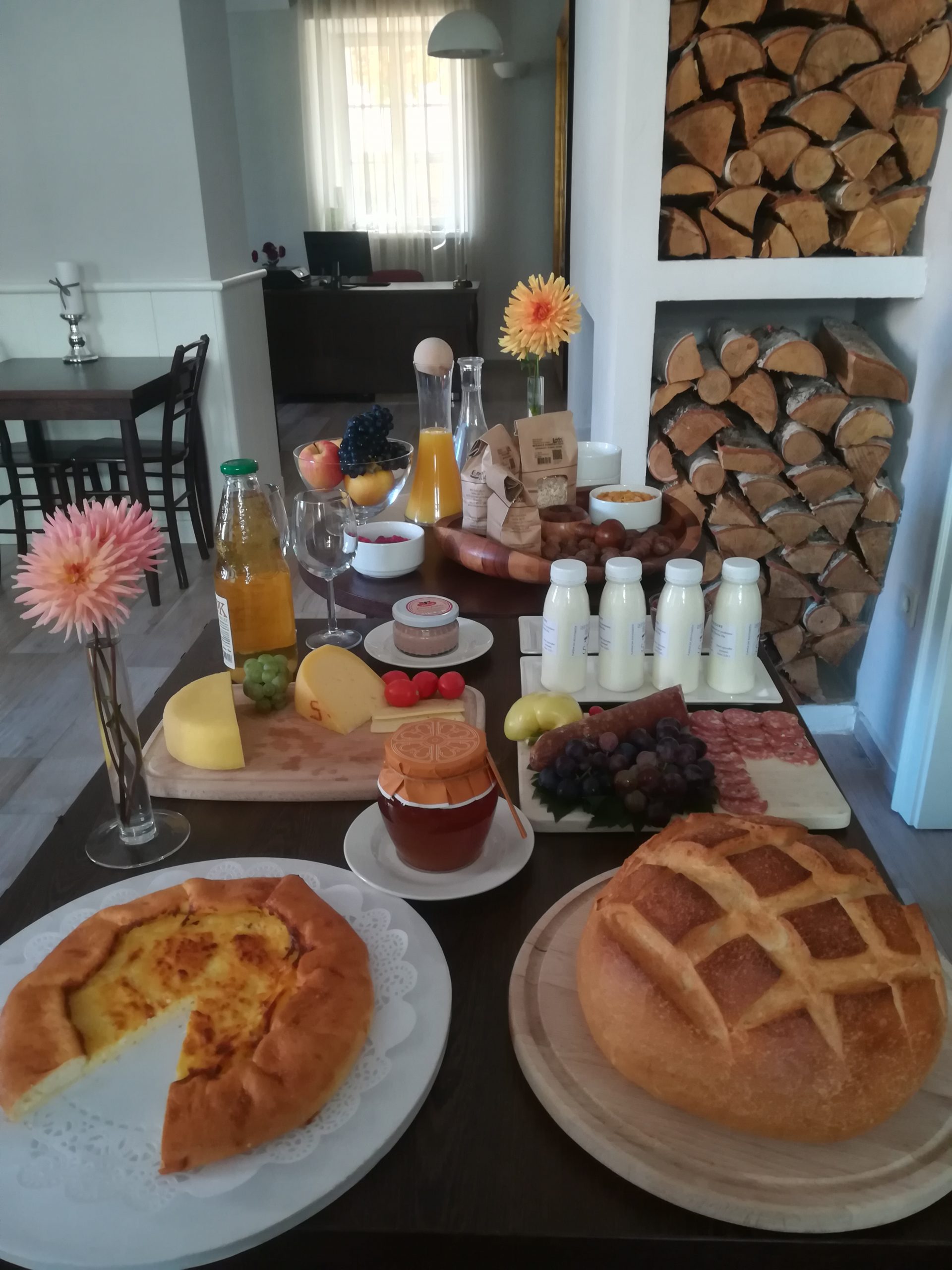Zajtrkovali boste pod obokanim stropom zajtrkovalnice, kjer v hladnih jutrih zakurijo kamin, da zadiši po lesu. Zajtrki so bogati in zdravi, iz skrbno pripravljenih sestavin: sveže sezonsko sadje in zelenjava pridelana na okoliških kmetijah, mesnine in mlečni izdelki okoliških kmetij, domača marmelada in med, svež kruh in pecivo.