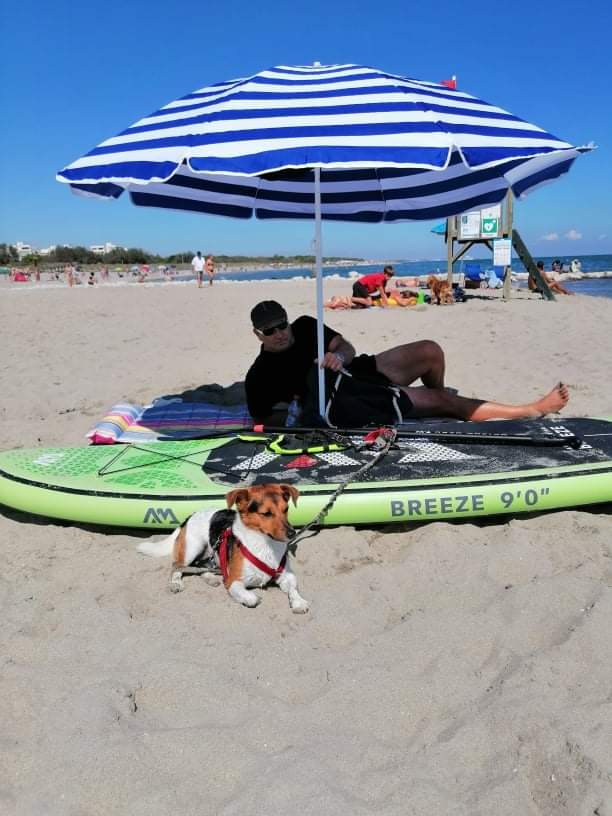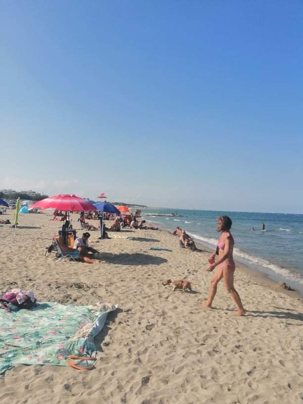 Pred najinim apartmajem je bila pasja plaža brezplačna, le da sence ni, zato je priporočljivo da si prineseš senčnik. Zraven te plaže je bila tudi plačljiva pasja plaža, na kateri je vsak pes imel svoj prostor, lastnika pa dva ležalnika, pitna voda in pasji tuš. Koši za pasje iztrebke so vsakih par metrov.