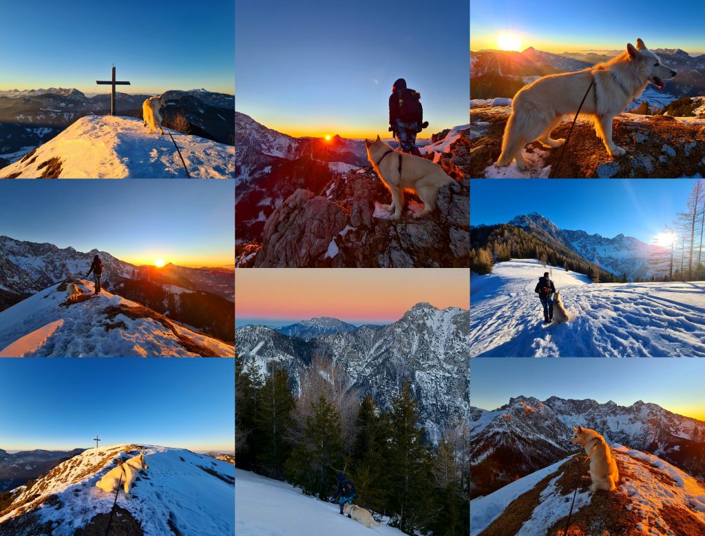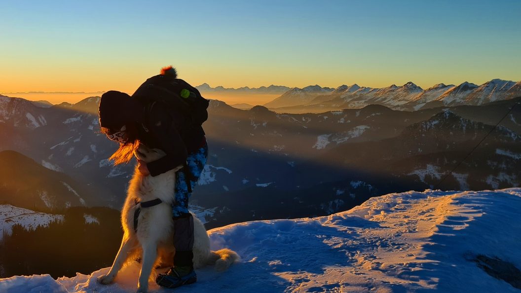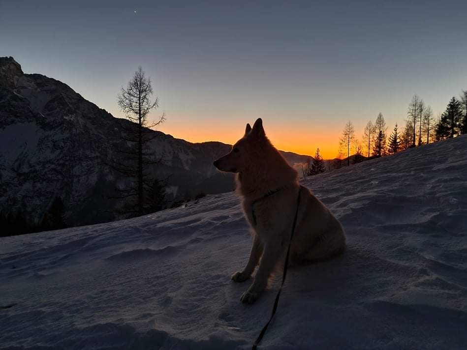 Pred leti najino prvo osvojeno goro, Goli vrh na Jezerskem, v letnih razmerah že precej dobro poznava. Pot sva spoznavala tudi v snegu, ampak nama lani zaradi prevelike odjuge in zato nevarnih razmer ni uspelo do vrha. Pa sem se odločila, da letos spet poskusiva … in tokrat je uspelo. Pa še prelep sončni zahod smo imeli na vrhu, kar je pa odtehtalo veter, ki nas je skoraj odpihnil nazaj v dolino.