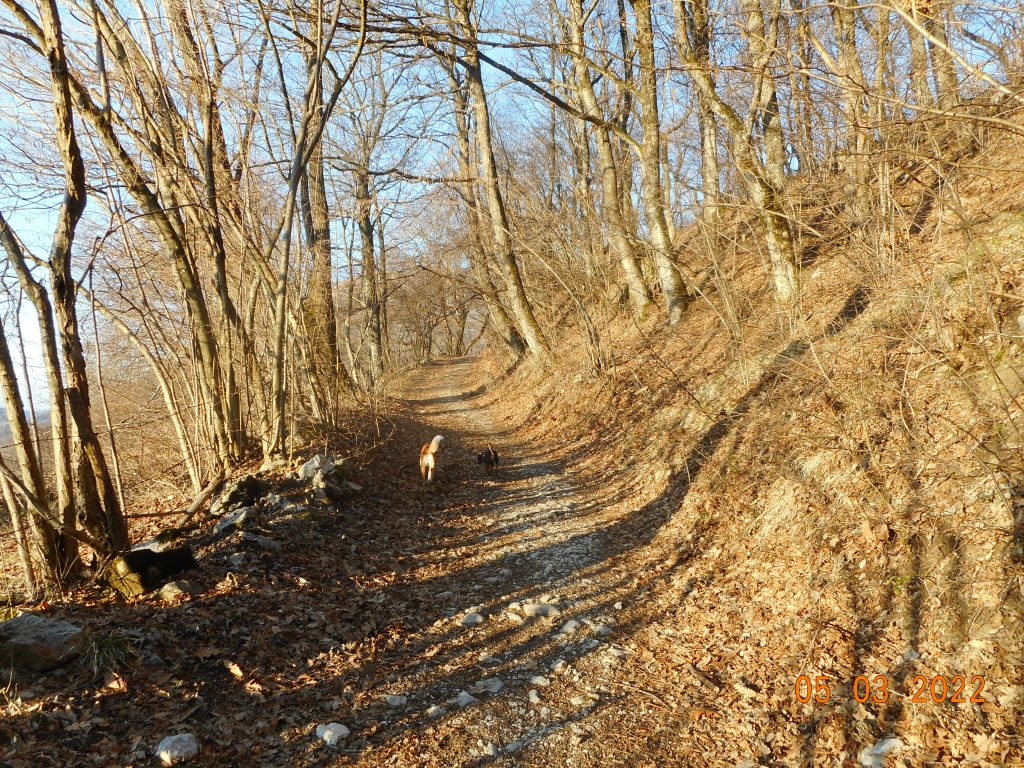 Višje je kolovoz prešel v strnjen gozd, ki nas je pripeljal tudi do studenčka. Nato smo prišle do razpotja, kjer smo šle desno, do cerkvice Svetega Brica. Od cerkvice smo se vrnile nazaj do razpotja in nadaljevale pot v smeri Nanosa. Pot se je nato prečno vzpenjala, prečila pa je nekaj strmih pobočij. Kmalu od razpotja je bil tudi sneg, pot je bila nekje tudi poledenela in je bilo treba paziti na vsak korak. Prav tako je proti spodnjemu delu poti, vedno bolj pihal veter (burja). Kasneje se je v desno odcepila označena pot na Suhi vrh, ki pa je imela že debelejšo snežno odejo.