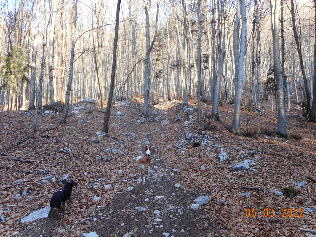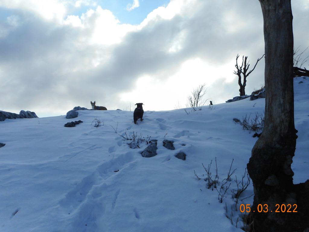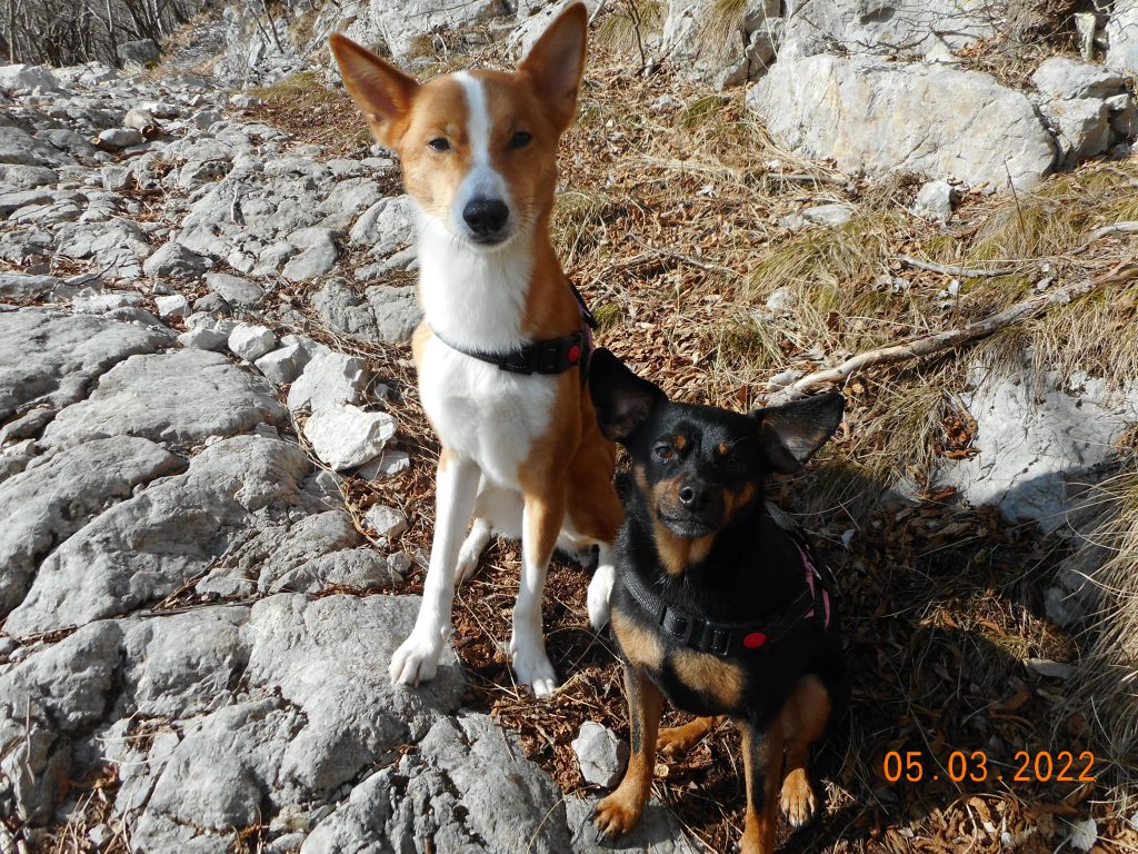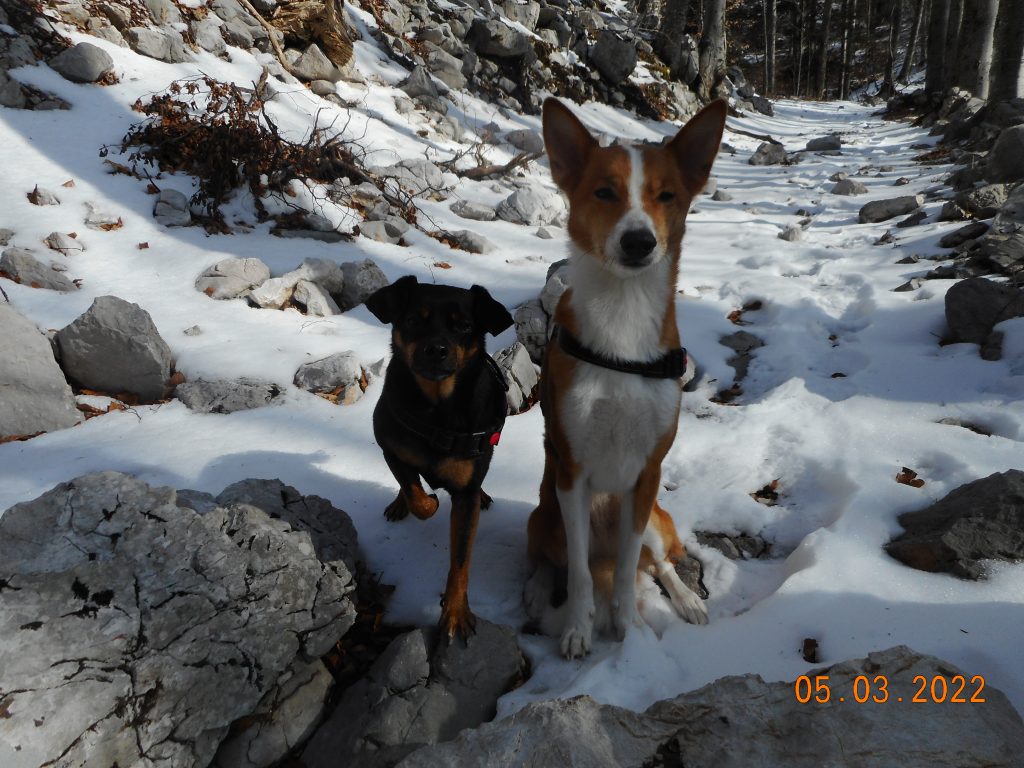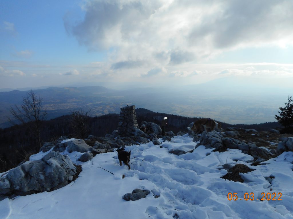 Tik pred vrhom smo opazile tudi bivak. Na vrhu pa je bilo zelo mrzlo, saj je močno pihalo (močna burja). Ponavadi Gajo in Kano slikam na vrhu – cilju, tokrat pa to ni bilo mogoče, saj je tudi njiju, tako kot mene, močno zeblo. Tako sem se odločila, da se na vrhu ne bomo zadrževale. Vzela sem samo žig in smo takoj odšle nazaj dol. Tako so njune slike nastale, ko smo se vračale do avta. Moram pa priznati, da je pot drugače zelo lepa in tudi ni strma – vzponi so zmerni.