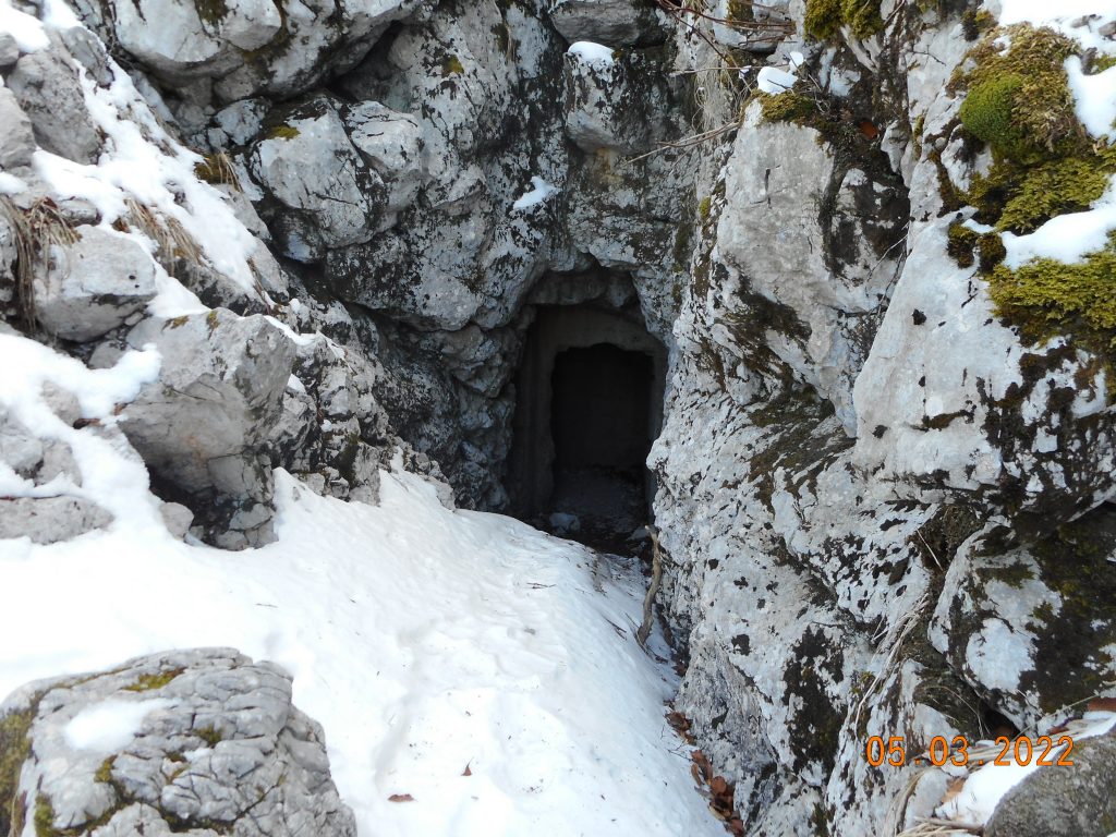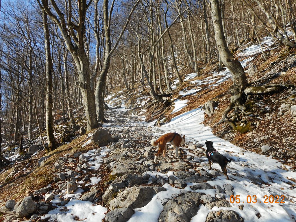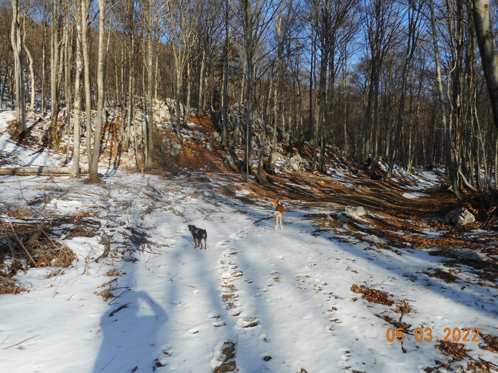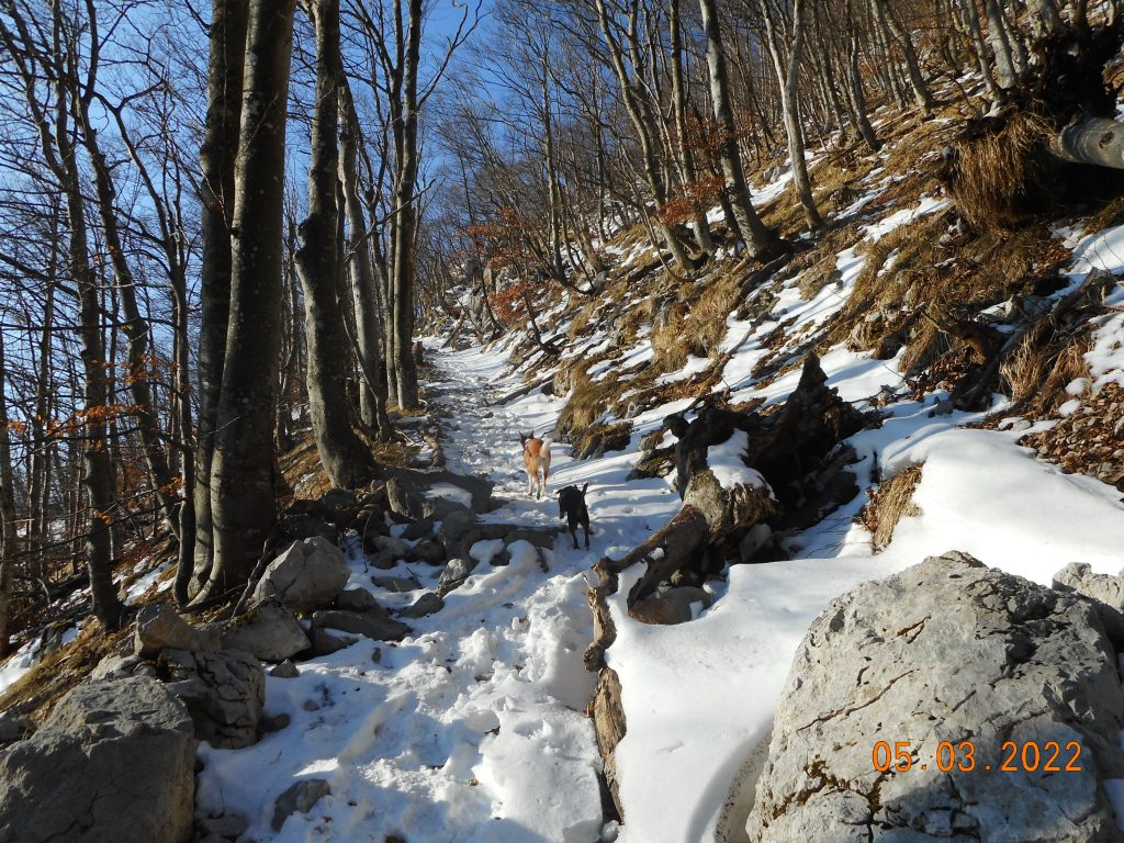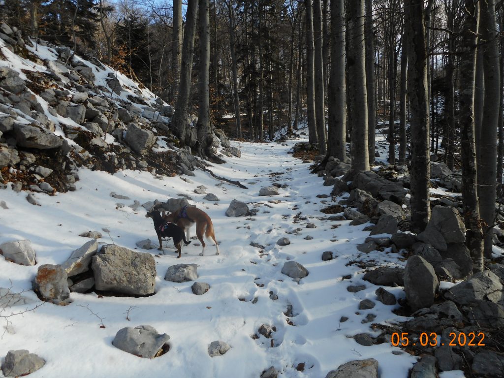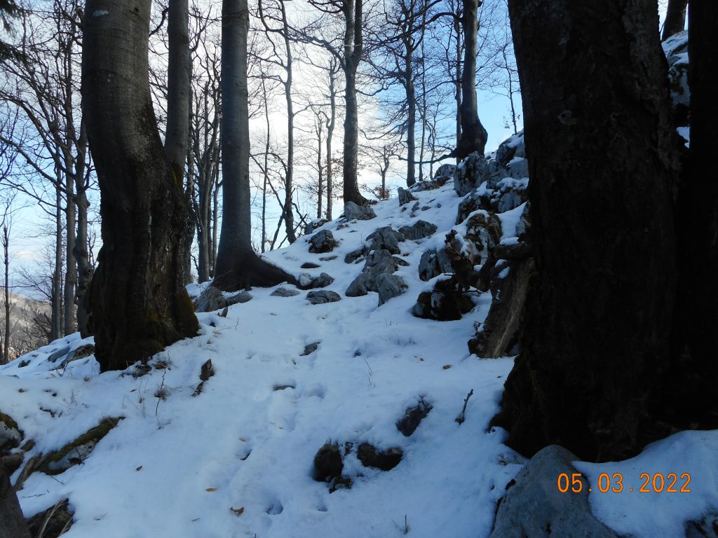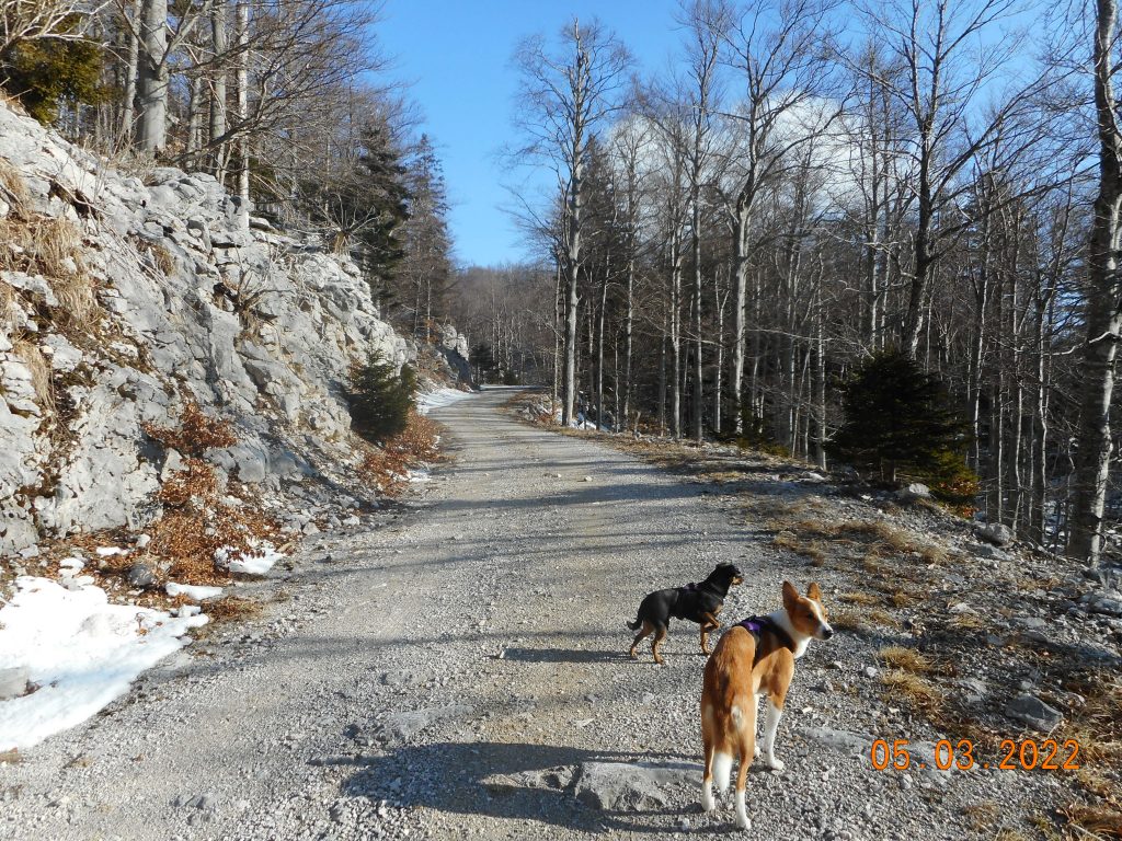 Pot se je za nekaj časa položila. Višje smo prečile gozdno cesto in nadaljevale skozi gozd. Še enkrat smo prečile gozdno cesto, ki nas je kmalu pripeljala do lovske koče. Na srečo je nekdo pred nami že naredil gaz, da smo šle po tej gazi. Glede na to, da je bilo kar nekaj snega, ki se je udiral, sem se odločila, da bomo šle po položni poti do vrha. Tako smo nadaljevale nekaj časa po cesti. Proti koncu pa nas je markirana pot usmerila na bolj strmen vzpon, ki je bil kar naporen zaradi burje in vdirajočega se snega.