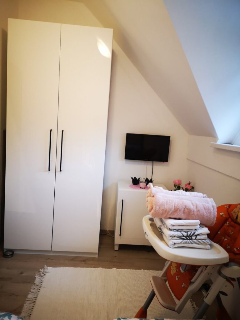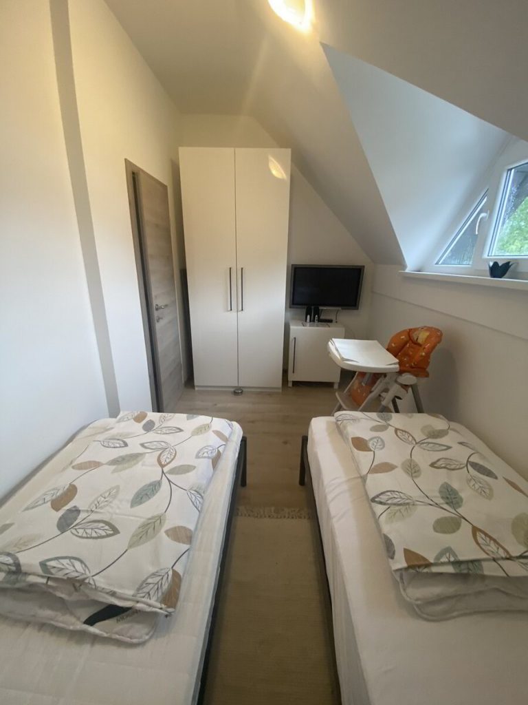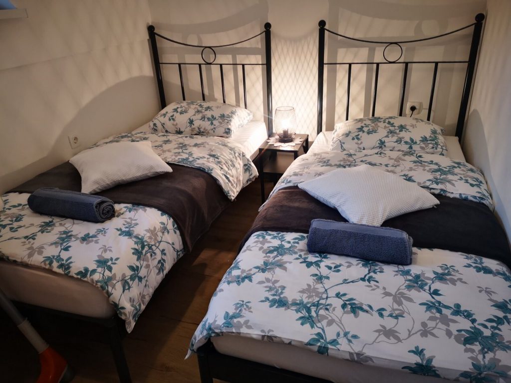 V zgornjem nadstropju sta dve samostojni sobi z udobnimi posteljami. V prvi spalnici se nahaja boxspring postelja za dve osebi, v drugi spalnici pa so tri lezisca. V nadstropju lahko udobno spi pet oseb (1×2 osebi in 1×3 osebi), dodatno ležišče (1-2 osebi) pa se nahaja v pritličju na raztegljivi sedežno spalni garnituri.