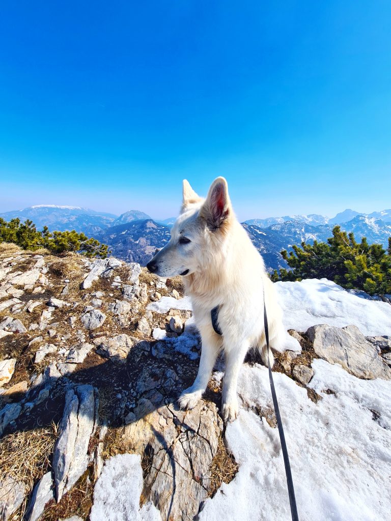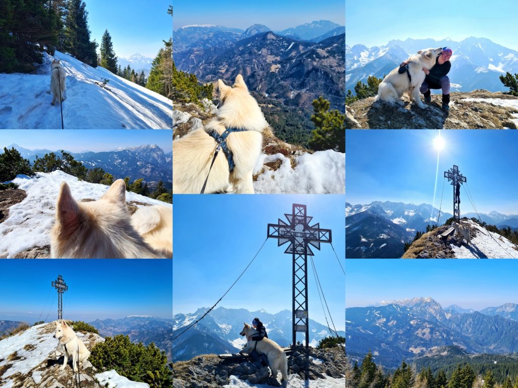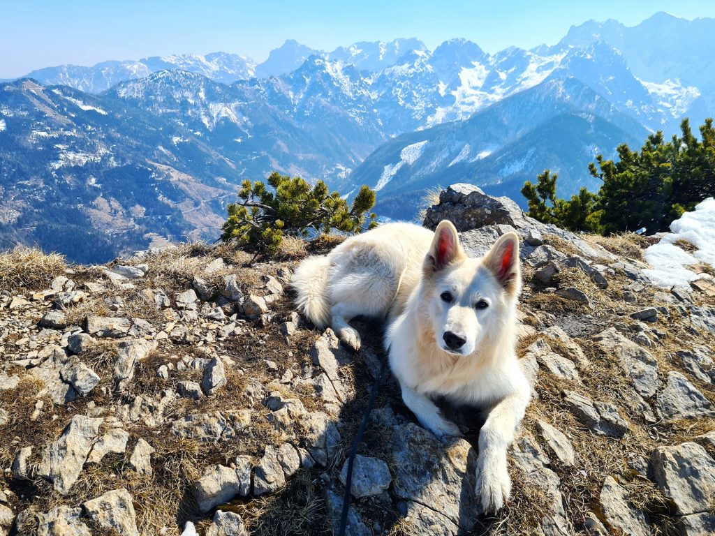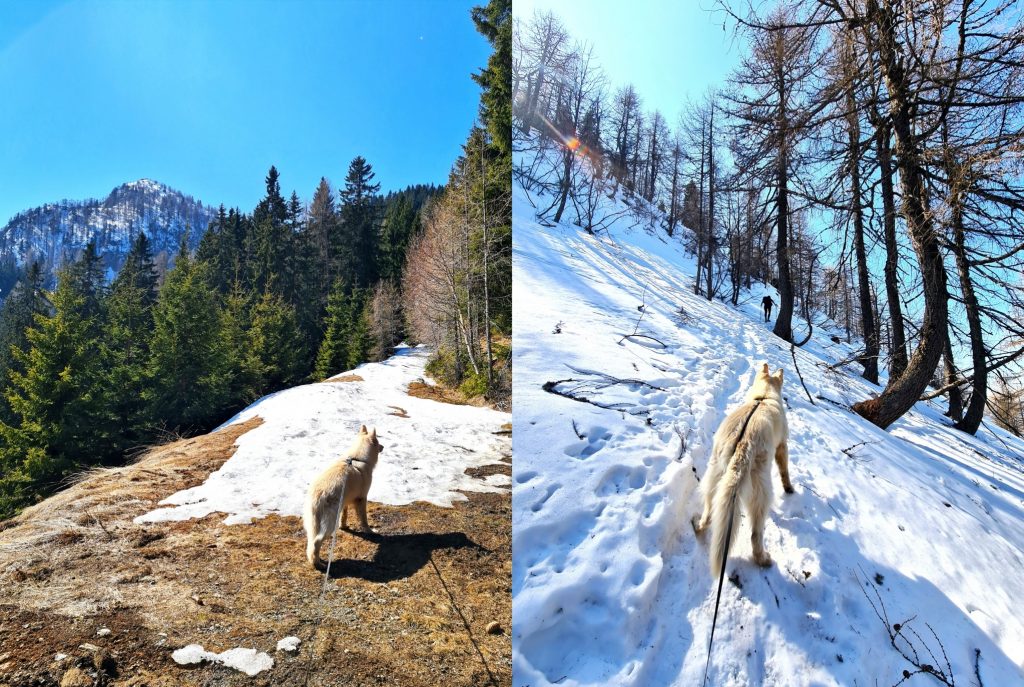 Tokrat pa sem se odločila, da gremo gor po lažji poti, ker sem imela res močno željo, da gre pes z mano. Žal se je pot izkazala za precej bolj naporno od pričakovanega, proti vrhu pa je bilo tudi zelo nevarno za zdrs. V letnih razmerah ni nobenih posebnosti, v tem času (marec), pa je po vrhovih in poteh marsikje še sneg – tako da ja, pričakovana je bila zimska gaz in s tem bolj direktna pot, ampak smo pa nekaj dni prej dobile deloma napačne informacije o stanju in količini snega na sami poti (“ni ga več veliko”), in smo res pričakovale nekoliko drugačne in precej manj naporne in kondicijsko manj zahtevne razmere. V toliko snega na take vrhove Arta načeloma ne vozim s sabo – zaradi najine varnosti in njegovih let. Ampak moram priznat, da je bila tura kljub napornosti zelo lepa, in sem hvaležna, da nam je varno uspelo gor in dol ❤ Očitno se je tudi Art zavedal, da vrhnji del poti v snegu (takoj pod vrhom), ni najbolj primeren kraj za siljenje naprej in je pri sestopu lepo hodil zadaj in mirno počakal, da sem mu dovolila par počasnih in previdnih korakov navzdol, preden sem se sama spet premaknila.
