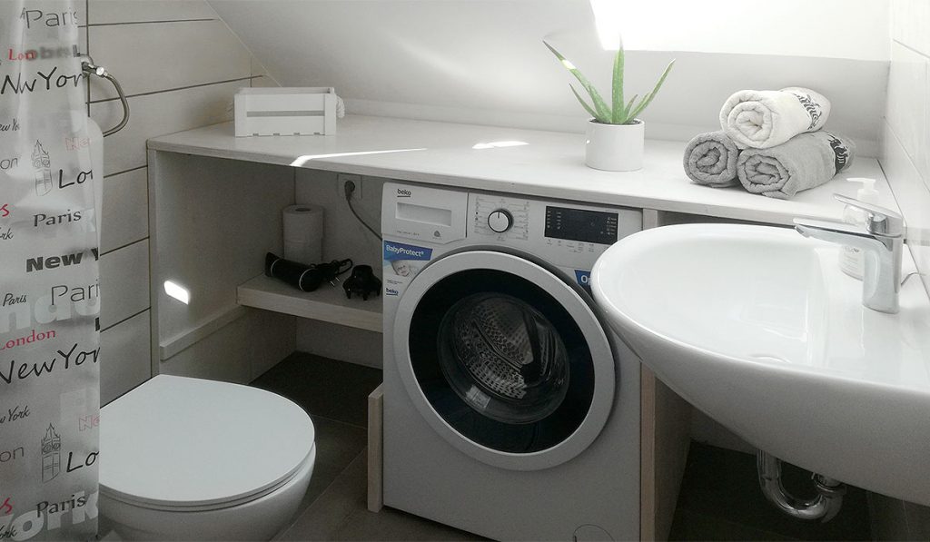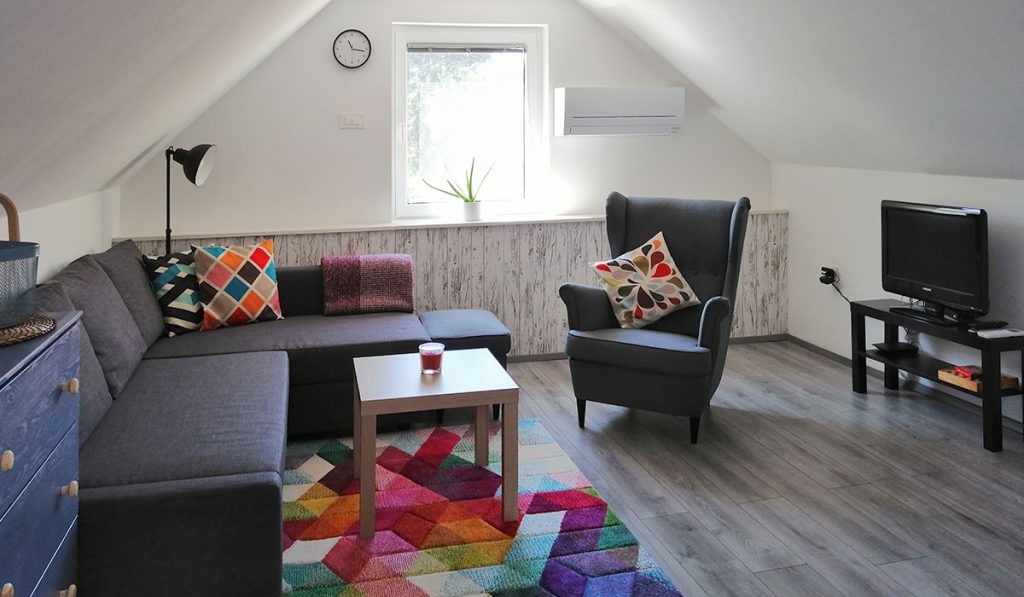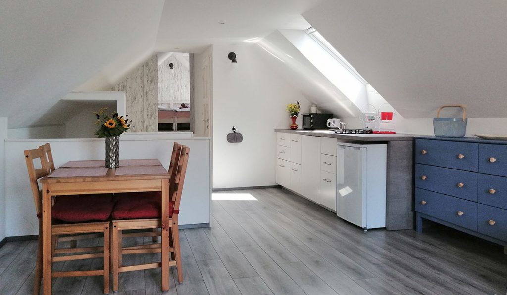V spodnjem nadstropju na novo opremljenega in urejenega apartmaja se nahajata večnamenski prostor s priročno kuhinjo in moderno opremljena spalnica za dve osebi. V zgornjem, mansardnem nadstropju, so sodobno opremljena dnevna soba, še ena kuhinja z jedilnico, manjša kopalnica s pralnim strojem in ločena spalnica z zakonsko posteljo, ki se lahko razstavi v dve ločeni postelji. Dnevna soba ima tudi raztegljiv udoben kavč.