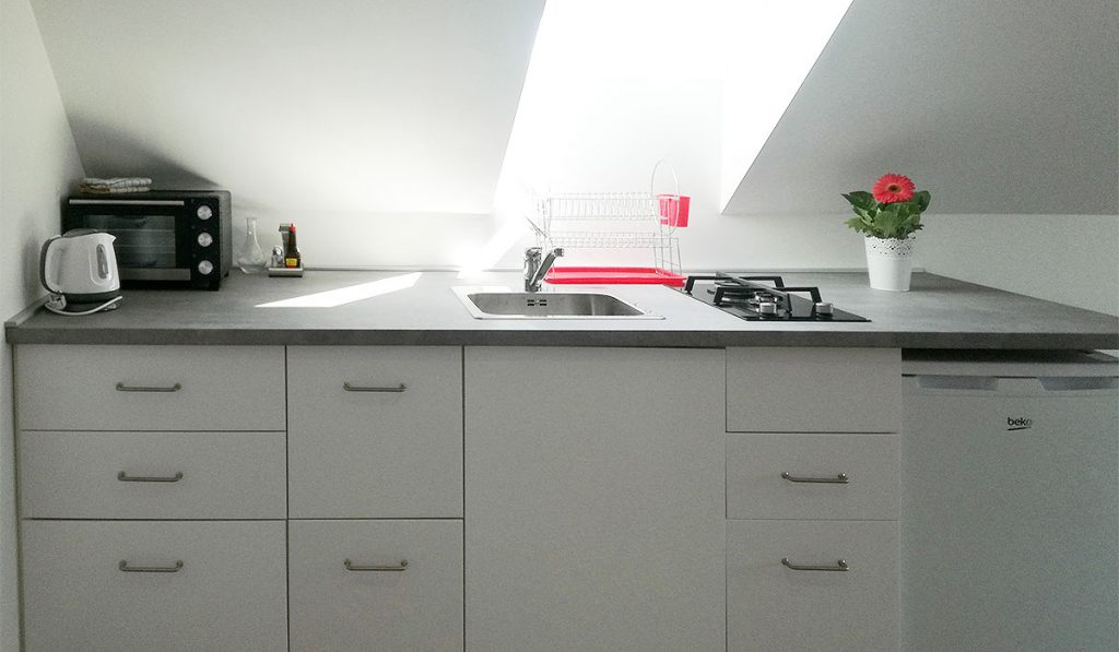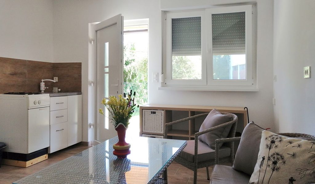 Za osnovno pripravo hrane je v kuhinji vsa potrebna oprema, vključno z mini pečico in grelnikom vode. V dnevni sobi je televizija, apartma pa je opremljen tudi z Wi-fi. Vsi prostori so zelo svetli in prijetni ter imajo klimatsko napravo, s katero se ob hladnejših dnevih lahko gostje apartma tudi ogrevajo. Parkiranje je omogočeno na dvorišču.