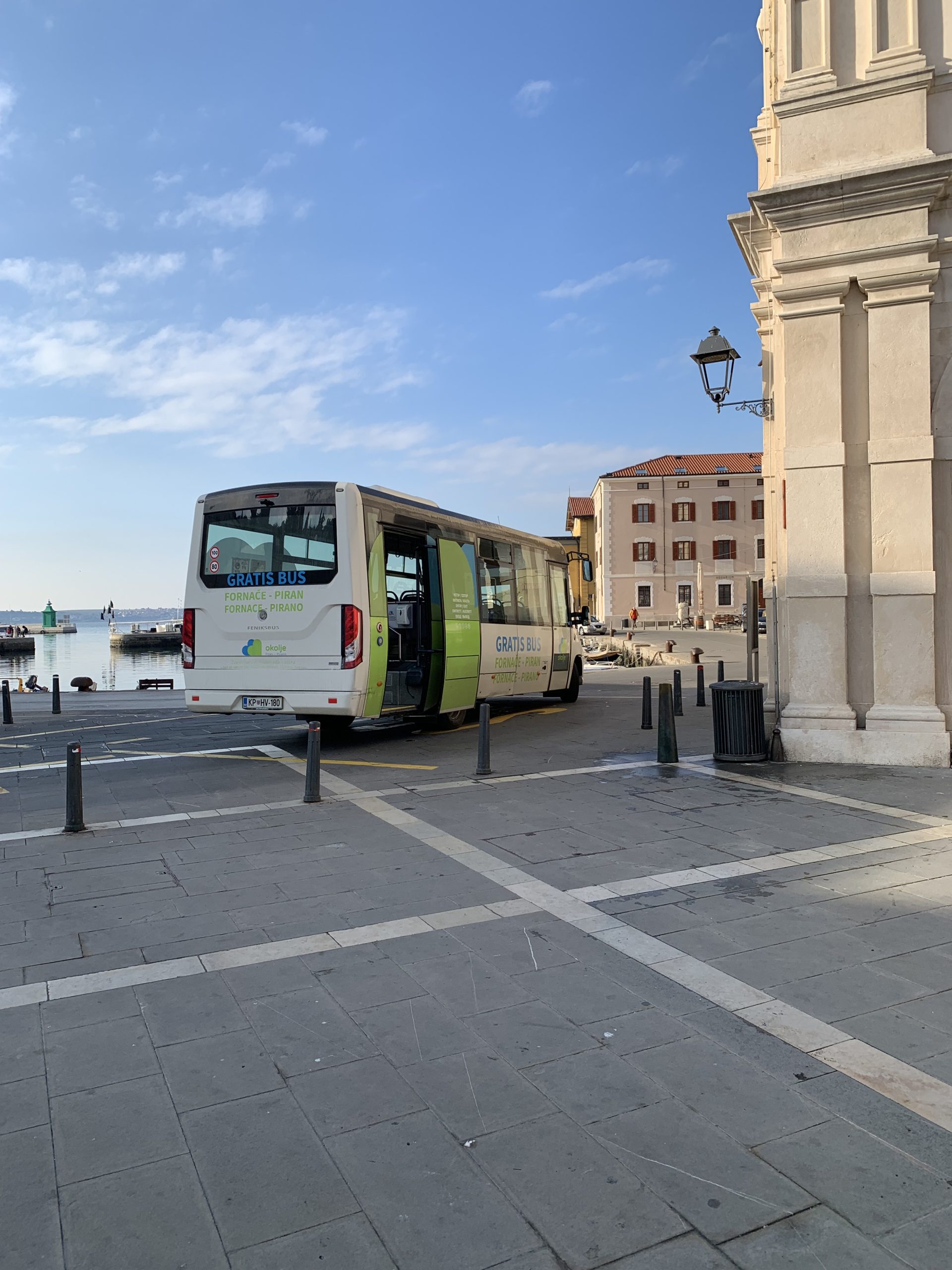 Od Tartinijevega trga do garažne hiše vozi brezplačen mini bus vsakih 15 minut. Midva sva hodila raje peš, smo pa enkrat poskusili in psi so na avtobusu dejansko dovoljeni.
