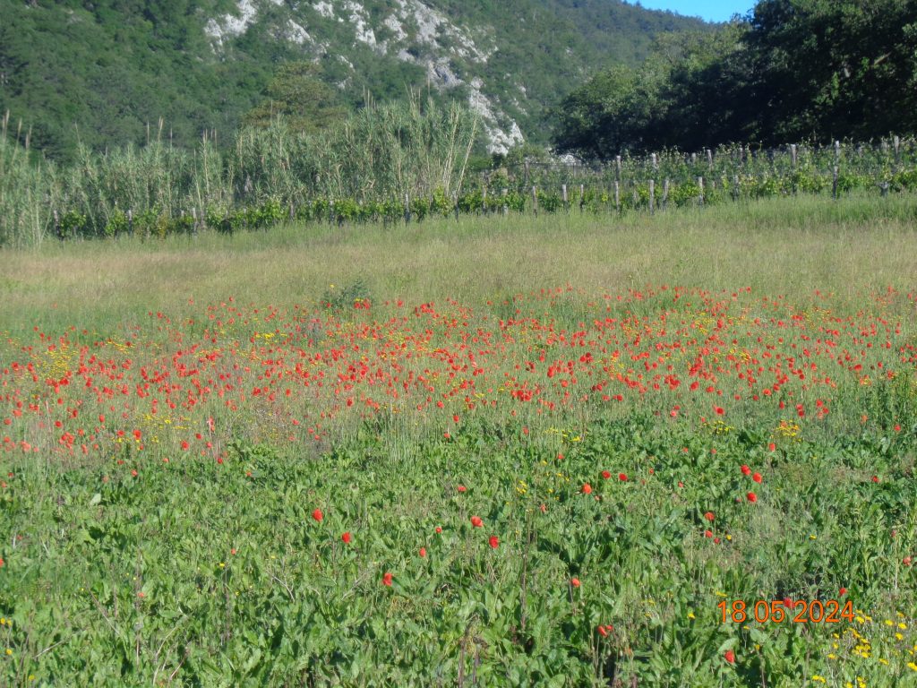 Ker je imela Gaja pred malo manj kot enim mesecem operacijo, sem se odločila, da bom izbrala nekaj lažjega in krajšega zaradi nje. Tako sem se odločila za hrib Lačna, ki je na Primorskem in kjer še nismo bile. Parkirala sem na parkirišču poleg Gostilne Švab. Od parkirišča smo nadaljevale nekaj časa po asfaltni cesti, ki pa se je potem spremenila v makadamsko cesto. Hodile smo mimo vinogradov, oljk in polj. Na enem polju je bilo kar precej maka, kar je bilo prečudovito za oči.