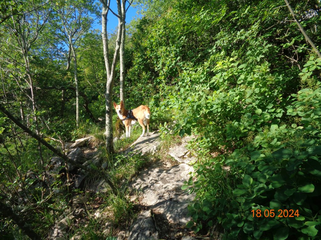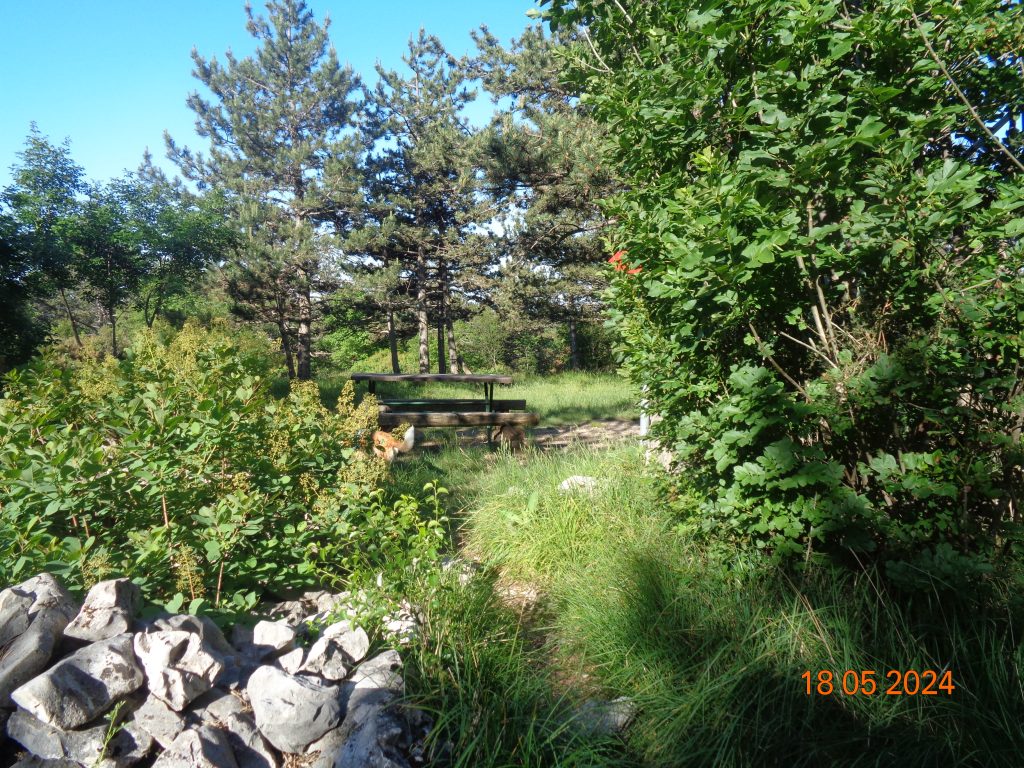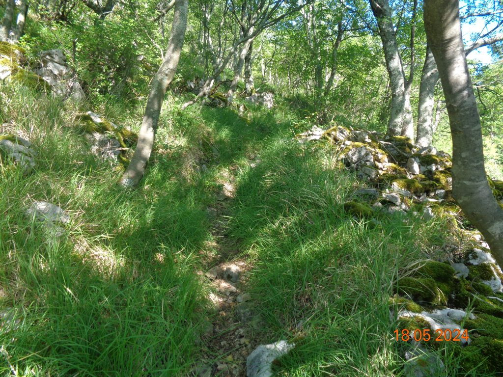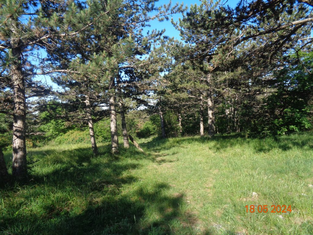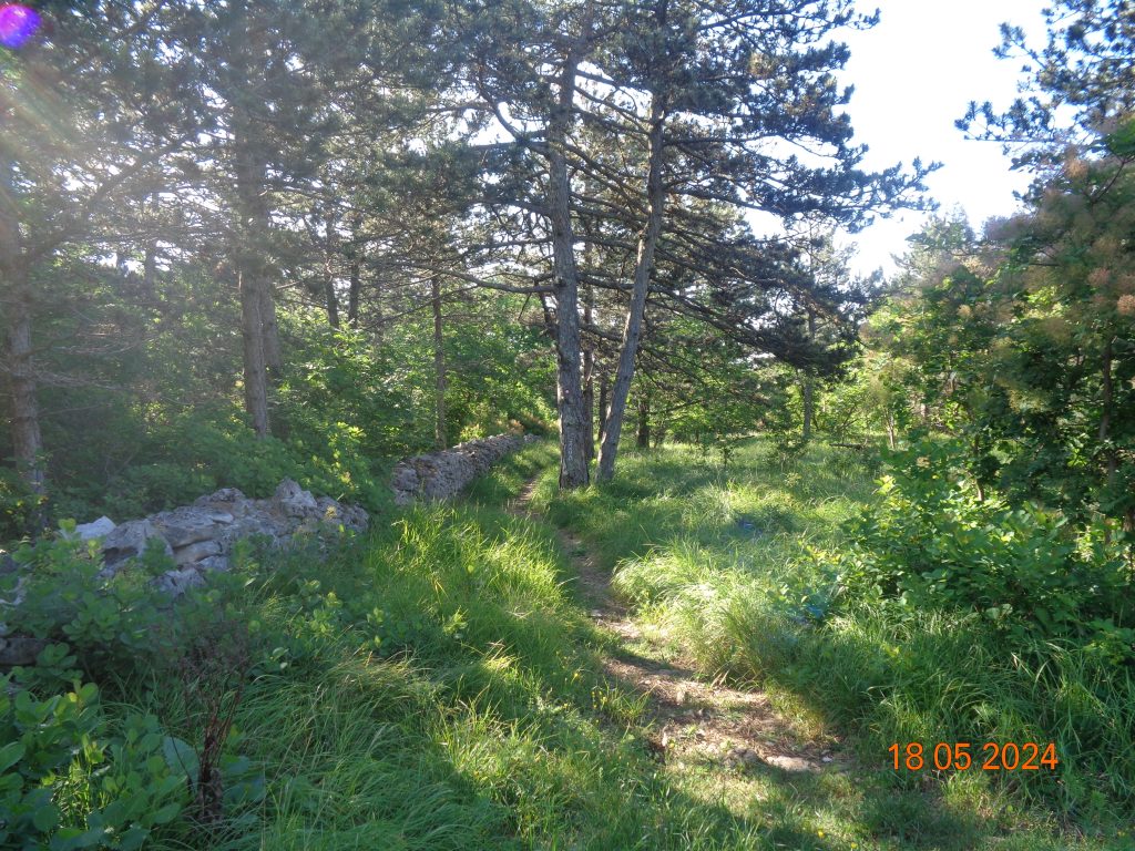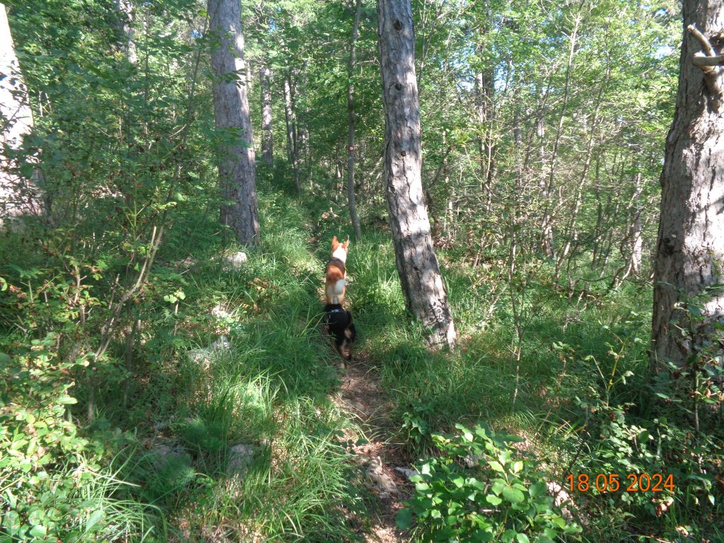 To je bilo zadnje melišče – flišno pobočje do vrhe. Med vsakim pa je bil vmes gozdiček, travnato področje in grmičevje. Višje se je pot nekoliko položila in v zmernem vzponu smo hodile skozi borov gozdič in grmičevje.
