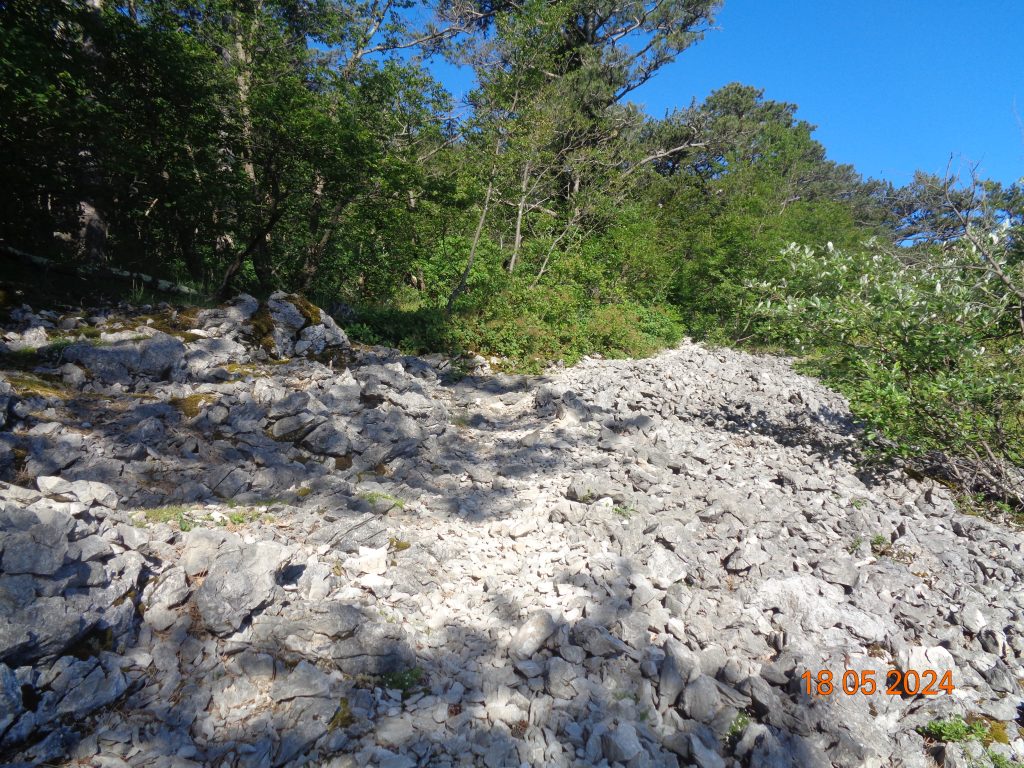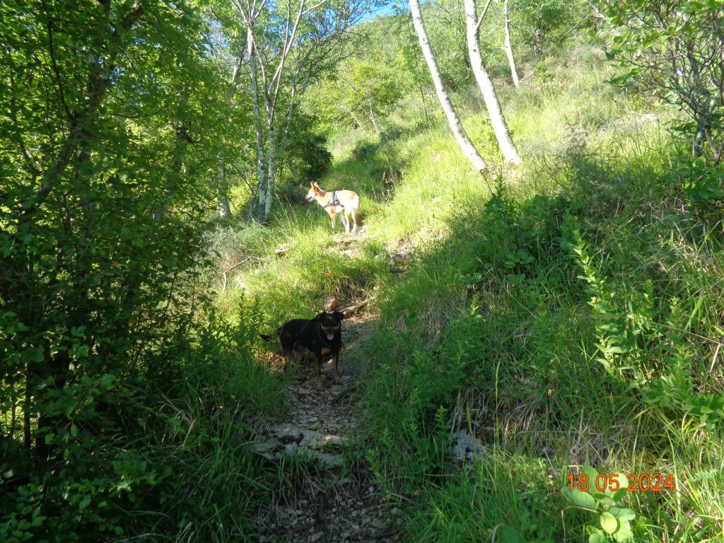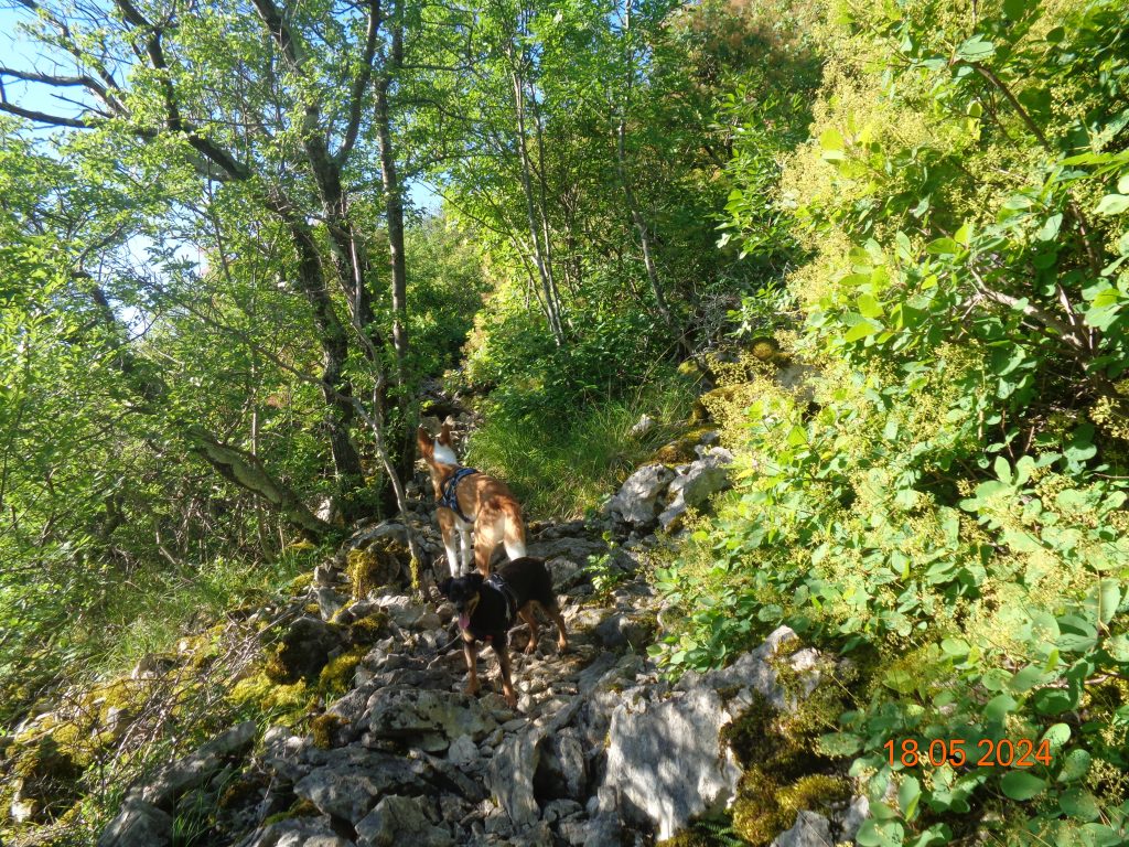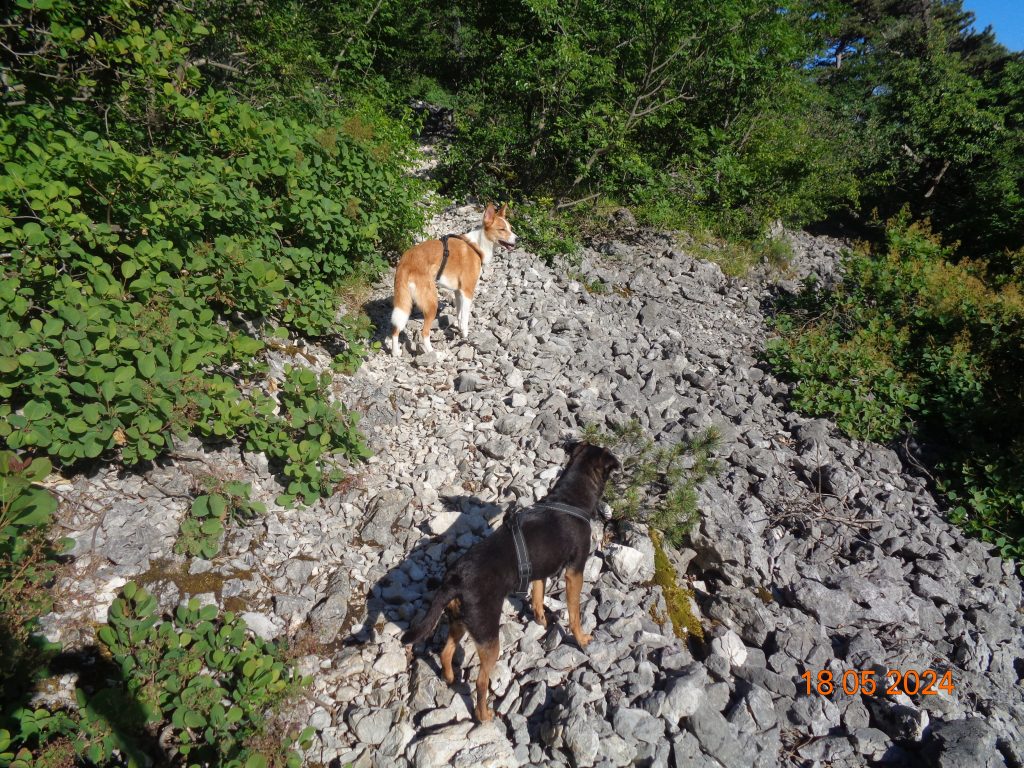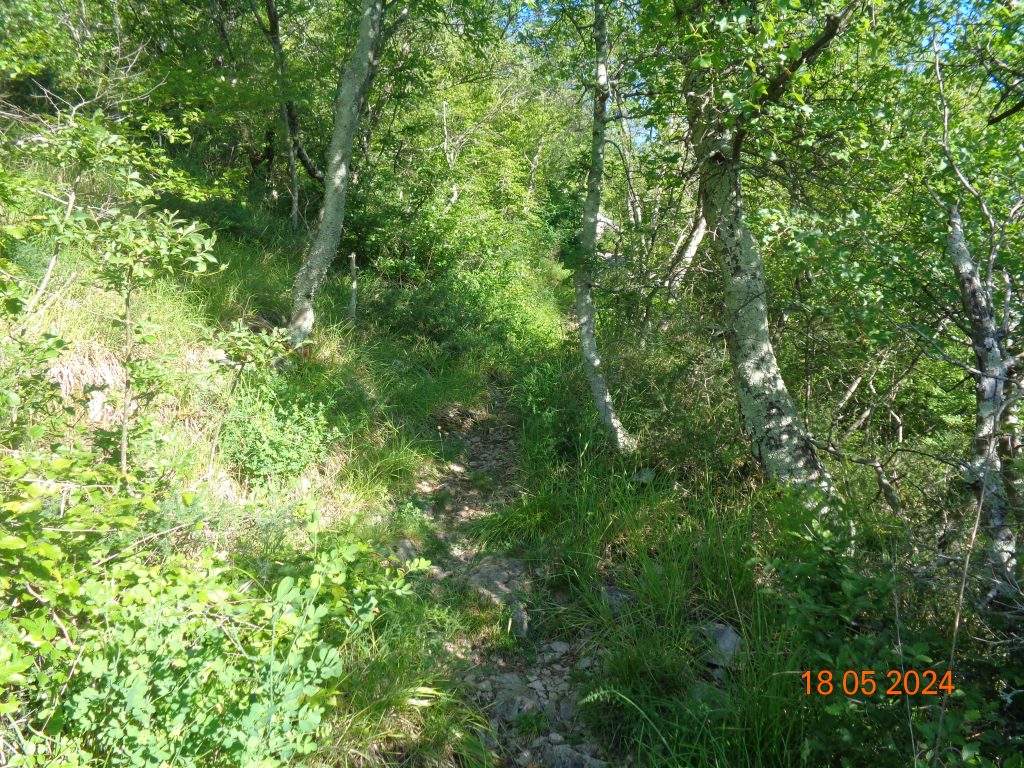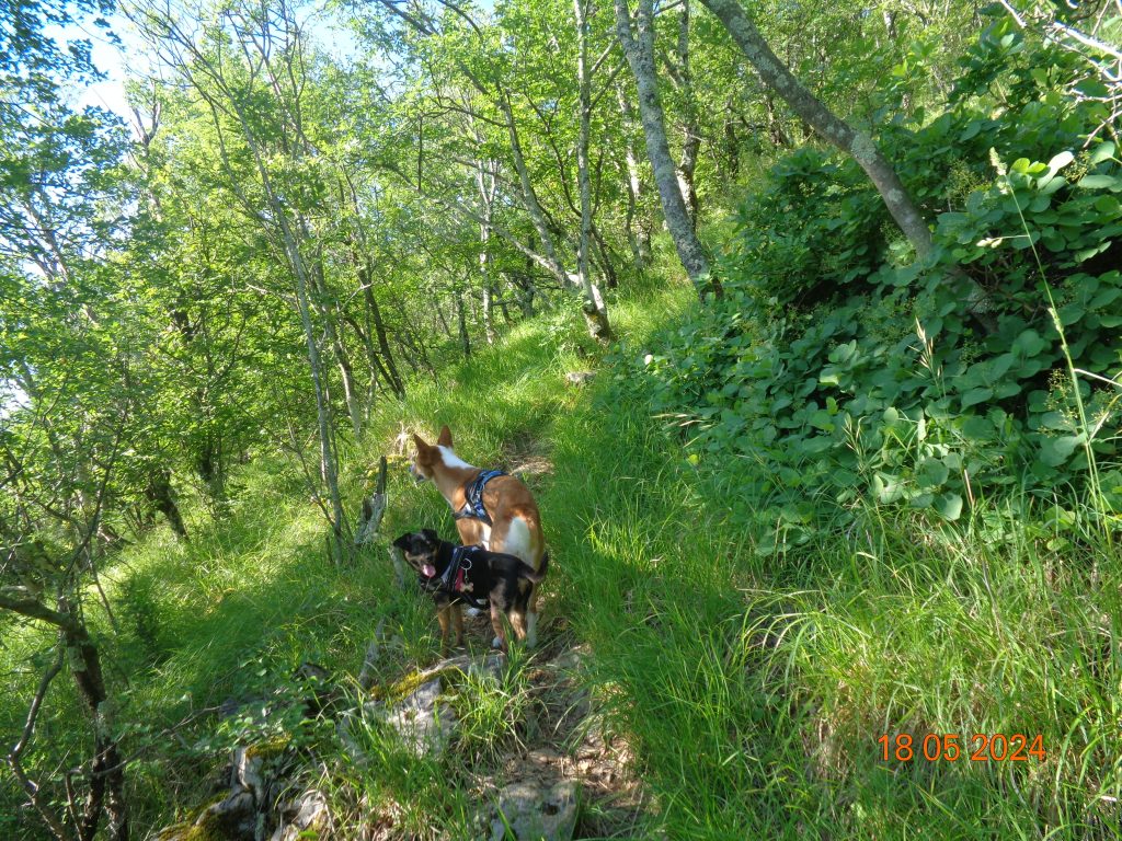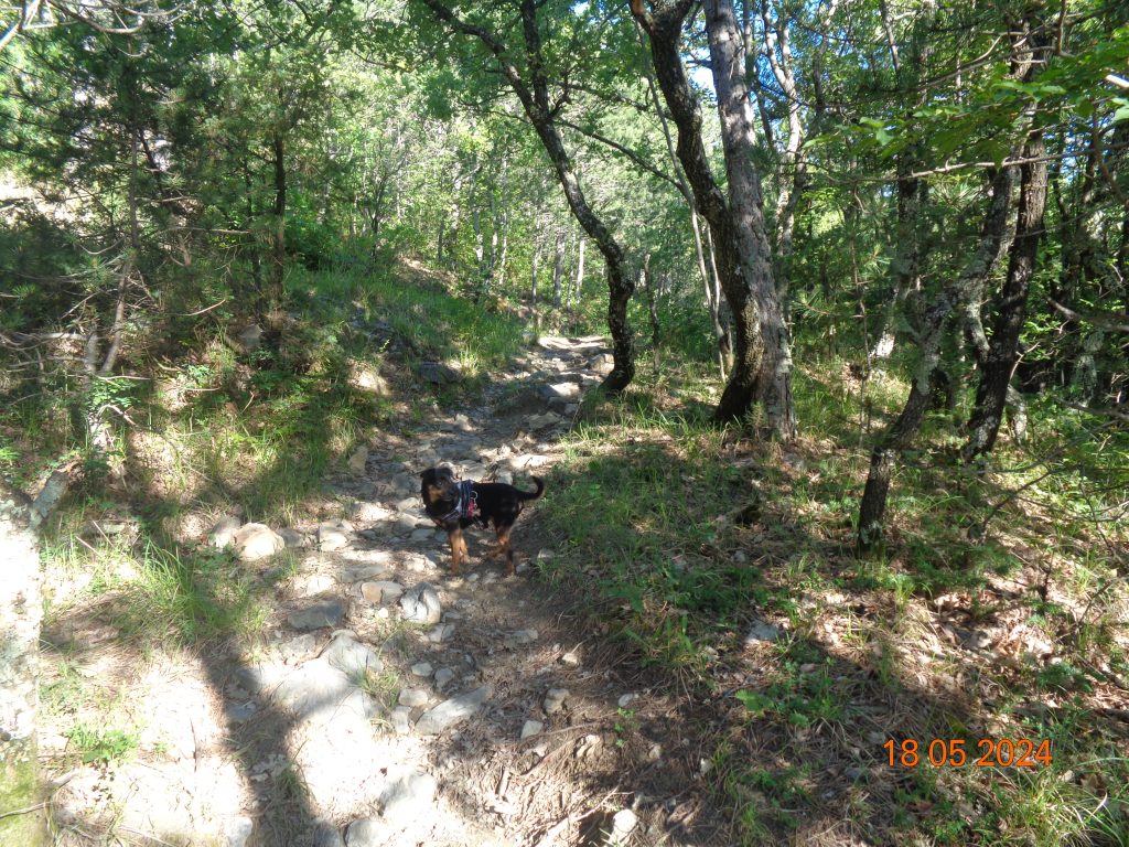 To je bilo zadnje melišče – flišno pobočje do vrhe. Med vsakim pa je bil vmes gozdiček, travnato področje in grmičevje. Višje se je pot nekoliko položila in v zmernem vzponu smo hodile skozi borov gozdič in grmičevje.