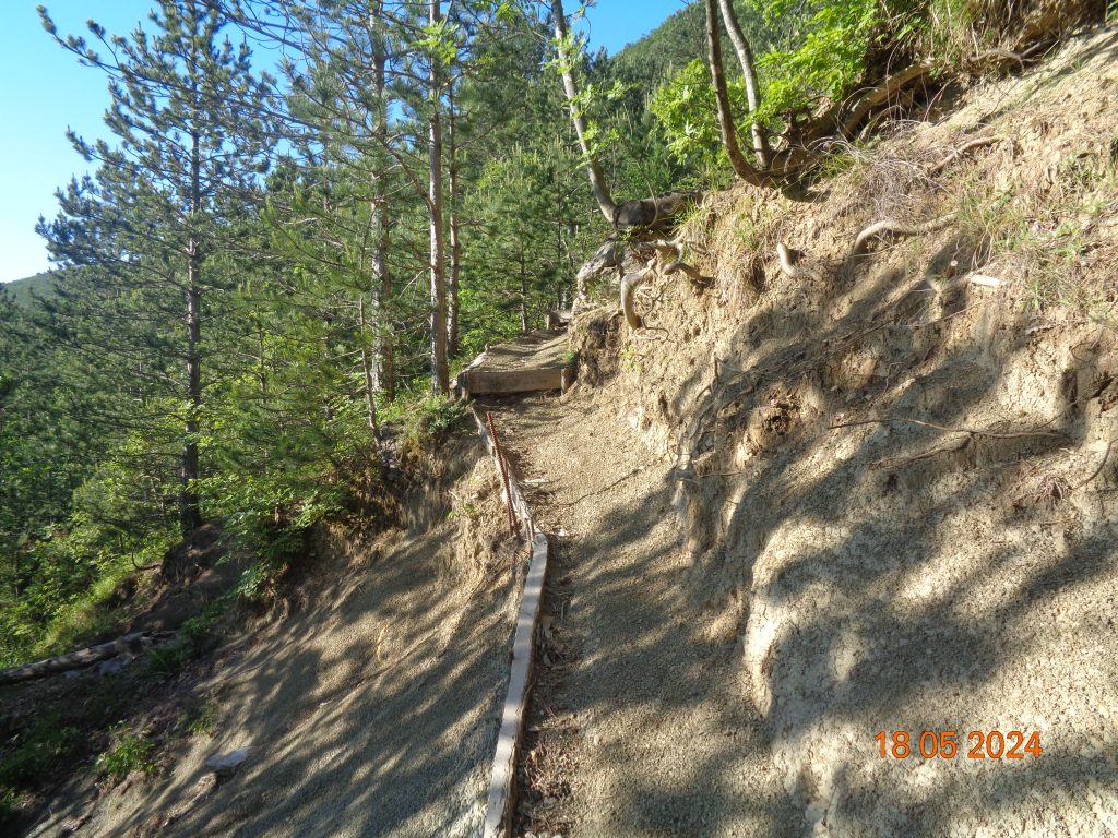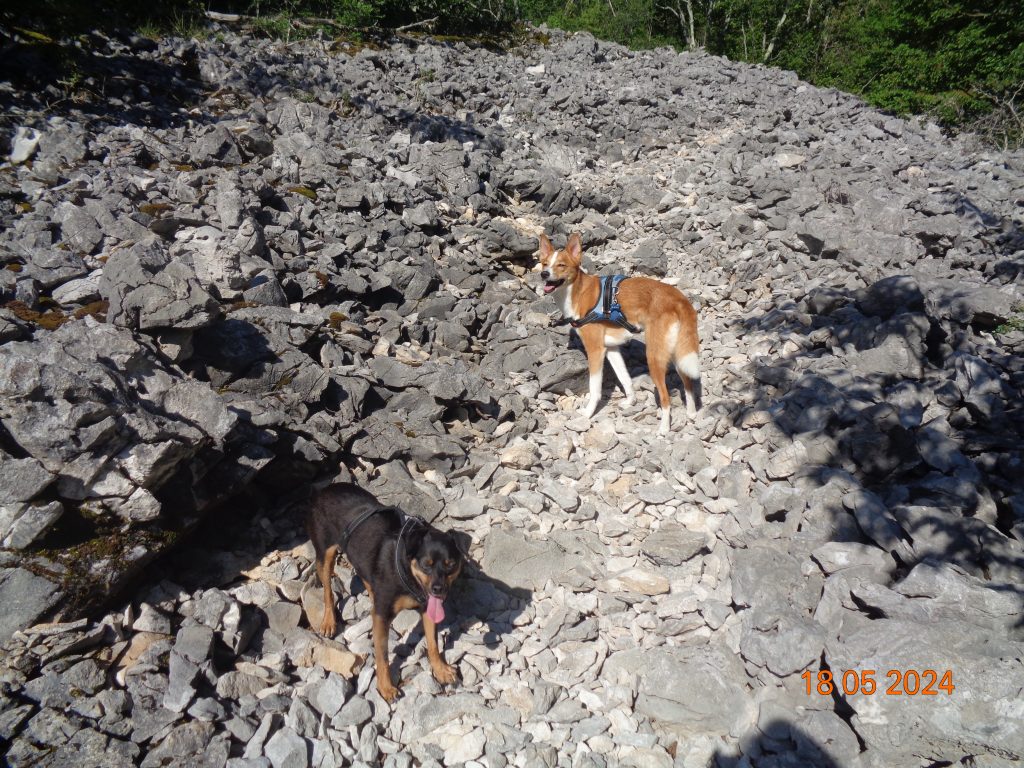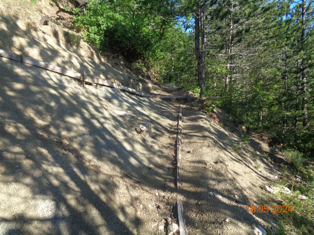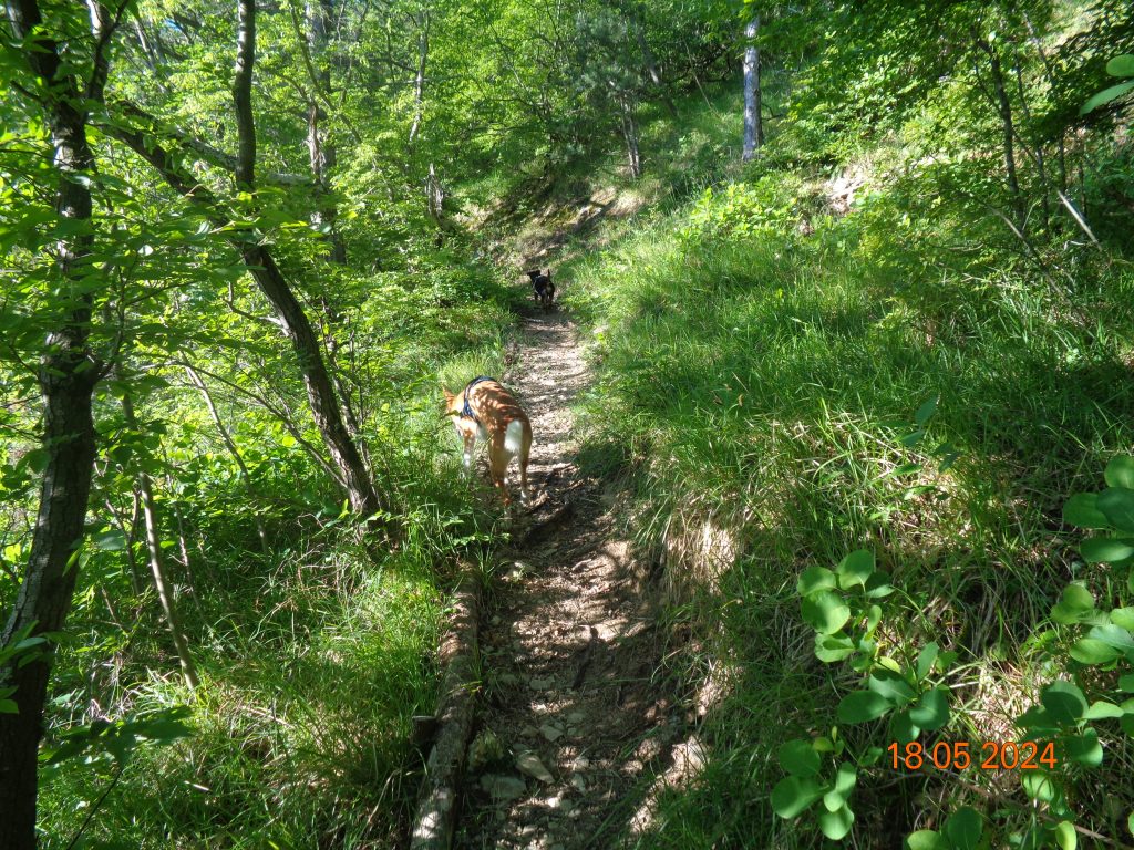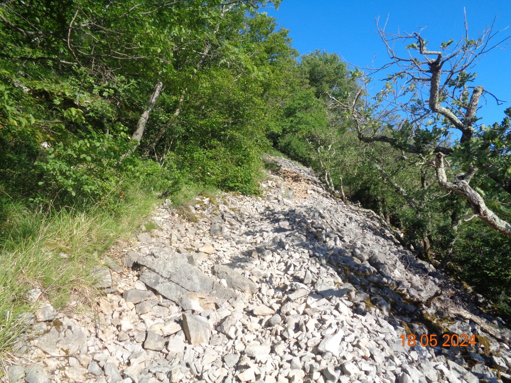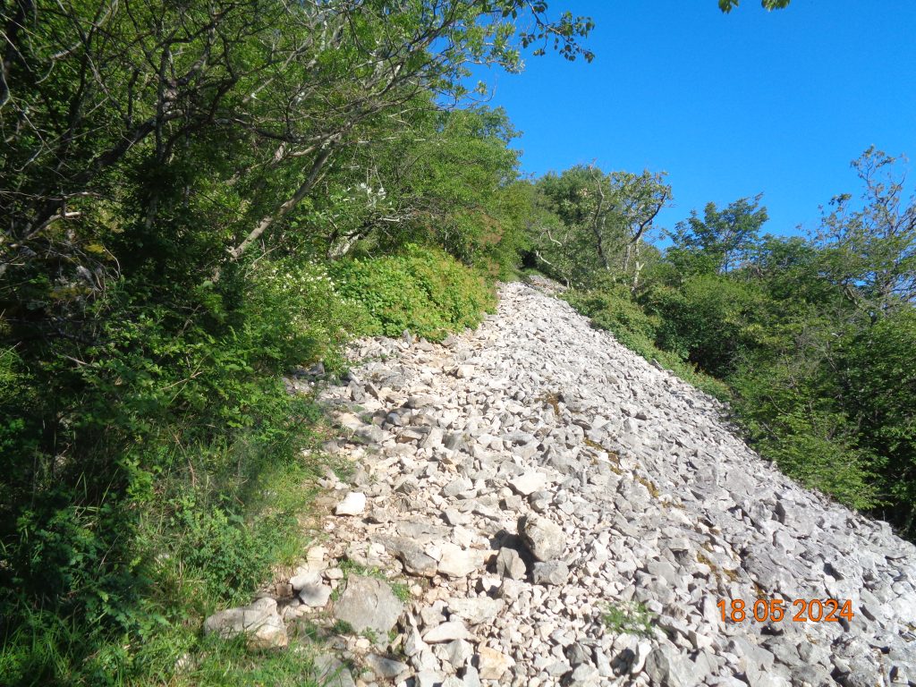 To je bilo zadnje melišče – flišno pobočje do vrhe. Med vsakim pa je bil vmes gozdiček, travnato področje in grmičevje. Višje se je pot nekoliko položila in v zmernem vzponu smo hodile skozi borov gozdič in grmičevje.