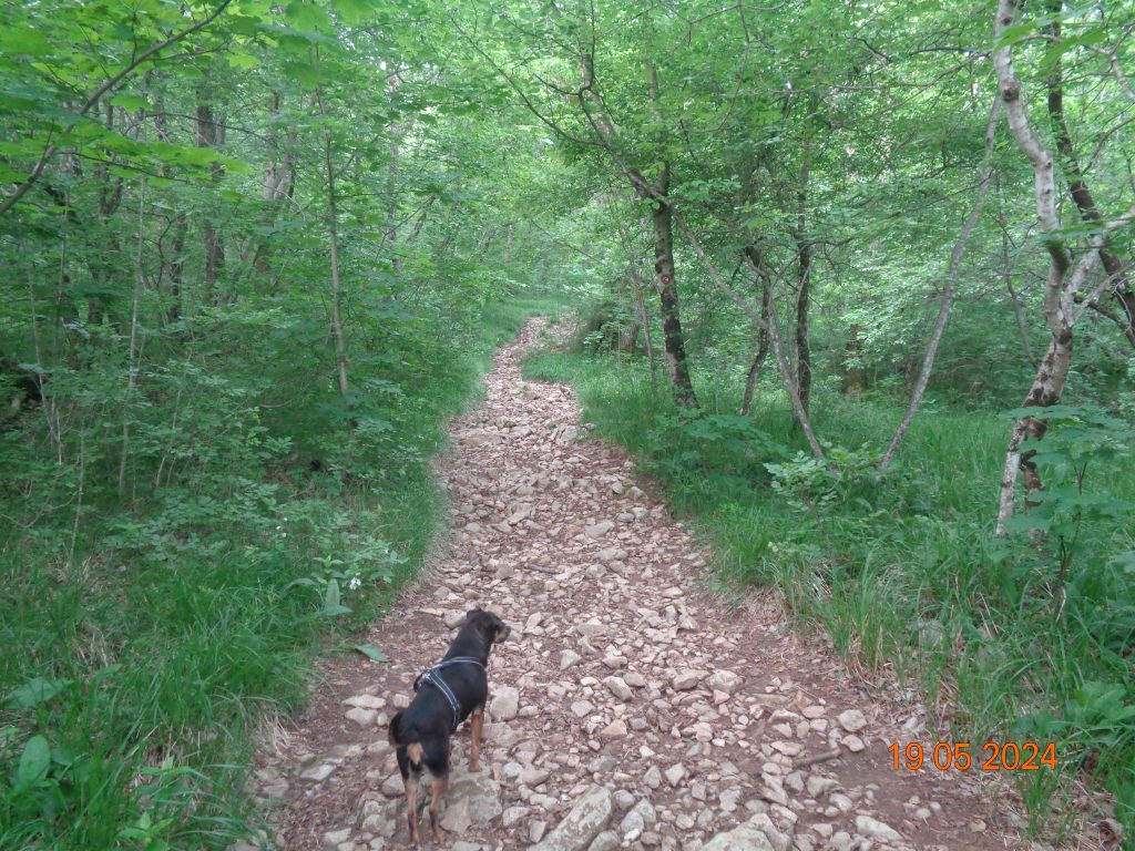 Višje se kolovoz začne strmeje vzpenjati, vendar je še vedno pot v gozdičku.