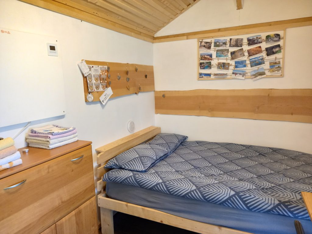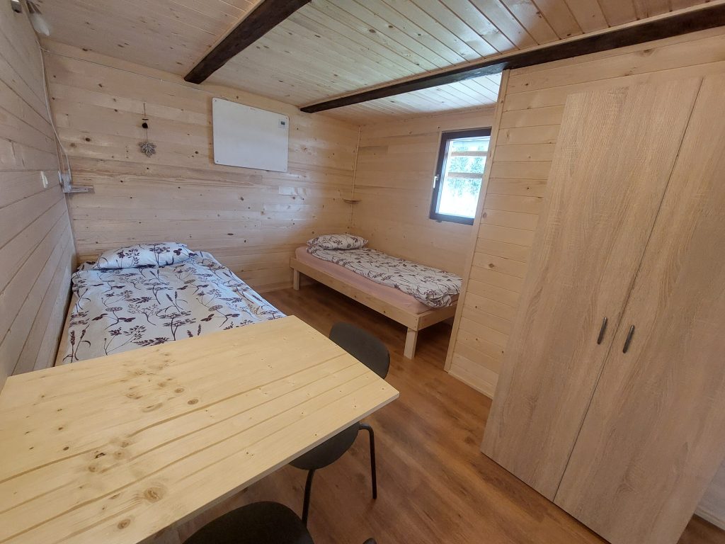 Senik 2 je prijetna zasebna soba, ki sprejme do dve osebi in se nahaja v prvem nadstropju stavbe. Opremljena je z udobnima dvema enojnima posteljama, garderobno omaro in mizo, ki omogoča udobno bivanje in delo. Soba ima tudi svoj balkon, kjer lahko gostje uživajo v svežem zraku in čudovitem razgledu na okolico. V sobi je na voljo tudi hladilnik, kar omogoča osnovno shranjevanje hrane in pijače. Za udobje gostov je poskrbljeno tudi s sistemom gretja z IR paneli, ki zagotavlja prijetno temperaturo v vseh letnih časih. Spodnje nadstropje stavbe ponuja skupno kuhinjo in skupno kopalnico. Kuhinja je opremljena z večjim hladilnikom, kuhalno ploščo, posodo, grelnikom vode in mikrovalovno pečico, kar omogoča pripravo obrokov po lastni izbiri. Pred stavbo je tudi vrtna sedežna garnitura, kjer lahko gostje počijejo in uživajo v svežem zraku, ter možnost uporabe zunanjega žara za pripravo okusnih obrokov na prostem. Gostom je na voljo tudi brezplačna uporaba brezžičnega interneta, prav tako pa je zagotovljeno brezplačno parkirišče, ki se nahaja neposredno ob stavbi.