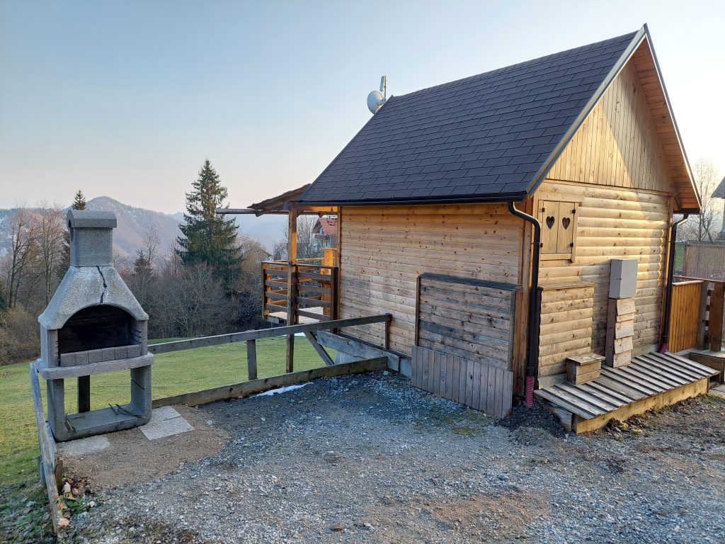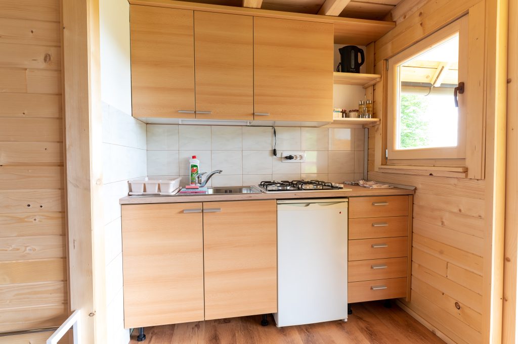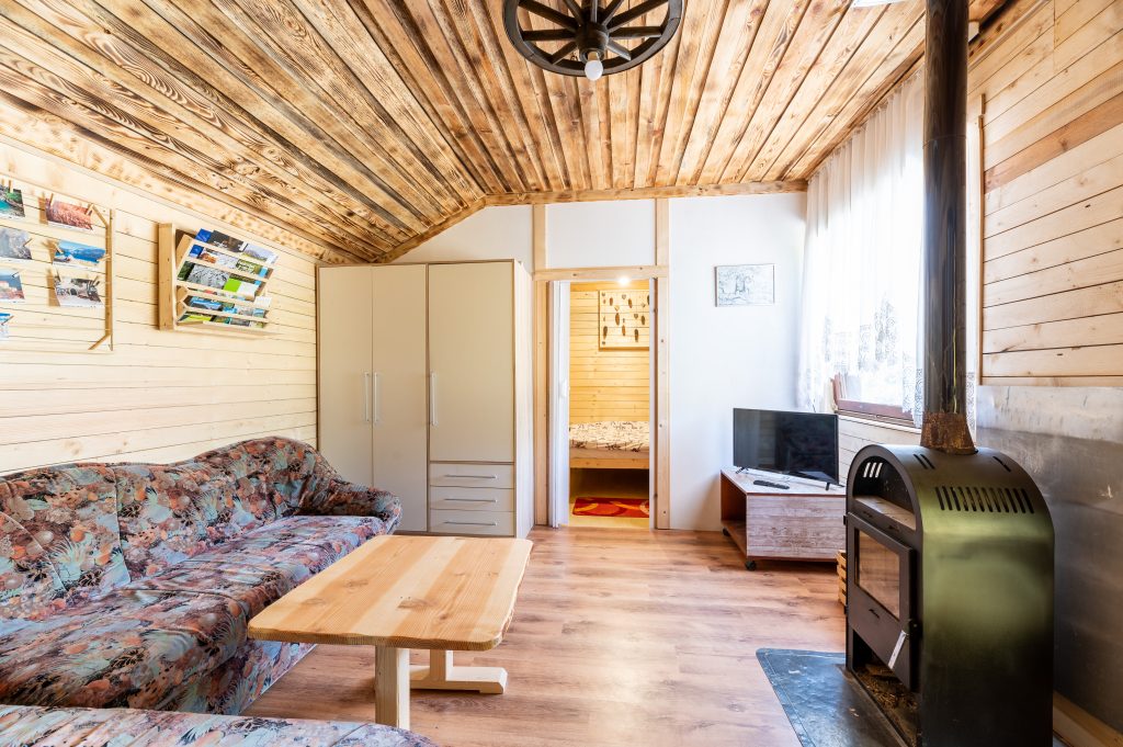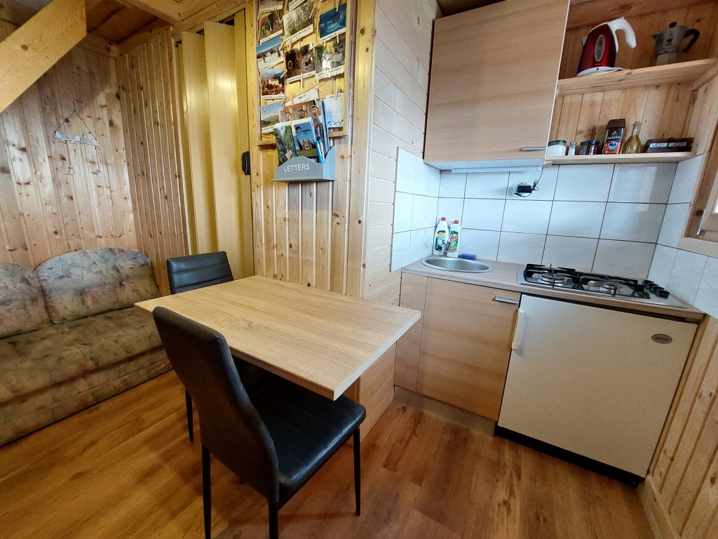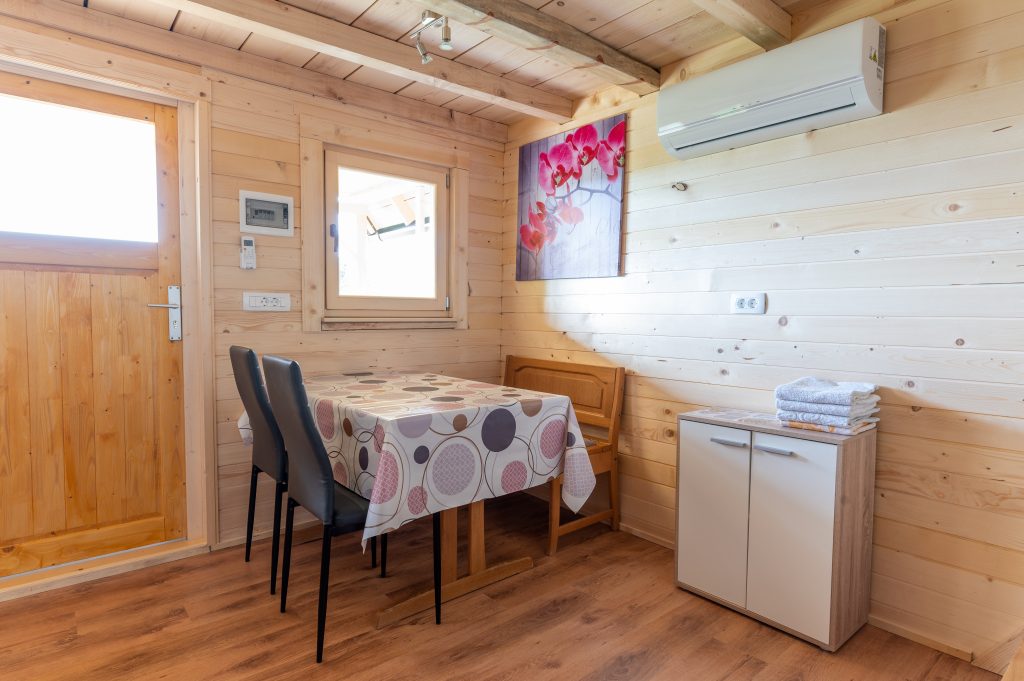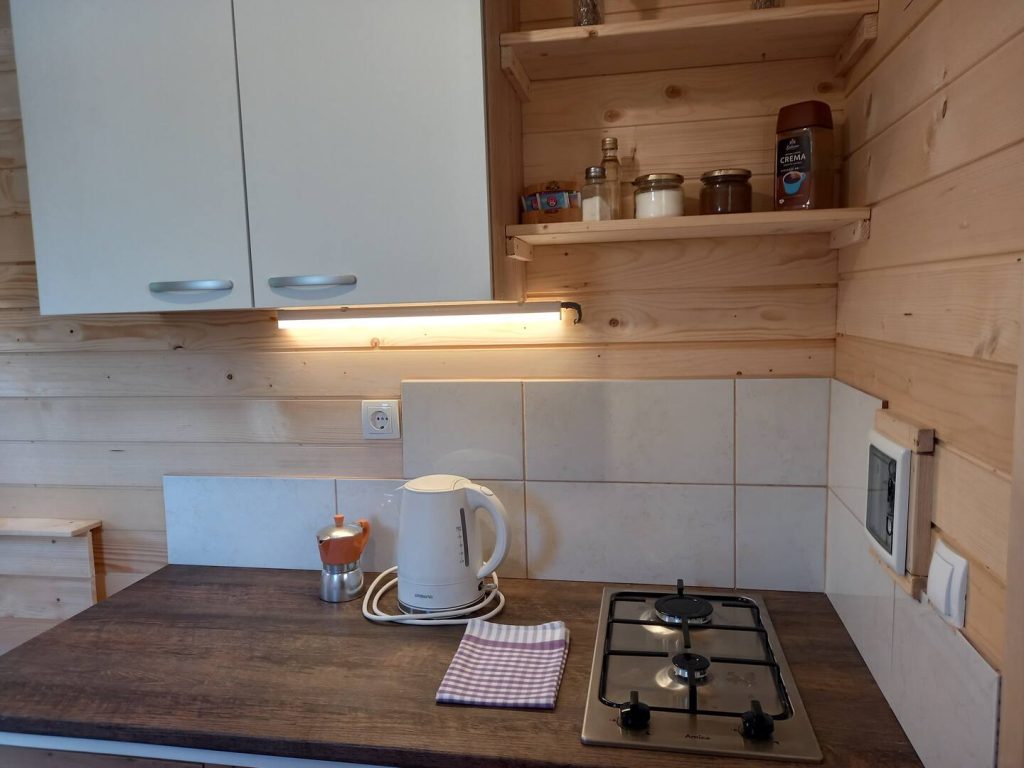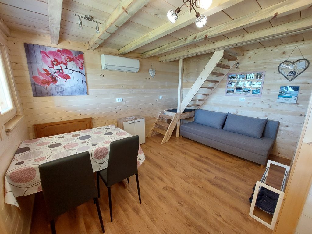 Spodnji del hiške sestavljajo dnevni prostor z jedilnim kotom in prostornim kavčem, kuhinja in lastna manjša kopalnica. Kuhinja vsebuje štedilnik, manjši hladilnik, grelnik vode in kuhinjske pripomočke, ki vam omogočajo pripravo hrane. Hiška je primerna za bivanje v vseh letnih časih. Nameščena klimatska naprava vas bo poleti ohladila, pozimi pa poskrbela za prijetno temperaturo. Hiška ima tudi teraso z vrtno sedežno garnituro in jacuzzijem, oziroma vročo kadjo (odvisno od letnega časa). Za popoln odklop se zraven hiške nahaja še plato z dvema ležalnikoma za lovljenje sončnih žarkov in za poležavanje po napornem dnevu. Nastanitev ponuja brezplačen brezžični internet in brezplačno parkirišče pri hiški.