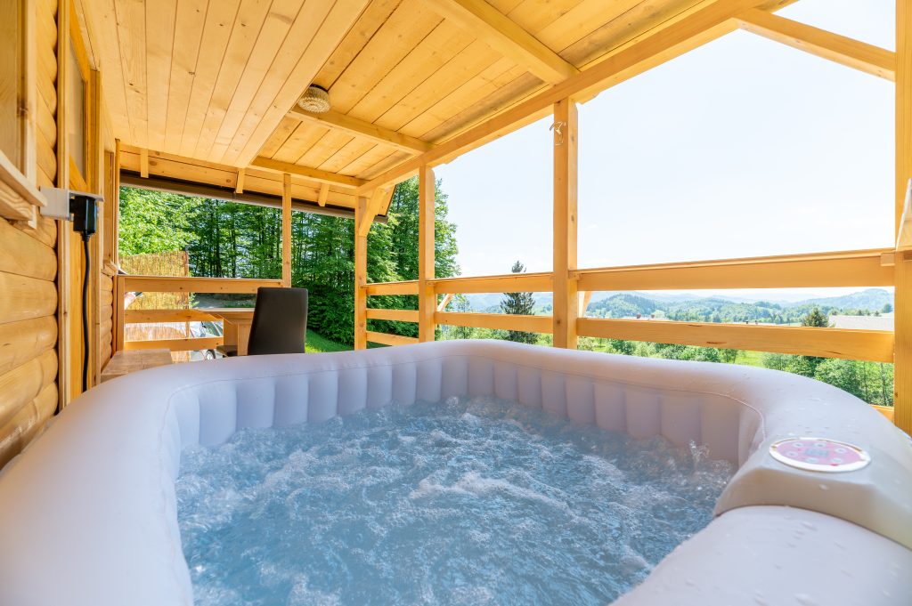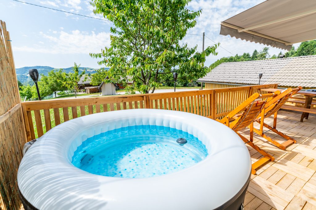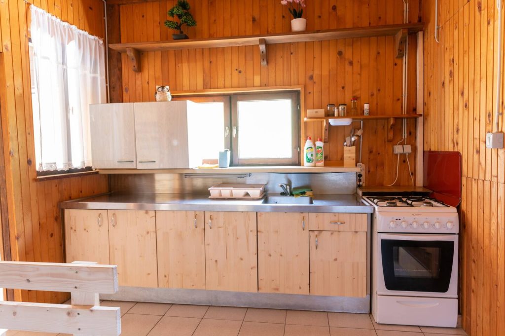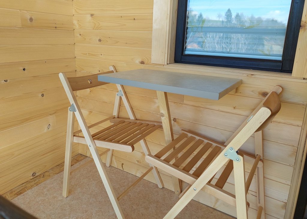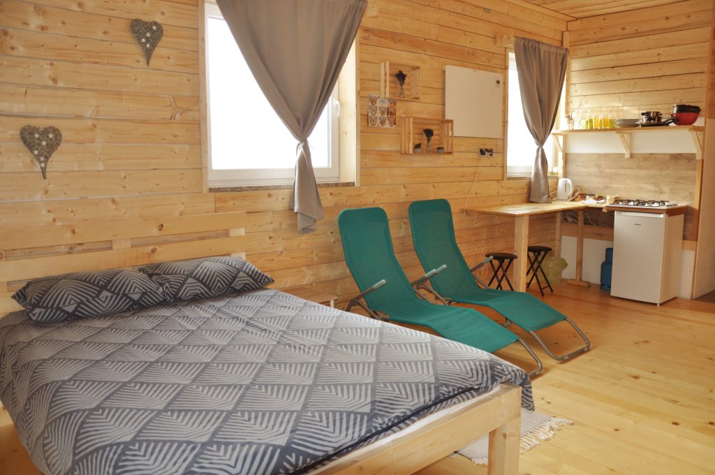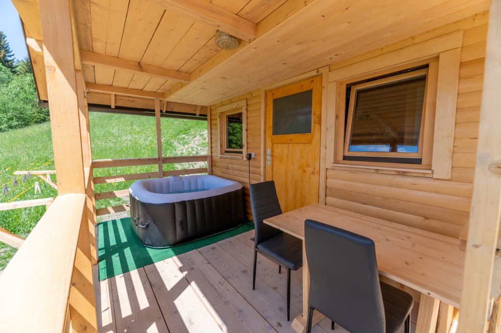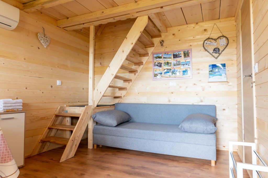 Spodnji del hiške sestavljajo dnevni prostor z jedilnim kotom in prostornim kavčem, kuhinja in lastna manjša kopalnica. Kuhinja vsebuje štedilnik, manjši hladilnik, grelnik vode in kuhinjske pripomočke, ki vam omogočajo pripravo hrane. Hiška je primerna za bivanje v vseh letnih časih. Nameščena klimatska naprava vas bo poleti ohladila, pozimi pa poskrbela za prijetno temperaturo. Hiška ima tudi teraso z vrtno sedežno garnituro in jacuzzijem, oziroma vročo kadjo (odvisno od letnega časa). Za popoln odklop se zraven hiške nahaja še plato z dvema ležalnikoma za lovljenje sončnih žarkov in za poležavanje po napornem dnevu. Nastanitev ponuja brezplačen brezžični internet in brezplačno parkirišče pri hiški.