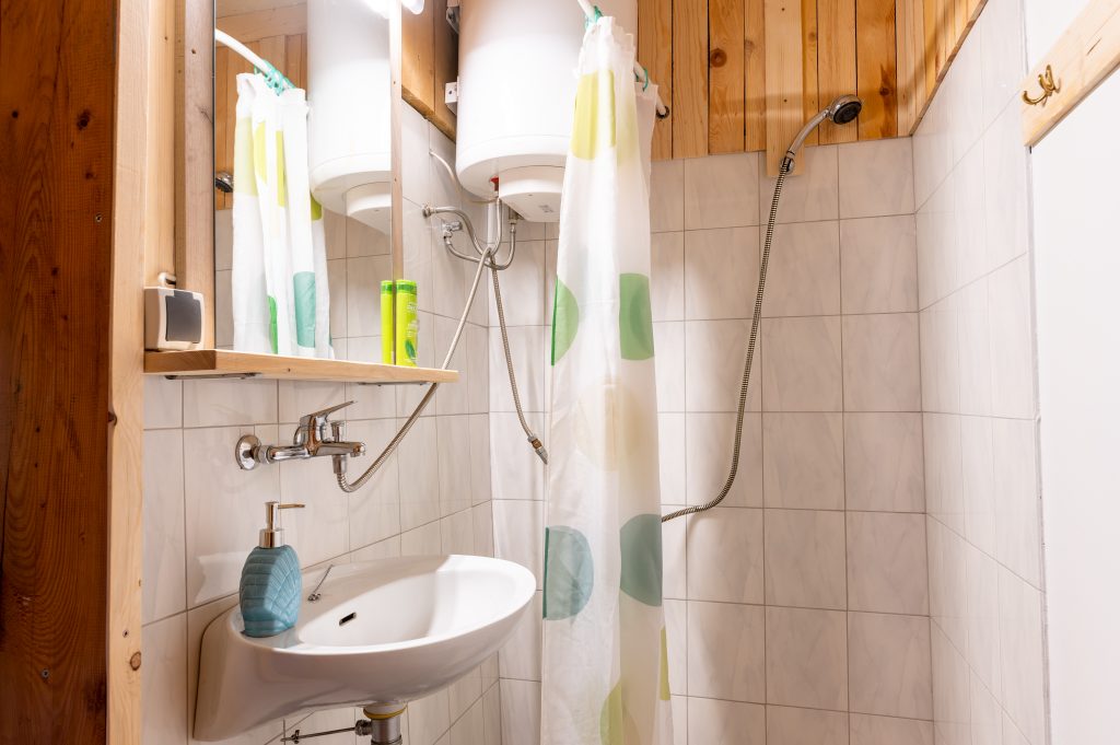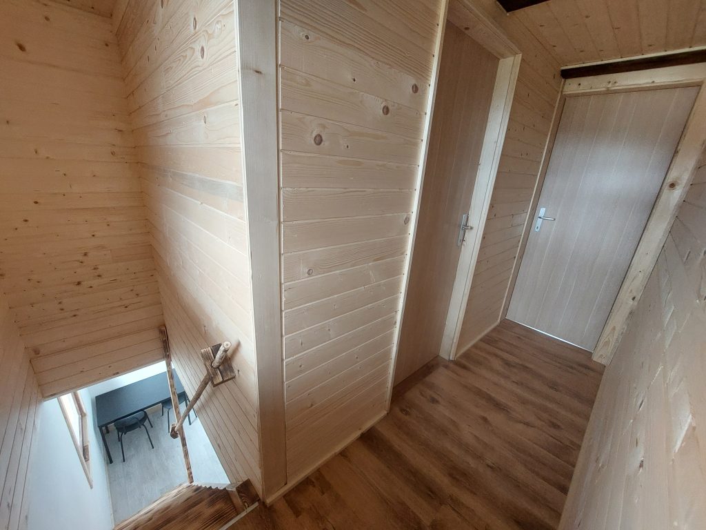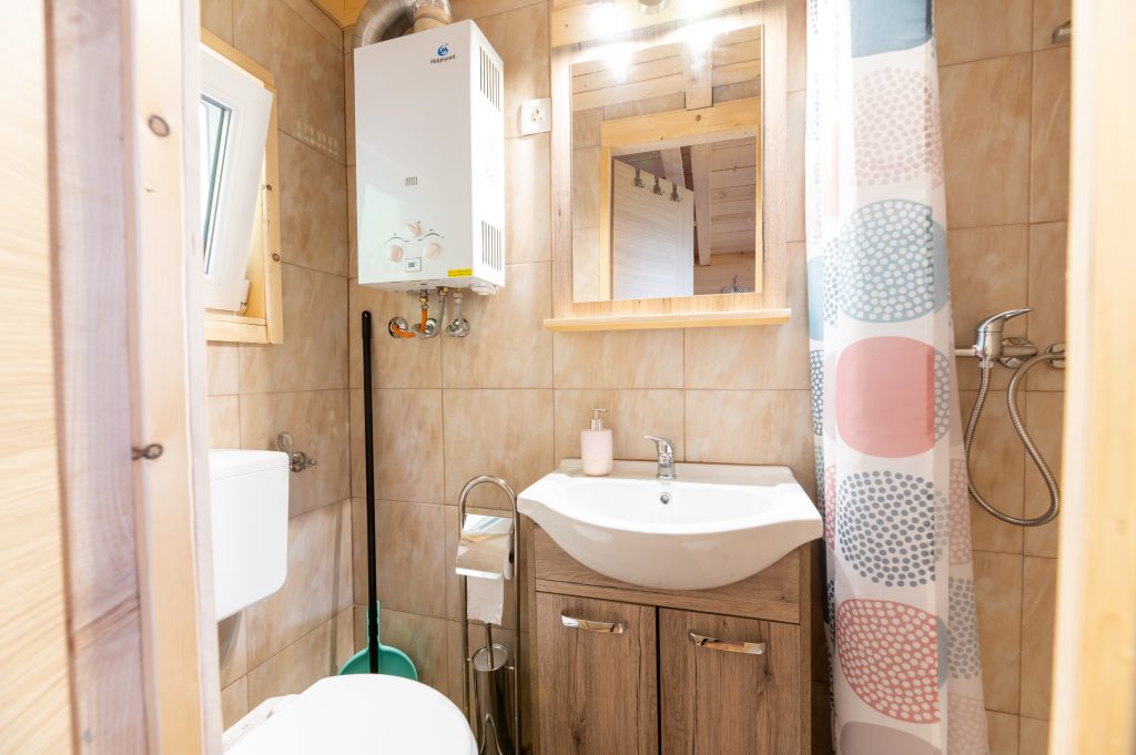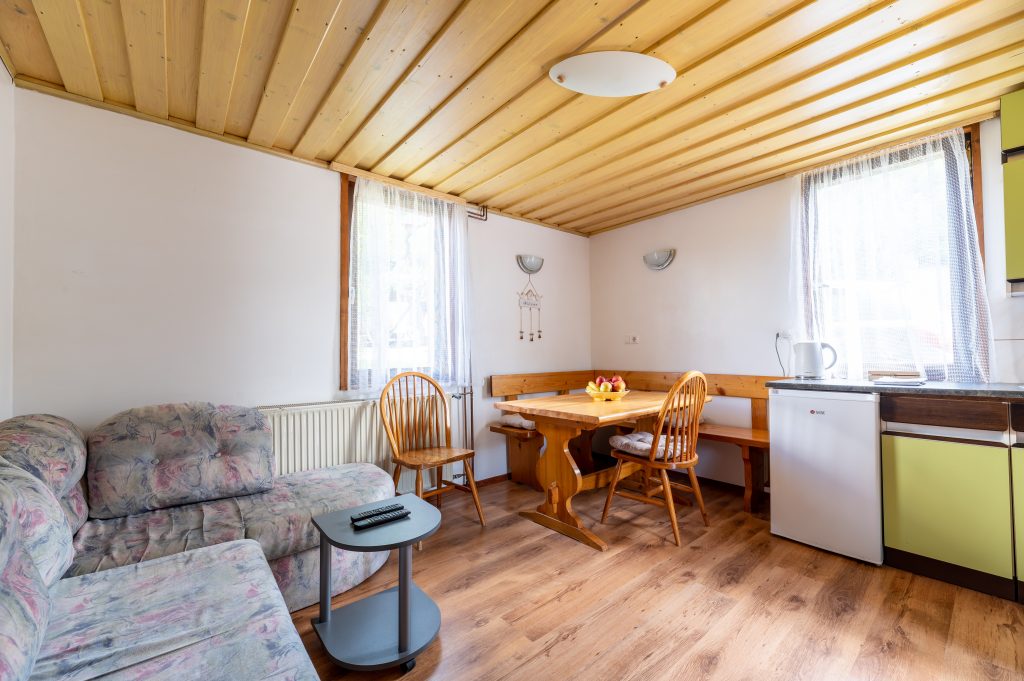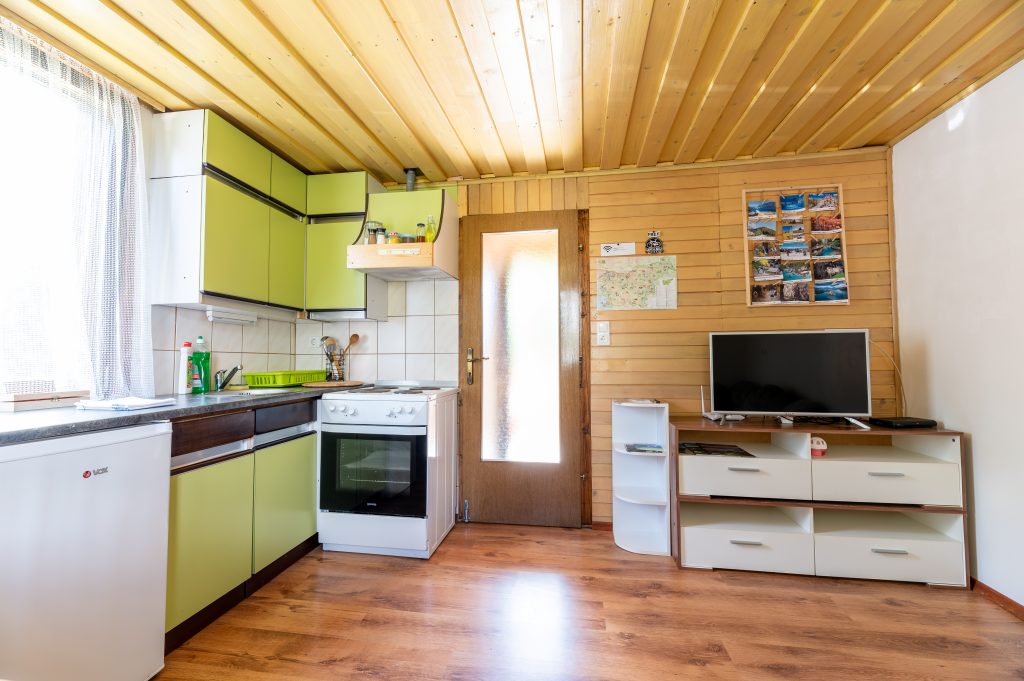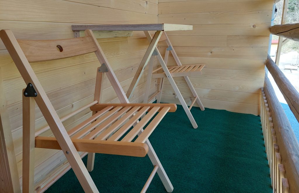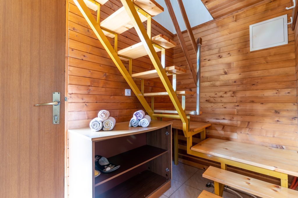 Spodnji del hiške sestavljajo dnevni prostor z jedilnim kotom in prostornim kavčem, kuhinja in lastna manjša kopalnica. Kuhinja vsebuje štedilnik, manjši hladilnik, grelnik vode in kuhinjske pripomočke, ki vam omogočajo pripravo hrane. Hiška je primerna za bivanje v vseh letnih časih. Nameščena klimatska naprava vas bo poleti ohladila, pozimi pa poskrbela za prijetno temperaturo. Hiška ima tudi teraso z vrtno sedežno garnituro in jacuzzijem, oziroma vročo kadjo (odvisno od letnega časa). Za popoln odklop se zraven hiške nahaja še plato z dvema ležalnikoma za lovljenje sončnih žarkov in za poležavanje po napornem dnevu. Nastanitev ponuja brezplačen brezžični internet in brezplačno parkirišče pri hiški.