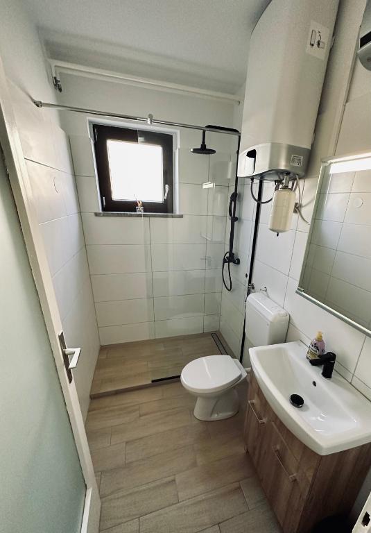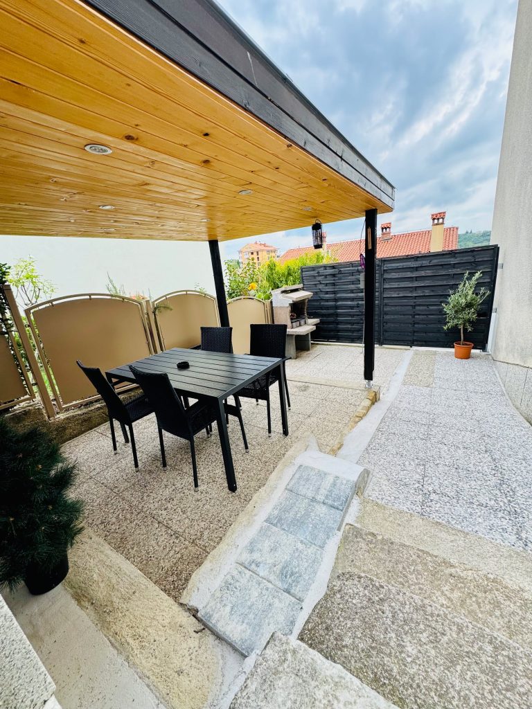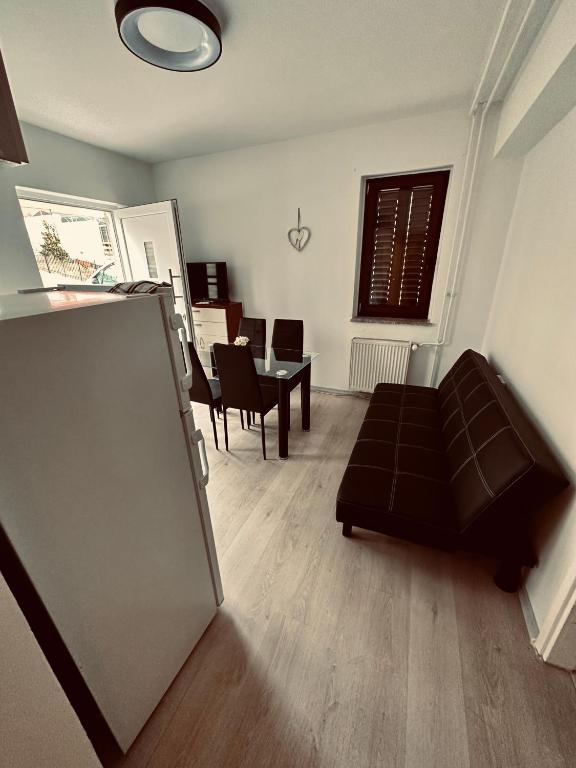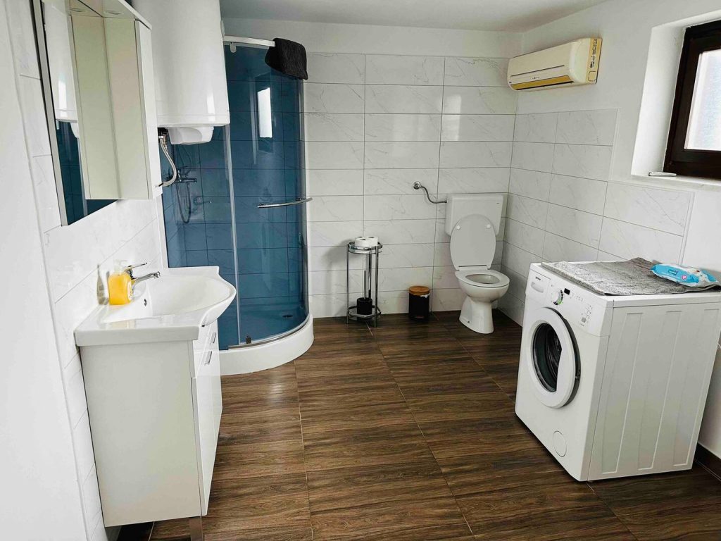 Zgornji apartma je za 4+1 osebe in ima v kuhinji tudi pečico. Pralnega stroja ni v tem apartmaju, je pa pralnica samo 3 minute od hiše.