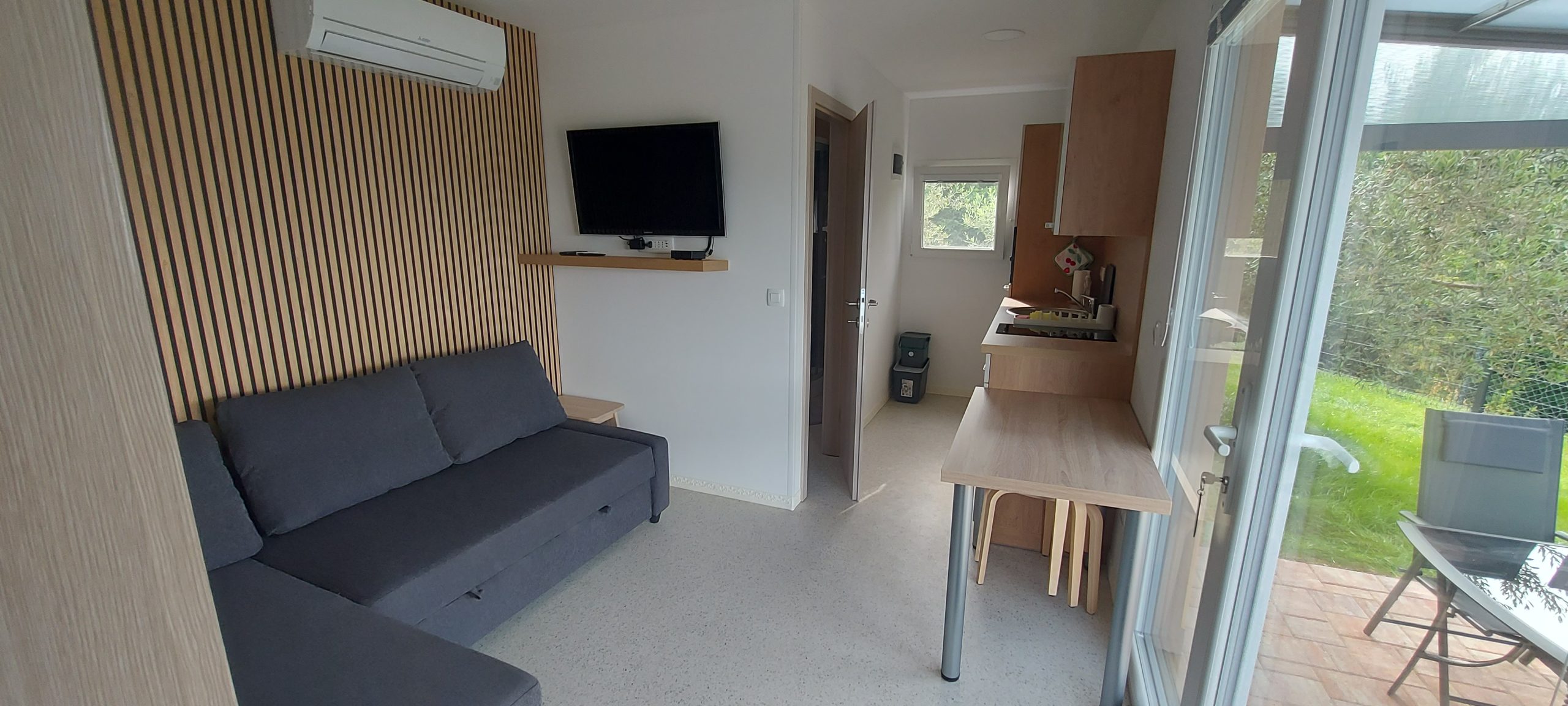 Mobilna hiška je velika 24m², opremljena s spalnico, dnevno, kuhinjo (s pomivalnim strojem) in kopalnico. V dnevnem prostoru je kavč, ki se lahko raztegne, da lahko prespita še 2 osebi. Torej hiška sprejme max 4 osebe. Kuhinja je polno opremljena. Na terasi je miza s stoli, dva ležalnika, posoda za hrano in pijačo za kužka ter koš za iztrebke. Nad hiško so gugalnice, igrišče, parkirni prostor in žar.