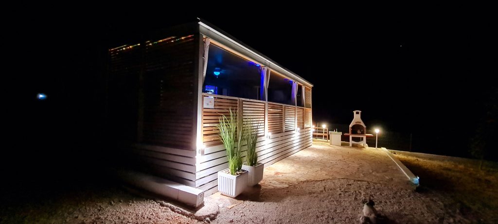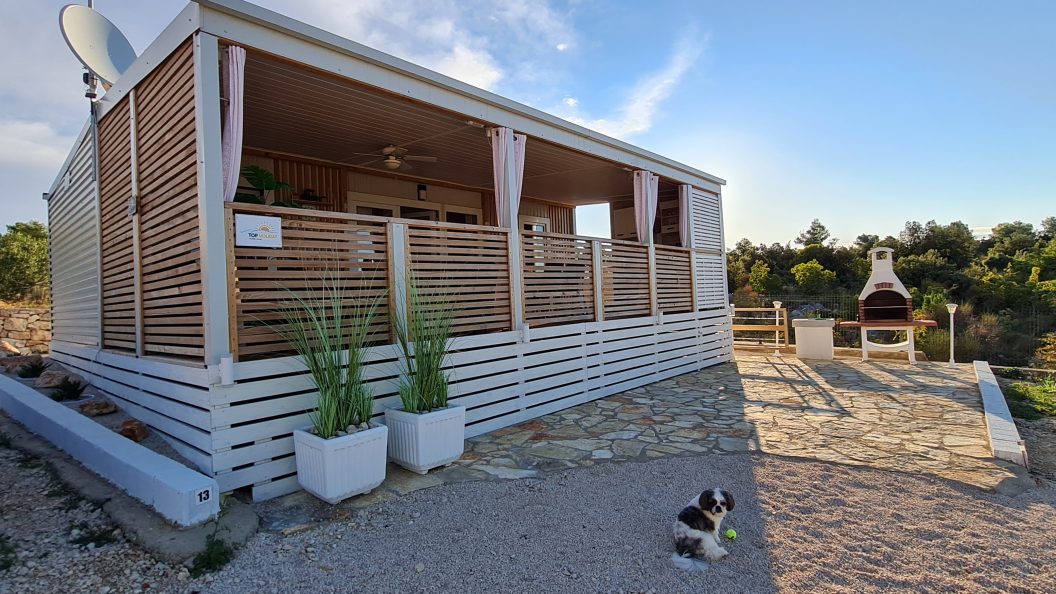 Zunaj hiške je velika terasa z ograjo, ki preprečuje, da bi vaš kuža samostojno odšel na sprehod. Kamp, v katerem se nahaja hiška, meri približno 1500 m² in vključuje le pet hišk, kar zagotavlja veliko zasebnosti in prostora za vse goste in njihove pse. Psi so v kampu zelo dobrodošli, dodatnih stroškov za vašega kužka pa ni potrebno plačati.