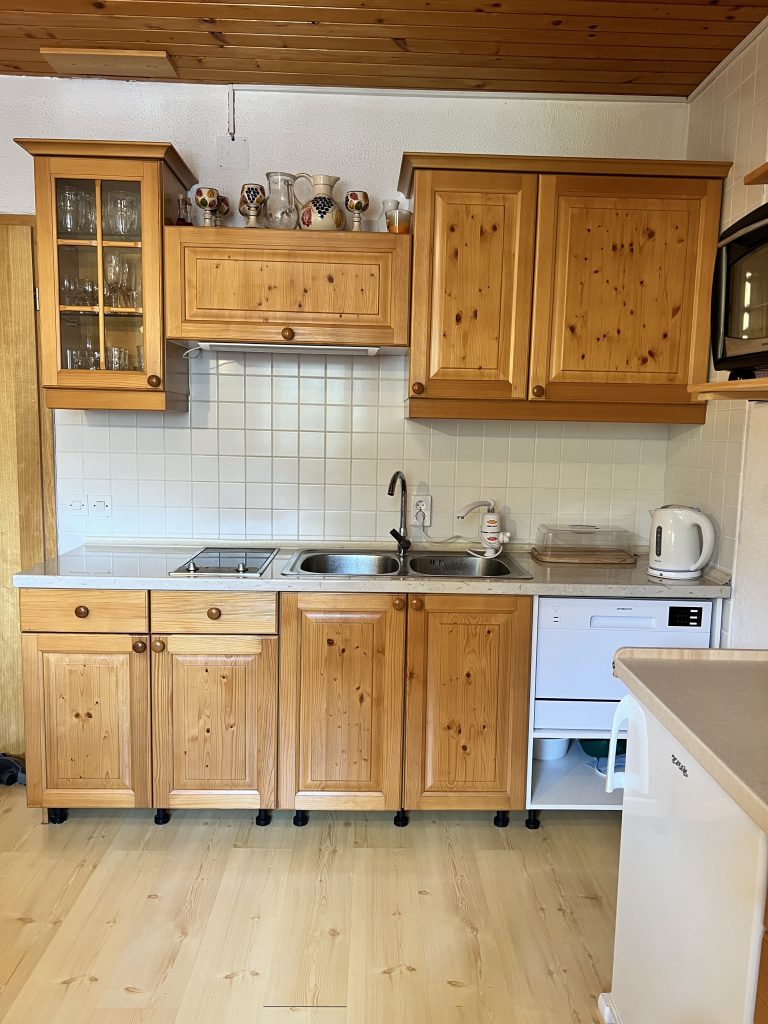 V apartmaju se nahaja prijeten dnevni prostor s kuhinjo in jedilnim kotom, ter dve spalnici. Prva spalnica je opremljena z zakonsko posteljo, druga pa z dvema enojnima posteljama, kar zagotavlja udobno namestitev za vse goste. Kuhinja je polno opremljena z vsemi potrebnimi pripomočki, vključno s kuhalno ploščo, pečico, mikrovalovko, hladilnikom, toasterjem in pomivalnim strojem, kar vam omogoča enostavno pripravo obrokov med bivanjem.