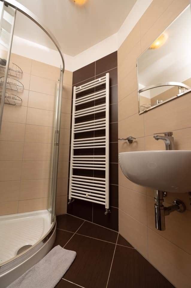 Zgornji apartma ima dve spalnice in raztegljiv kavč, tako da lahko prespi šest oseb.