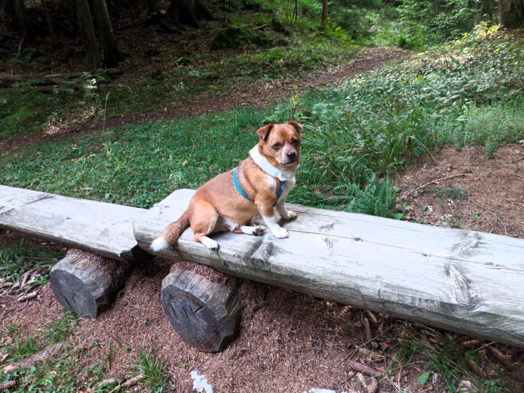 Partizanska bolnica na Mežakli s psom je naš pogost pohod. Ker smo doma blizu, ne rabimo avta.