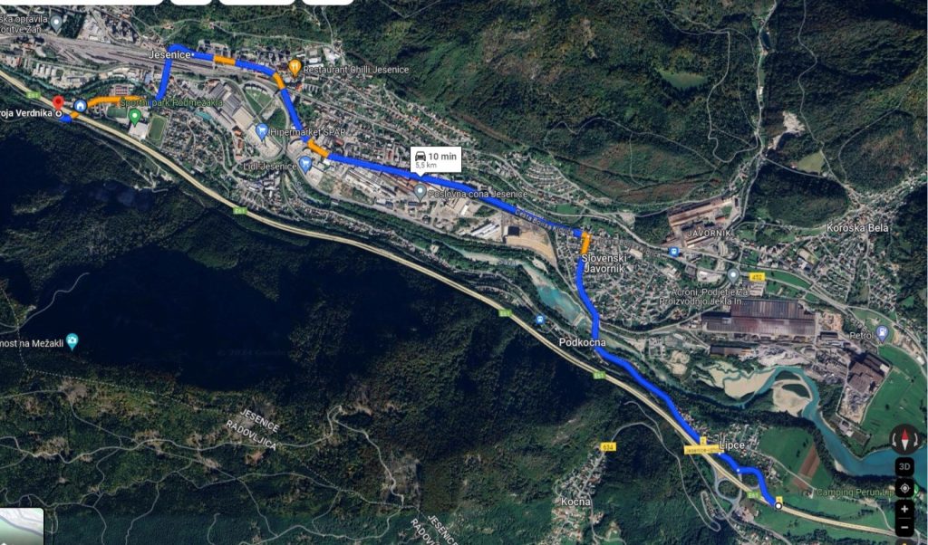 Za boljšo predstavo dodajam Google maps zajem zaslona, ki prikazuje pot od izvoza iz avtoceste do parkirišča.
