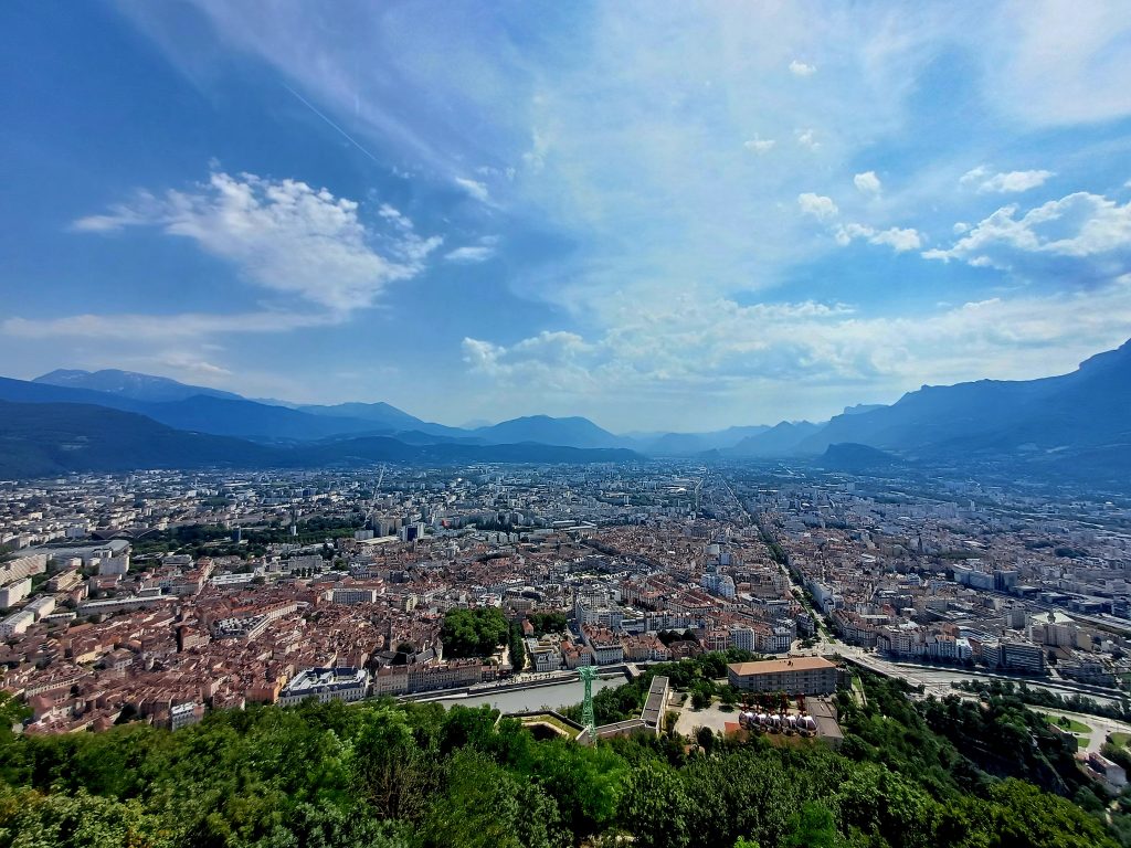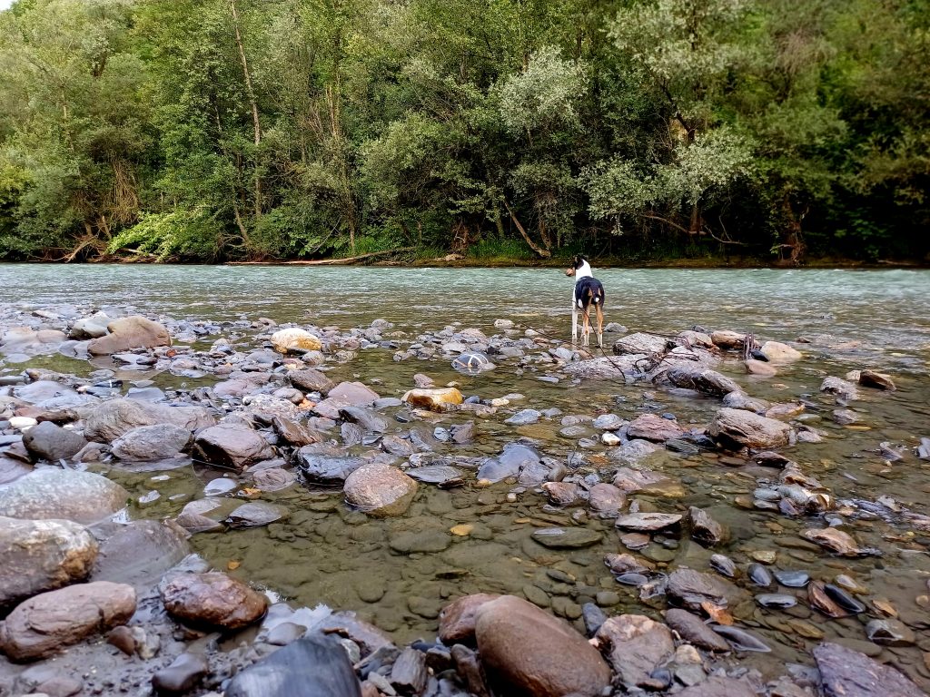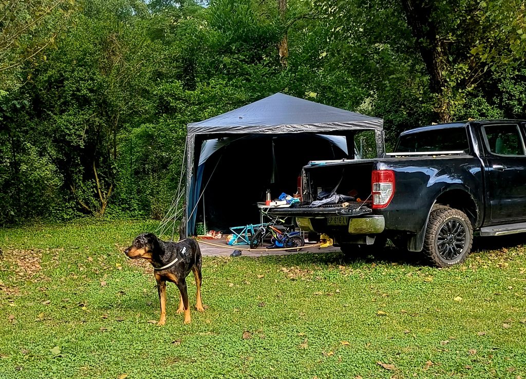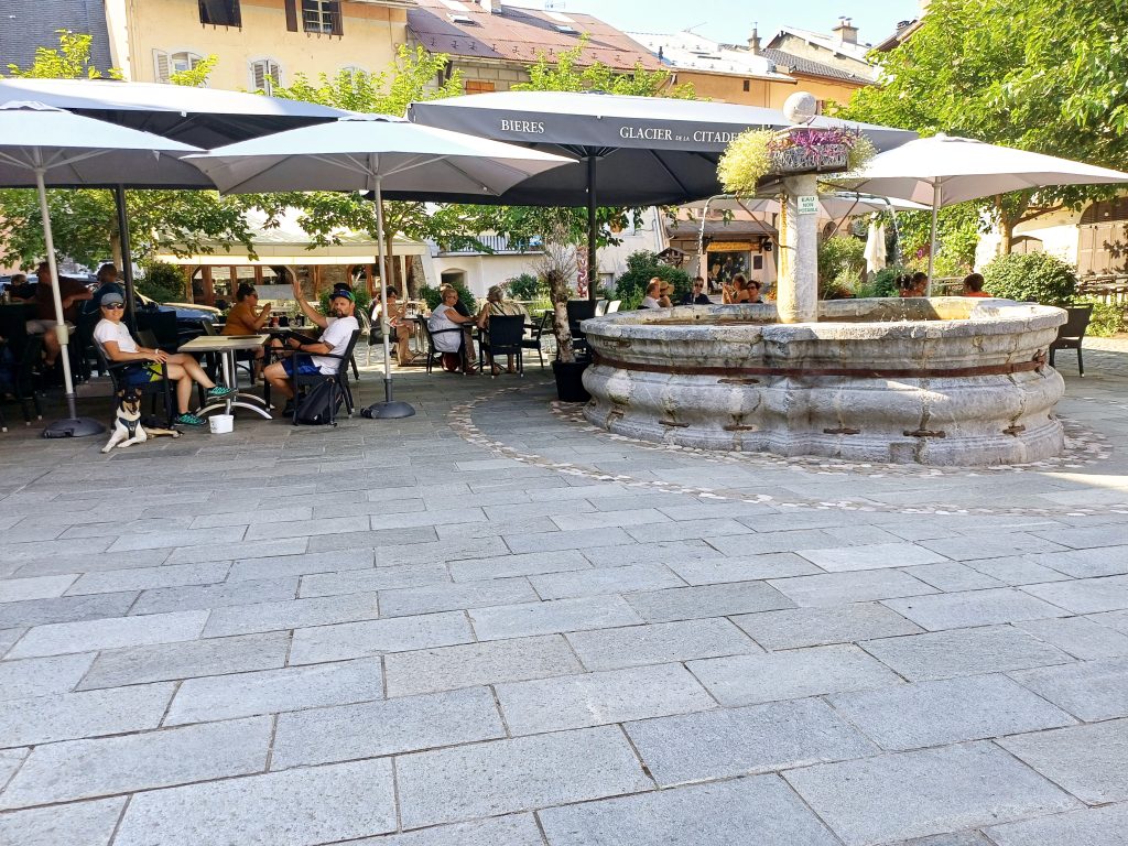 Naš načrt je bil spati nekaj dni v Annecyu ob jezeru, ampak smo ugotovili, da je čisto preveč gneče za naš okus (masovni turizem), zato smo poiskali najbližji prost kamp in po naključju pristali v Albertvillu. Albertville je mesto v francoskih alpah, znan po zimskih olimpijskih igrah leta 1992. Zraven je čudovito staro srednjeveško mesto Conflans. Našli smo lep kamp s top lokacijo ob reki in čisto zraven starega mestnega jedra, z urejeno pešpotjo, Camping des Adoubes – Onlycamp. Zjutraj si šel lahko takoj iz kampa na super sprehod, spuščeni psi niso nikogar motili. Mars se je ujel s sosedovim kužkom beauceronom Noetom in na vsake toliko smo ju spustili, da sta se poigrala.