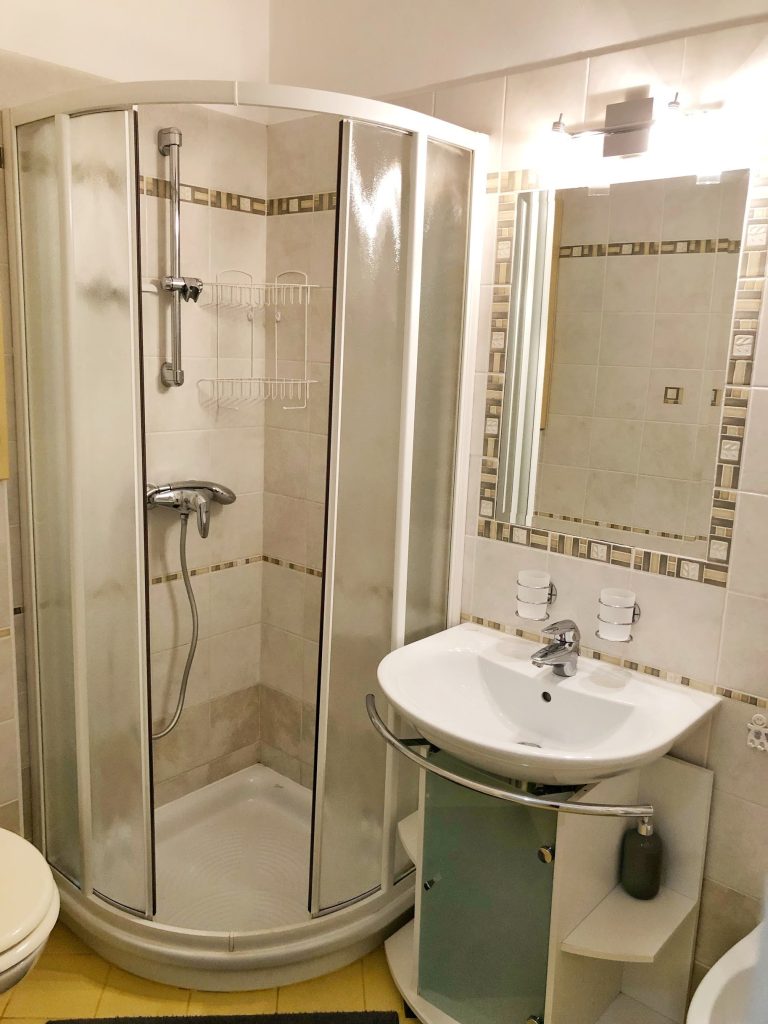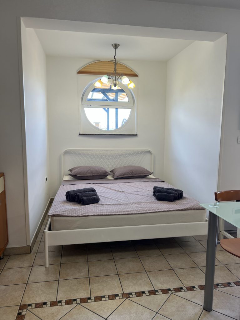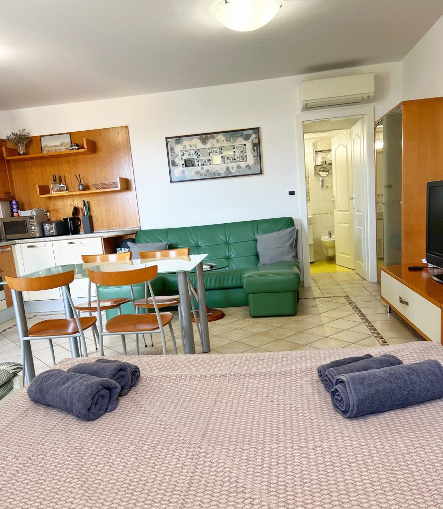 Studio ima popolnoma opremljeno kuhinjo, notranjo in zunanjo jedilnico z žarom, mikrovalovno pečico, pečico, hladilnikom in pomivalnim strojem. V odprtem prostoru s spalnico in kavčem je kopalnica, garderoba, pralni stroj, likalnik, sušilnik za lase, klima, TV in WIFI. Kavč se lahko raztegne v posteljo, primerno za otroke. Garsonjera je primerna za pare, poslovne potnike, manjše družine, itd. Posteljnina in brisače so vključene.