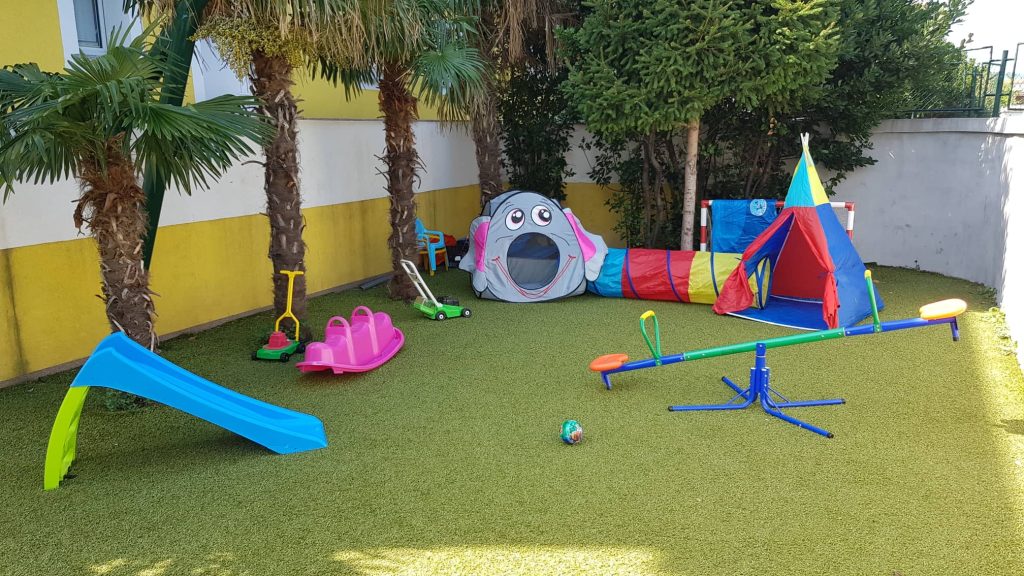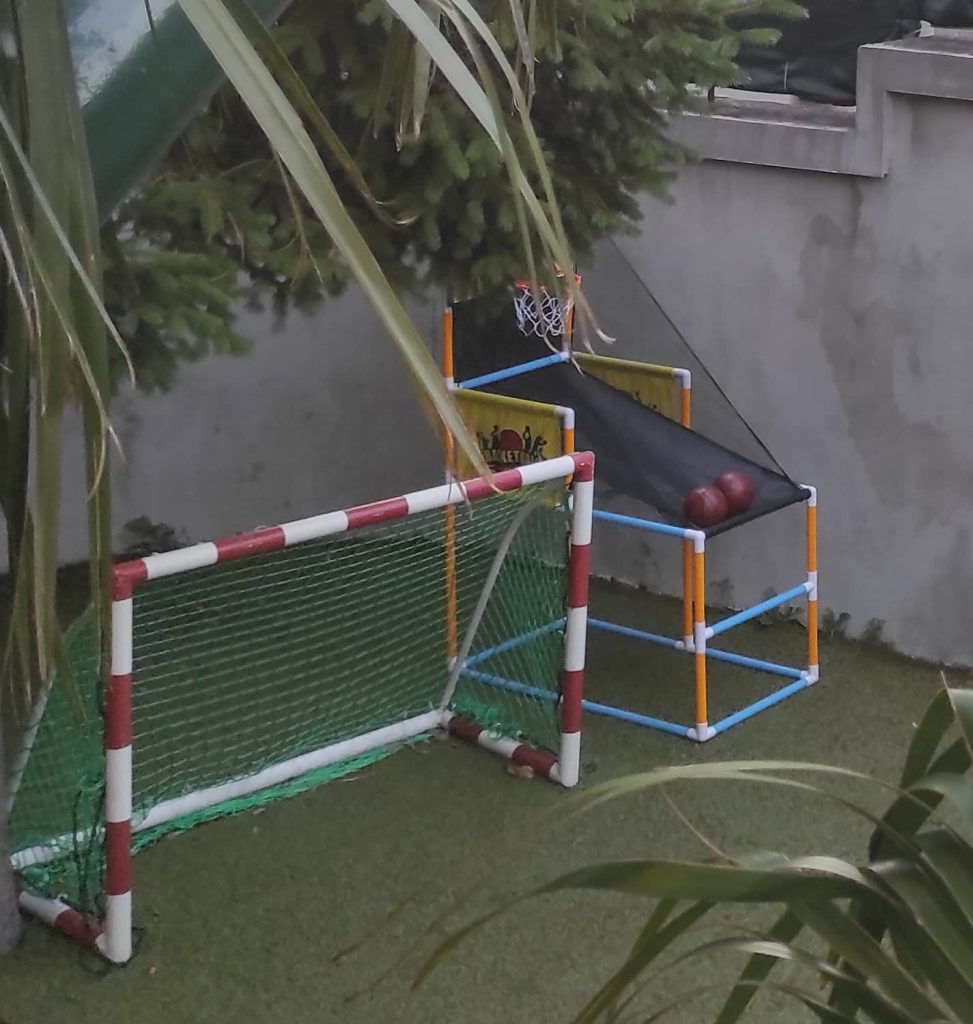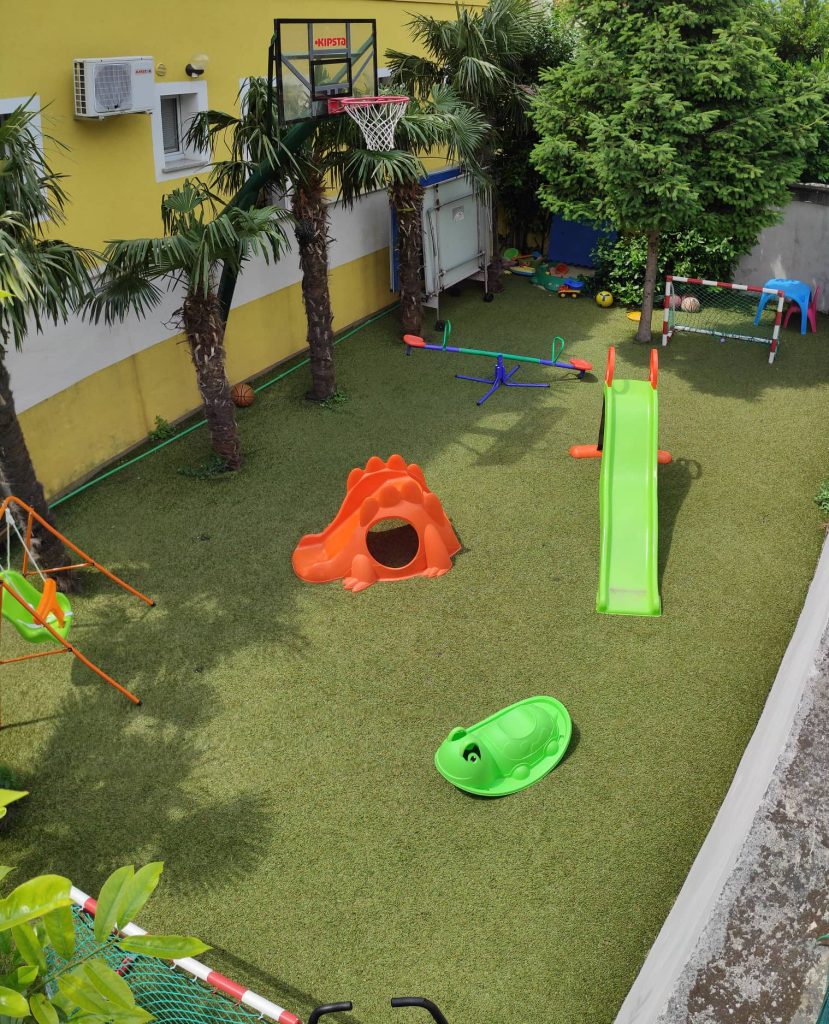 Stanovanju M3 pripada tudi zasebni del dvorišča z igriščem za nogomet, košarko, badminton, peskovnikom in gugalnico, na katerega se lahko dostopa direktno s sprednje terase stanovanja. Apartma sprejme 2-3 psa oziroma po dogovoru z lastnico.