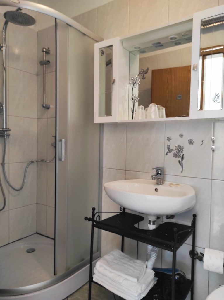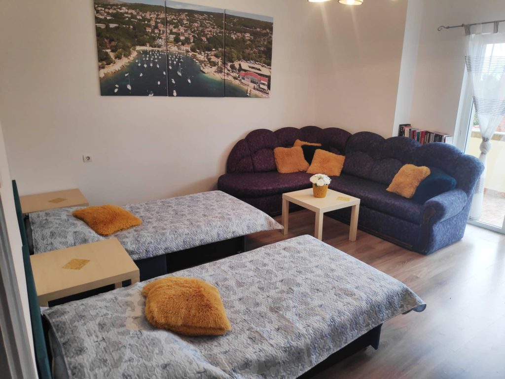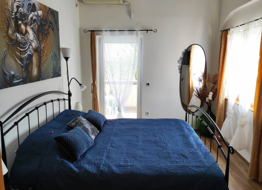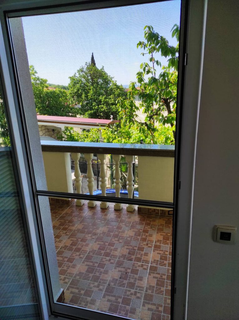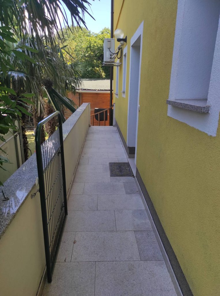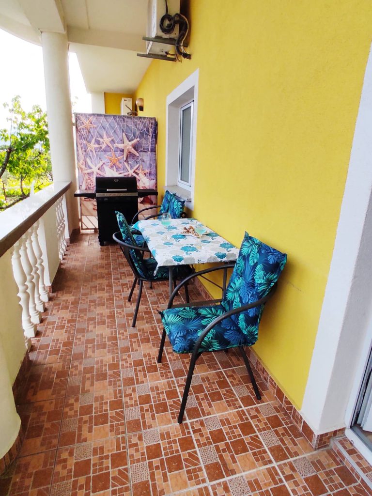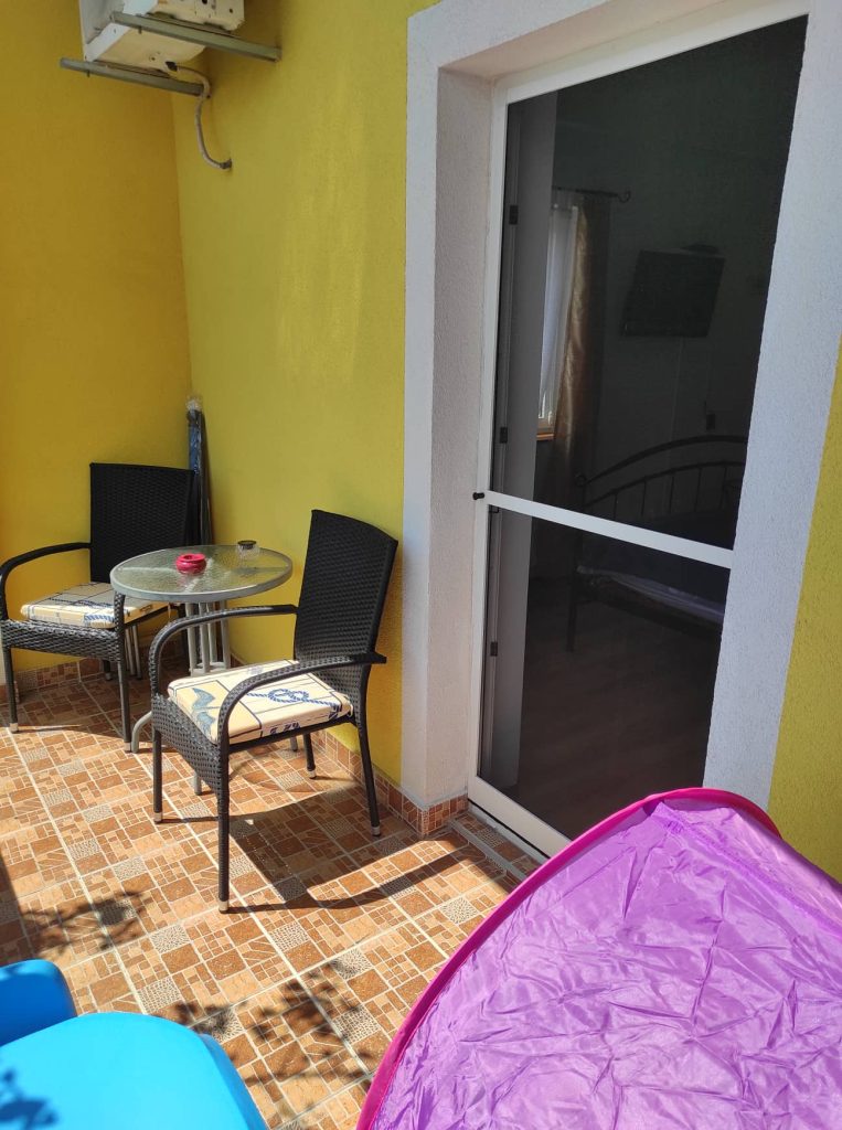 Apartma M1: studio apartma za dve osebi se nahaja v prvem nadstropju in obsega predprostor s kuhinjo, kopalnico, spalnico z zakonsko posteljo + po potrebi otroško posteljico in prostorno teraso s pogledom na morje in vrt. Opremljen je s klimatsko napravo, satelitsko televizijo, aparatom za kavo in pralnim strojem. Skupna površina je 29 m2. Ima lastno ograjeno teraso, kar je odlično za pse. Sprejme enega psa, oziroma več po dogovoru. Lastnica je zelo prijazna.