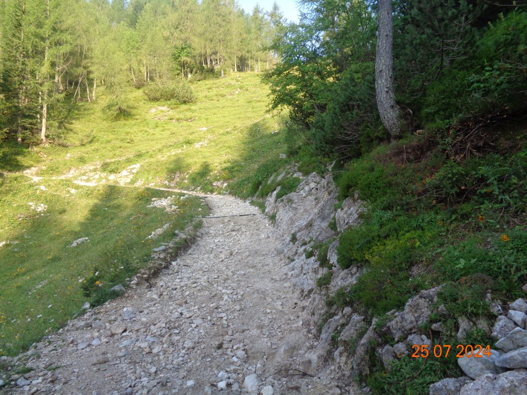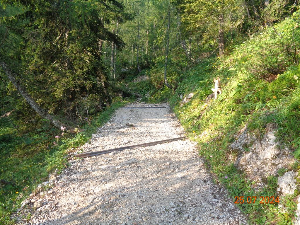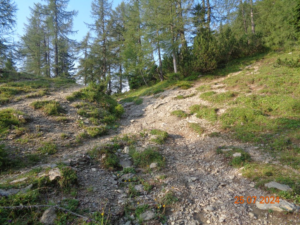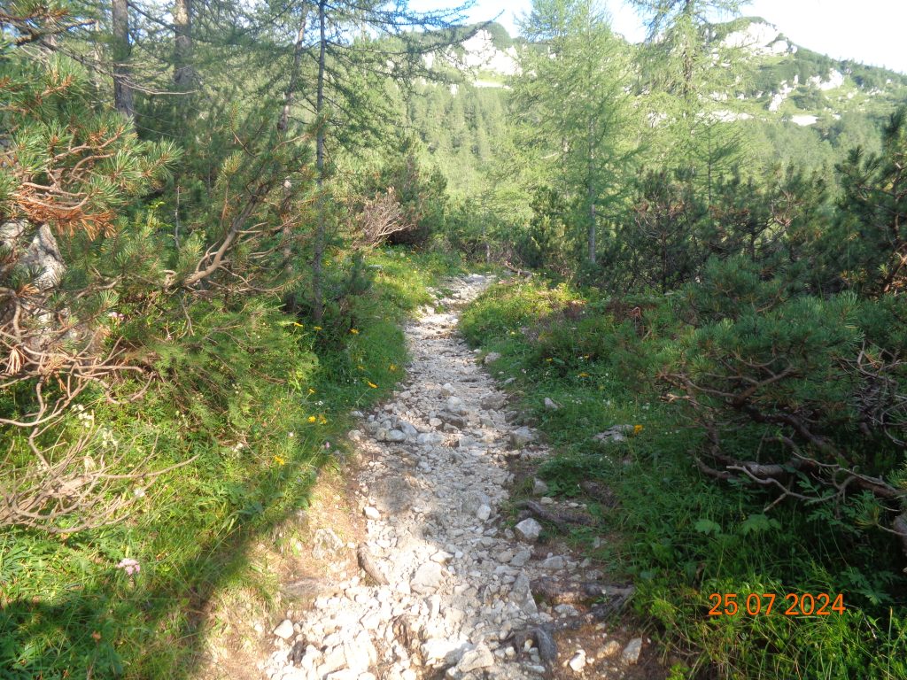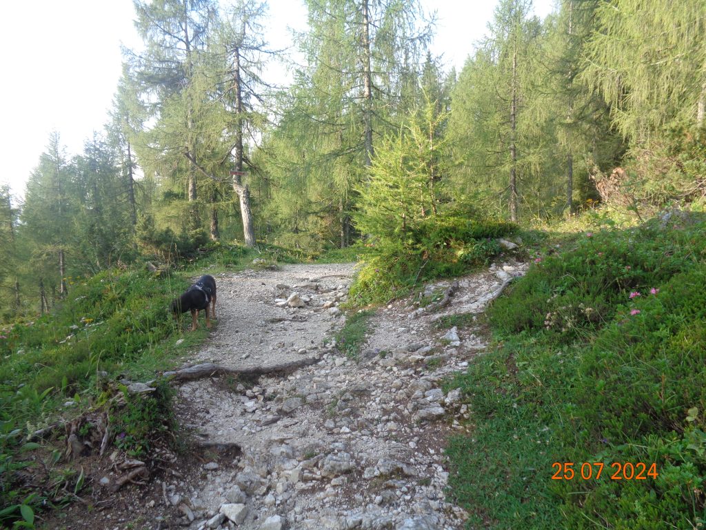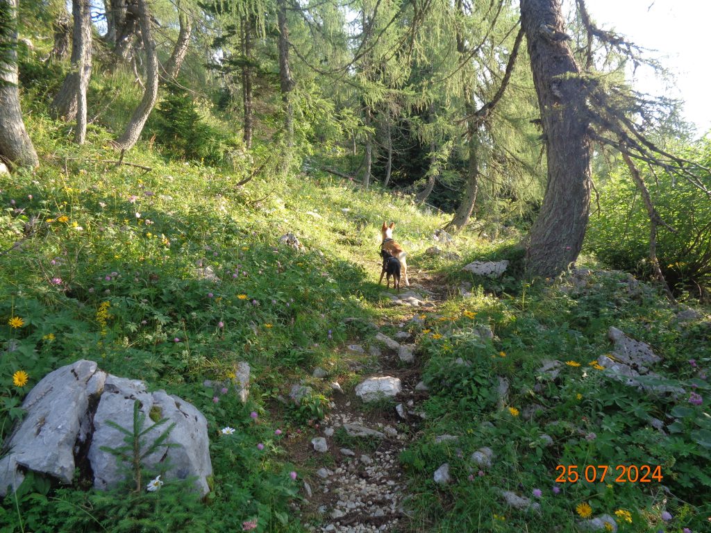 Zmerno strma pot nas je potem po krajšem vzponu pripeljala do naslednjega razpotja, kjer smo nadaljevale v smeri Viševnika. Desno je bila pot na Mrežce (strma pot).