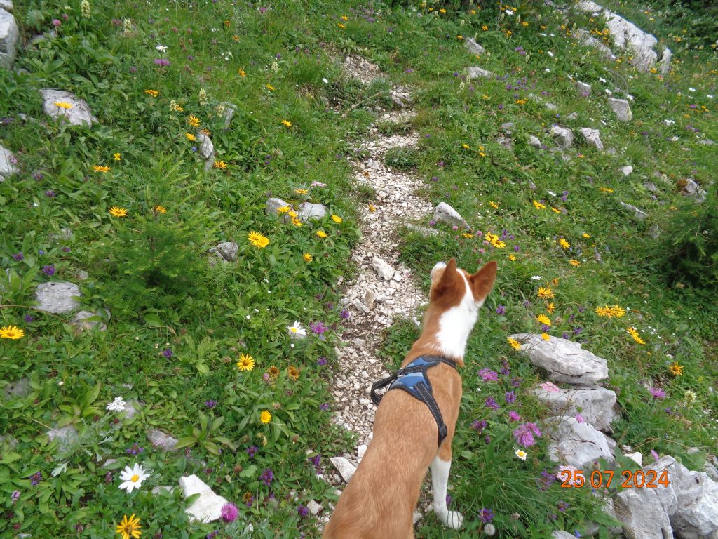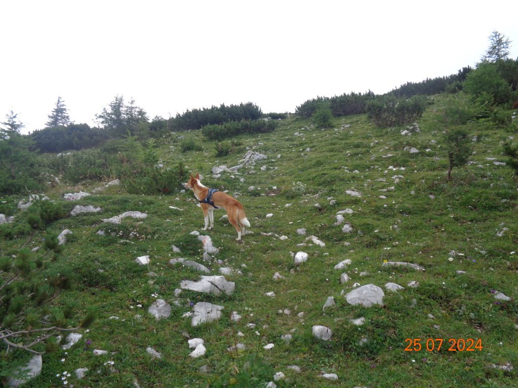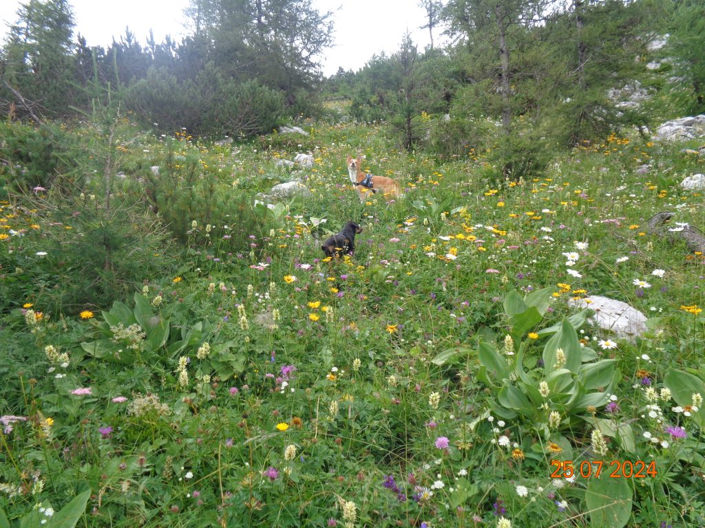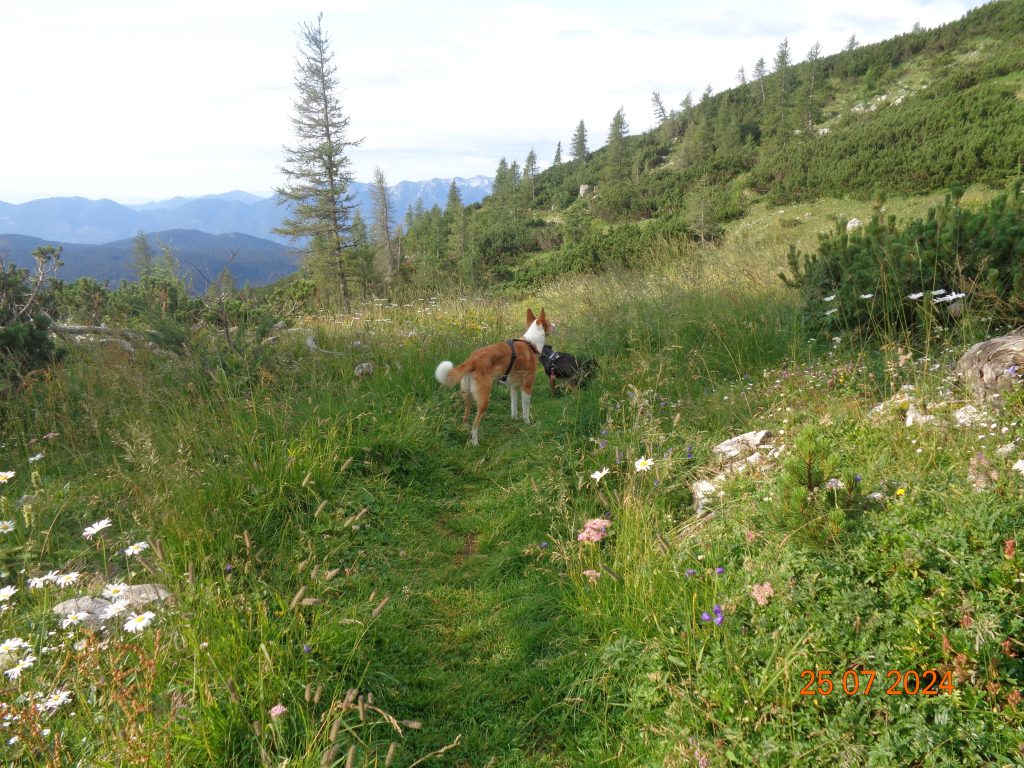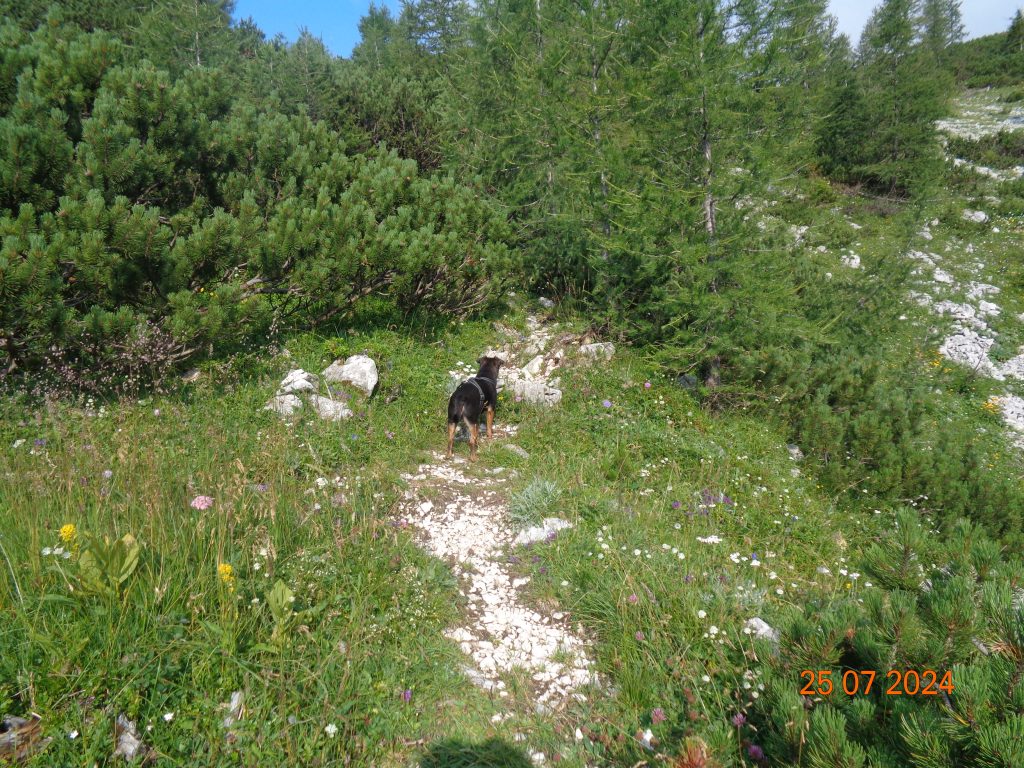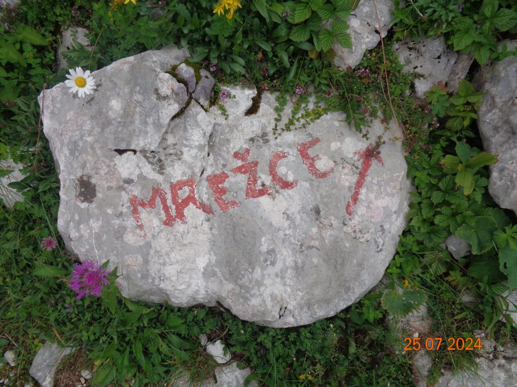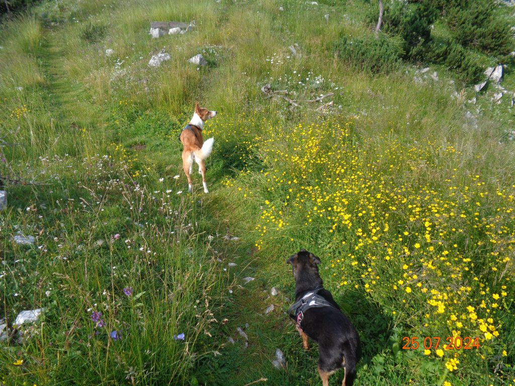 Odločila sem se, da gremo še na Mrežce. Vrnile smo se do razpotja za Mrežce, kjer smo nadaljevale levo. Pot se je zmerno vzpenjala najprej po travnatem pobočju. Bila je težko sledljiva in spet sem popolnoma zaupala Gaji in Kani, ki sta ji pravilno sledili.