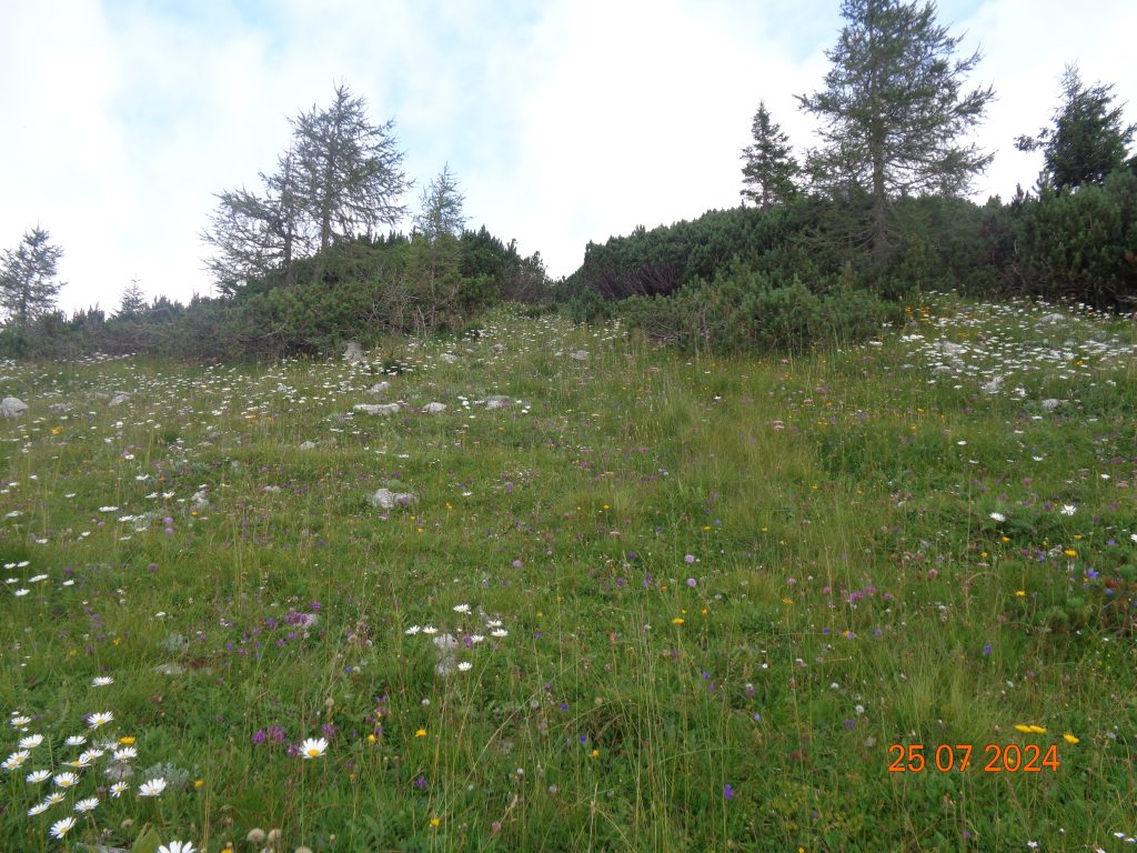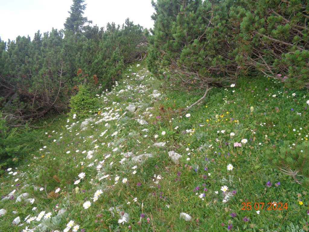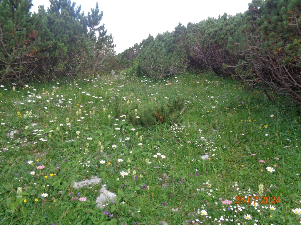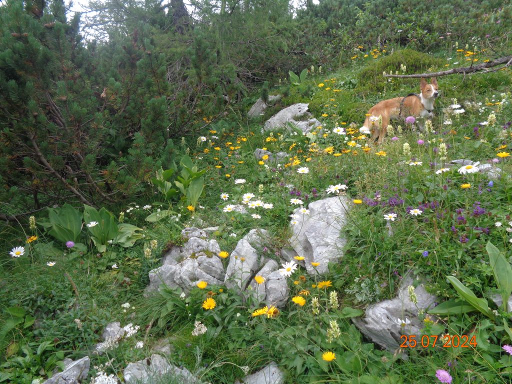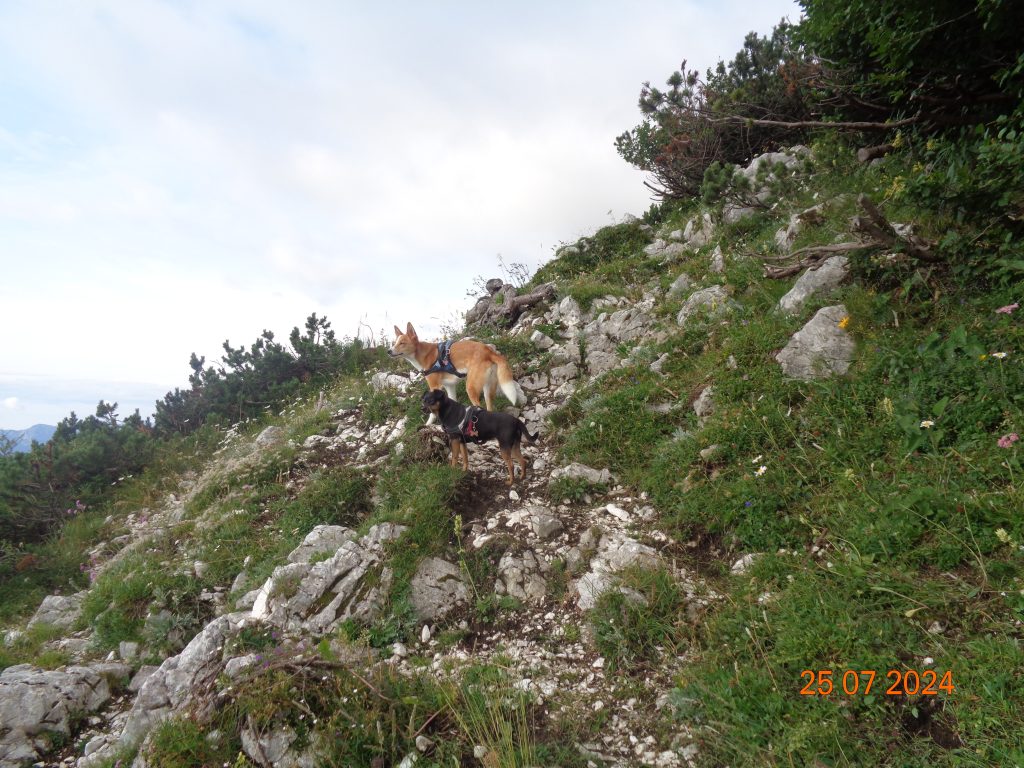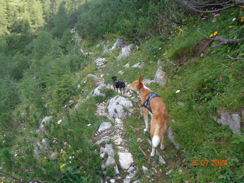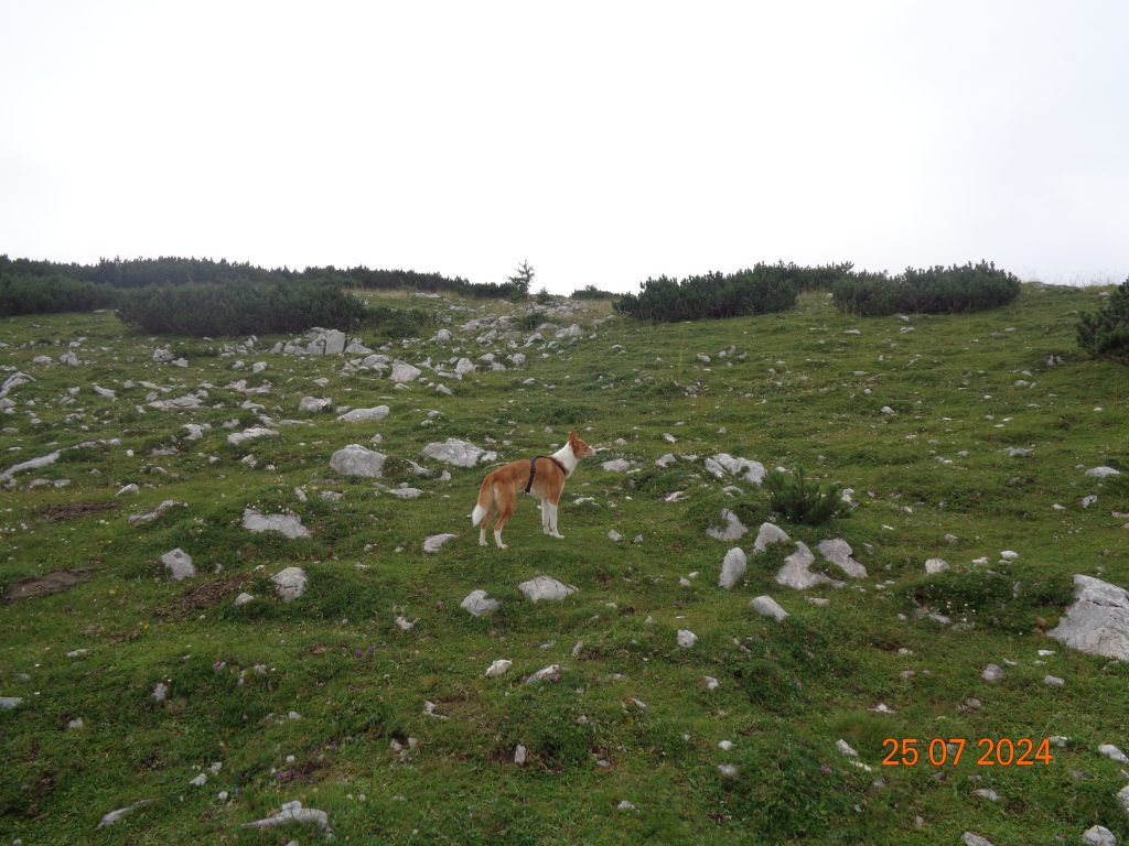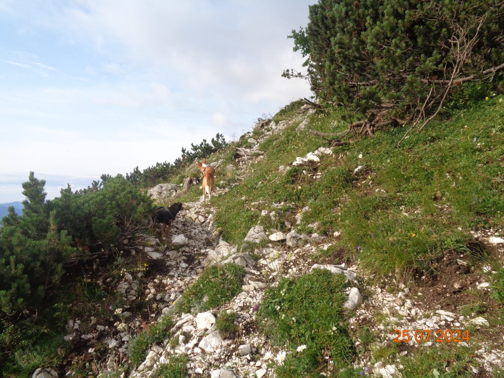 Odločila sem se, da gremo še na Mrežce. Vrnile smo se do razpotja za Mrežce, kjer smo nadaljevale levo. Pot se je zmerno vzpenjala najprej po travnatem pobočju. Bila je težko sledljiva in spet sem popolnoma zaupala Gaji in Kani, ki sta ji pravilno sledili.