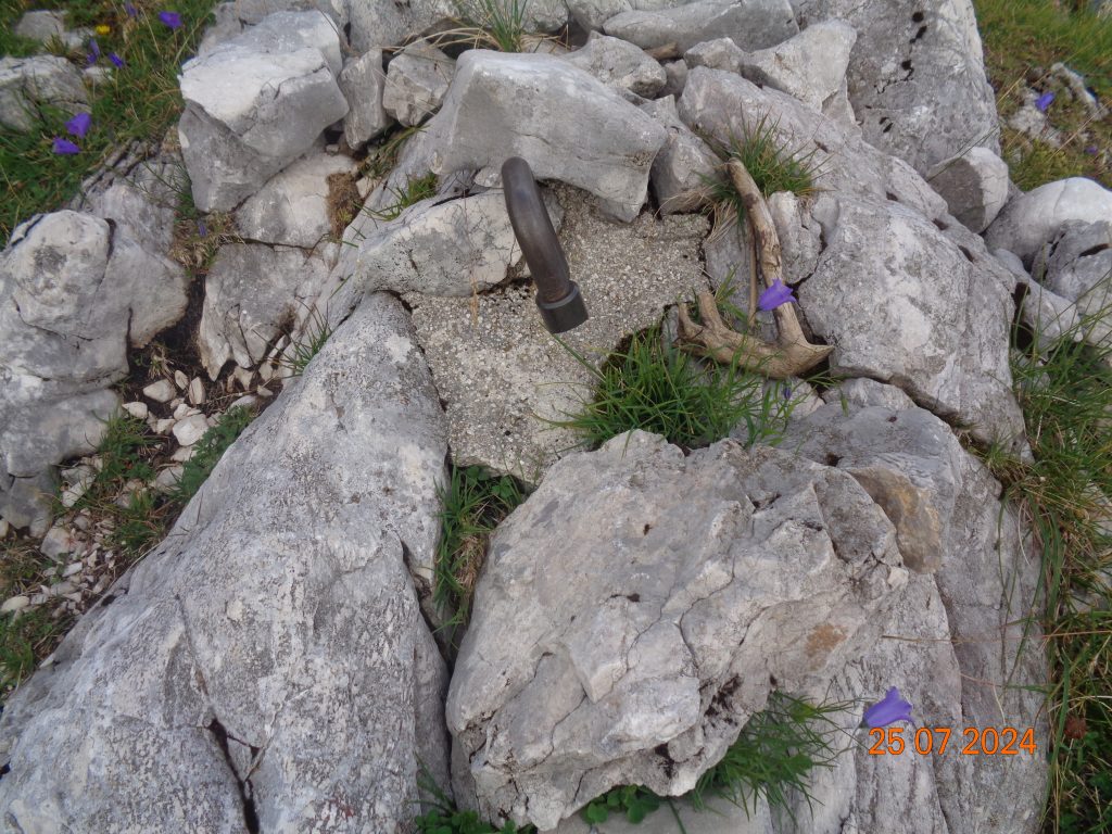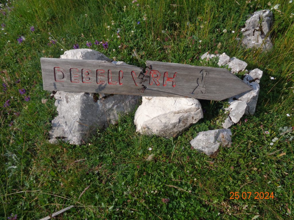 Pot nas je nato pripeljala na travnato pobočje, kjer je bilo malenkost lažje slediti markacijam oziroma rdečim črtam na skalah. Hodile pa smo po sredini.