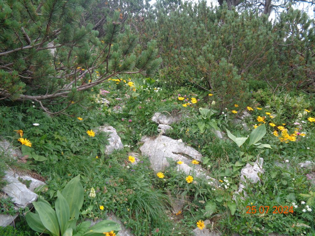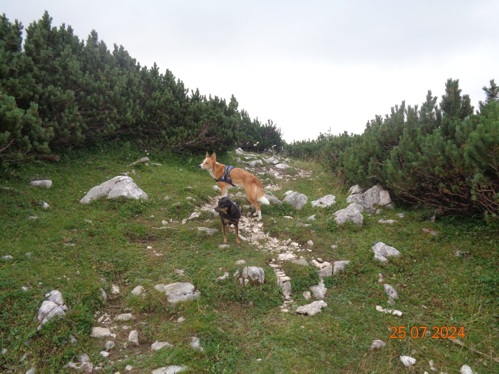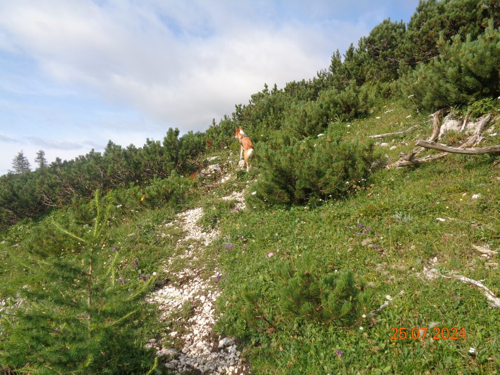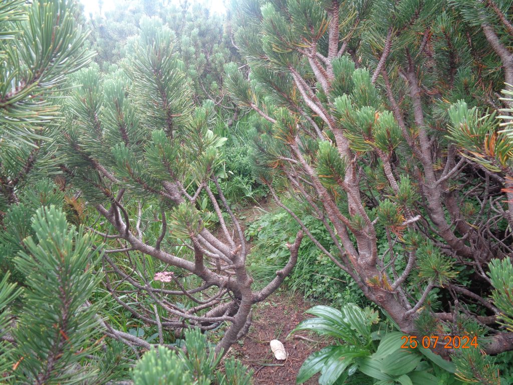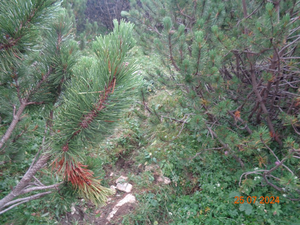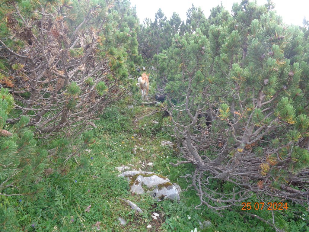 Višje smo prišle v pas borovcev, kjer je bilo pot še dosti težje slediti, kot v spodnjem delu. Bil je pravi robinzonski podvig, da smo se prebile čez ta pas. Sledila sem Gaji in Kani, saj markacij na tem delu nisem videla.