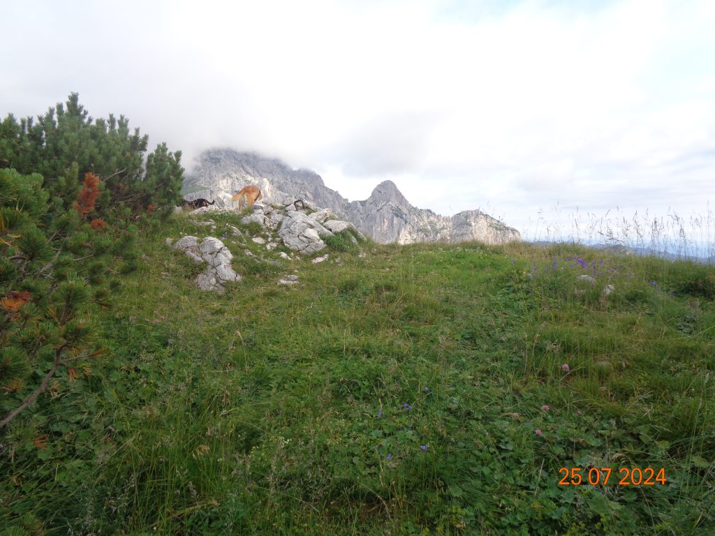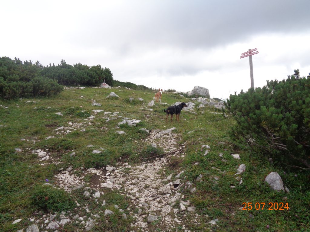 Gaja in Kana sta me pripeljali na pot, ki je vodila na vrh in sicer po krajšem vzponu po travnatem pobočju, ki je bilo obdano z rušjem. Na vrhu je bil žig. Žal razgledi niso bili najlepši, ker se je oblačilo.