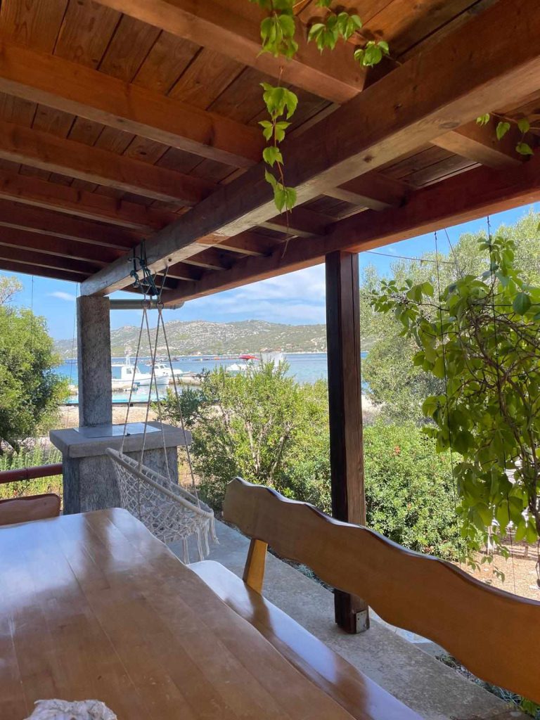 V kuhinji in kopalnici je napeljana tekoča hladna voda. Zunanji tuš je opremljen s črno posodo (sončna toplota segreva vodo v posodi). Tukaj je treba zmerno uporabljati elektriko in vodo. Hiša ima dve terasi: ena je pred hišo s pogledom na morje, druga pa se nahaja za hišo, kjer imate na voljo tudi zunanji žar.