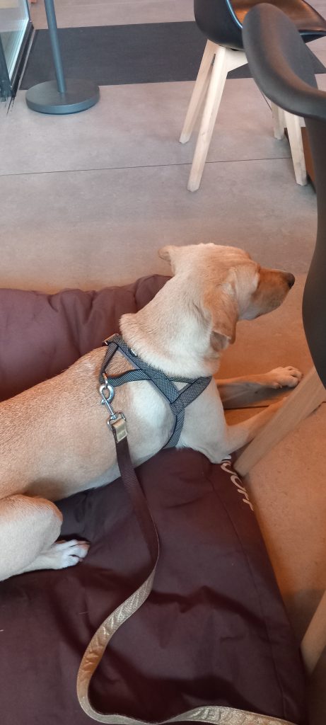 No, med čakanjem na hrano je Tedi kljub udobni blazini začel cviliti. Nekaj mu je manjkalo. Skočila sva ven (na kratko, čez njihovo lepo, pokrito teraso). Mislila sem, da ga tišči, da mora na malo potrebo, a namesto tega je poskusil piti vodo iz luže. Potem mi je postalo jasno, joj, seveda, žejen je, saj je zjutraj v naglici pakiranja dobil pelete namesto običajne kuhane hrane. Hitro sva se vrnila notri, in Tedi je spil celo skledo dobre gorenjske vode (zložljiva posodica je vedno v torbici, razen kadar pozabim). On je sicer pes, ki živi skoraj brez pitja. Po tem smo lahko še naprej uživali v dobri hrani in prijetnem ambientu. Kmalu je v lokal prišel še en velik črn labradorec, ki pa se je moral ‘zadovoljiti’ z ležanjem na tleh, saj veste, kdor prvi pride, prvi melje.