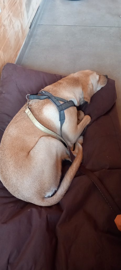 V hudem nalivu sem sprva pustila Tedija v avtu, a ker se ne morem sprostiti, če pes ni z mano, sem ga kmalu šla iskat, ko je naliv nekoliko popustil. Ganilo me je, da je natakarica, potem ko ga je prijazno in ljubeznivo pozdravila, takoj prinesla veliko, lepo in udobno pasjo blazino. Tedi se je nanjo takoj udobno namestil in počival, medtem ko smo se dvonožci mastili z okusnimi rastlinskimi burgerji (s fižolovo polpeto, gobovim burgerjem, tofujevim pohančkom, amaze), falafli, cvetačno juho (ki nas je pogrela), vse skupaj pa poplaknili s craft pivom in domačo kombučo od Ayatana, s katero sodelujejo.