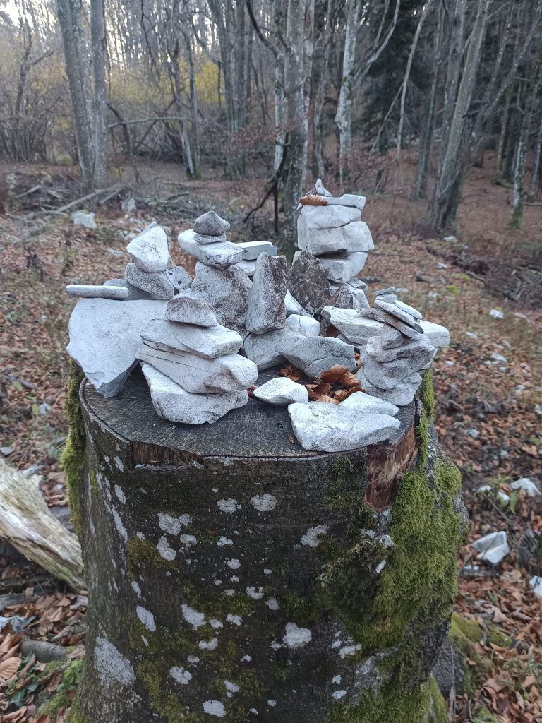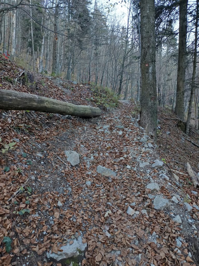 Višje markirana pot zavije levo in se nadaljuje v zmernem vzponu. Ob poti so na desni strani na deblu postavljeni možici.