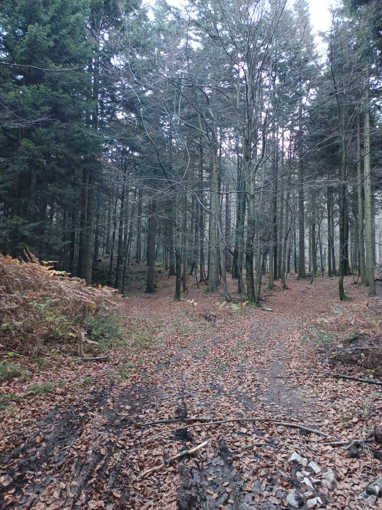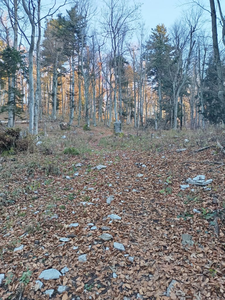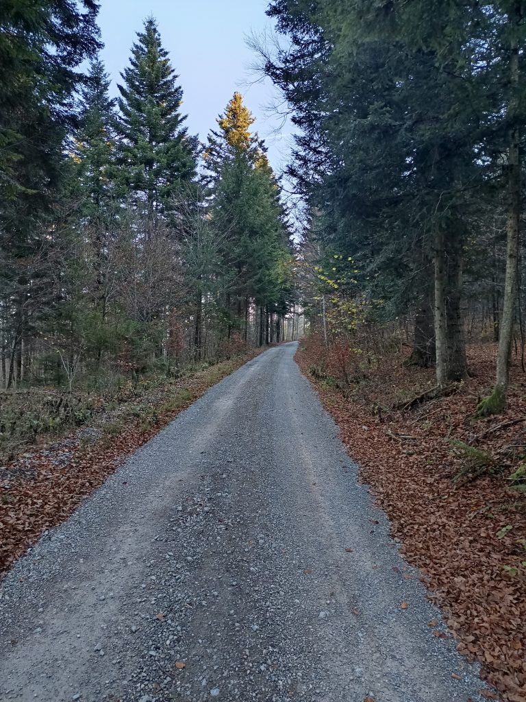 Pot nadaljujemo po cesti, ki se komaj opazno vzpenja skozi gozd. Ko se cesta povsem položi prispemo na nekoliko večje križišče, kjer nadaljujemo naravnost.